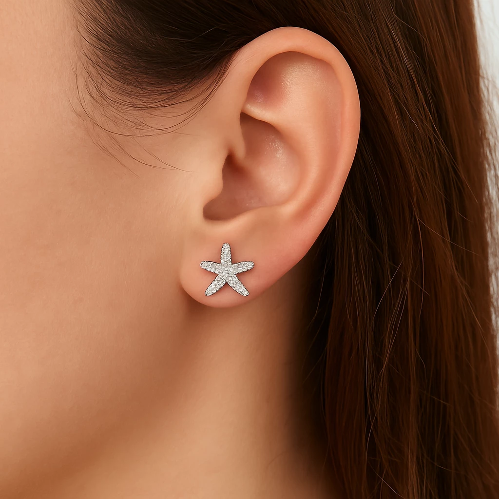 Elegantní stříbrné náušnice s motivem mořské hvězdy vyniknou na Vašem uchu a okouzlí na první pohled. Třpytivý povrch je tvořen jemnými kamínky. Ilustrační foto.
