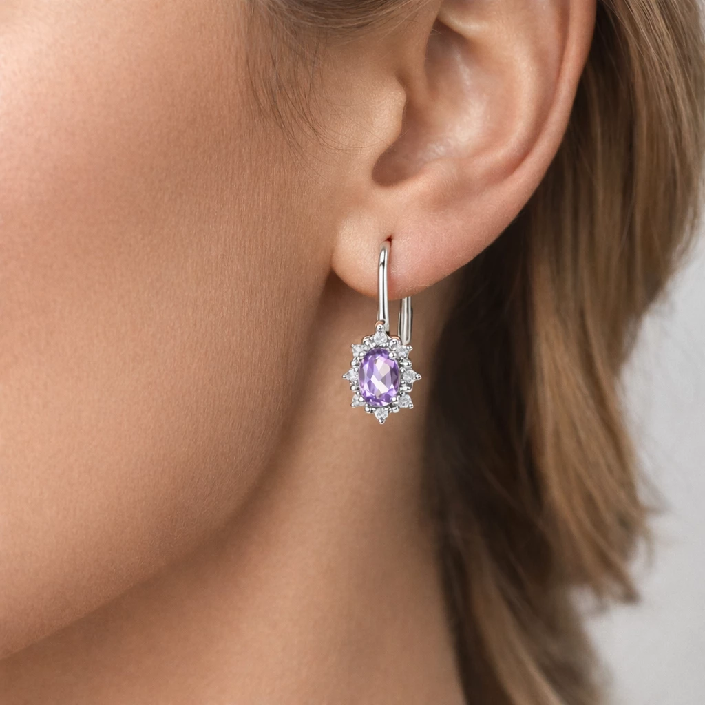 Nádherný ametyst posiluje imunitní systém, přináší klidný spánek a výborně čistí krev. Mějte svůj oblíbený minerál stále při sobě v podobě těchto elegantních stříbrných dámských náušnic.