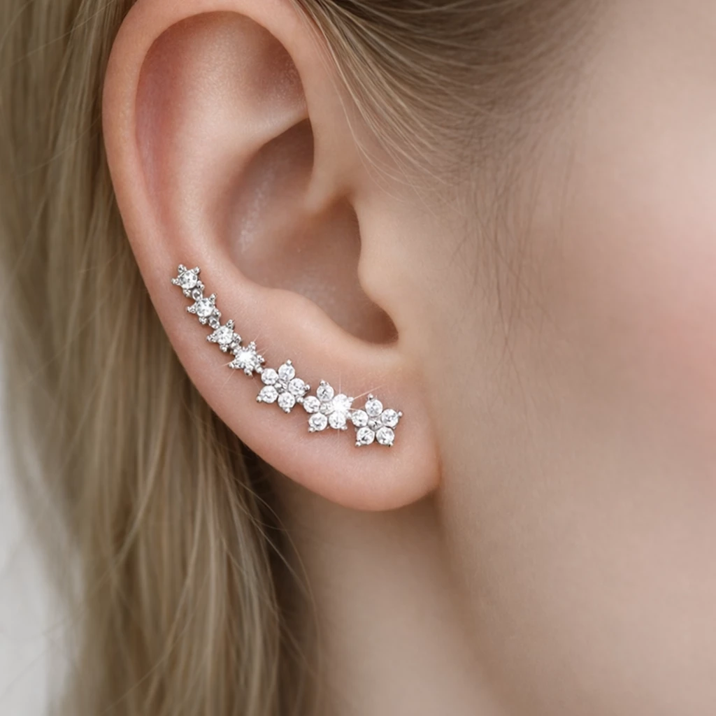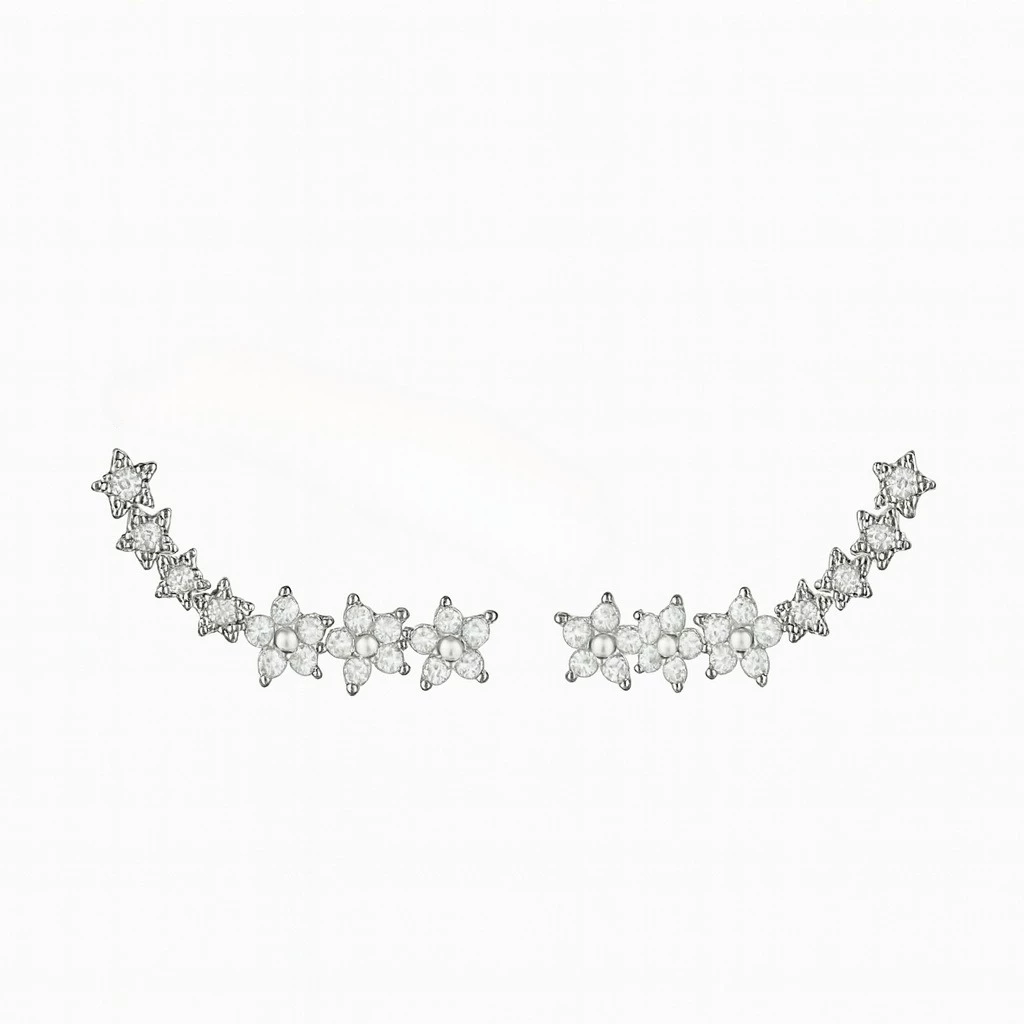 Jemné stříbrné náušnice ve tvaru větvičky osazené třpytivými čirými zirkony krásně kopírují linii ucha a vytvářejí luxusní, přitom stále něžný vzhled. Ideální volba pro speciální příležitosti i slavnostní outfit.