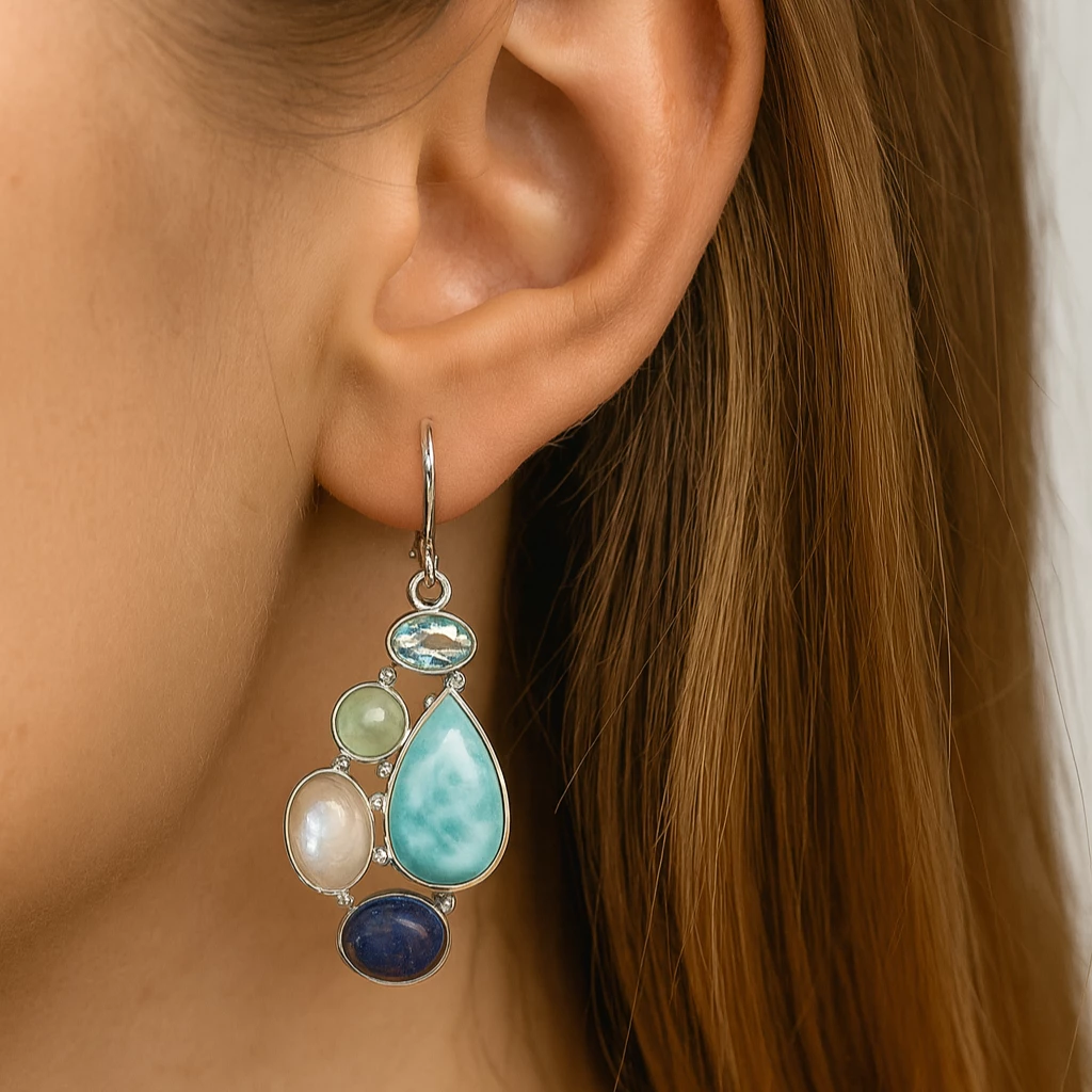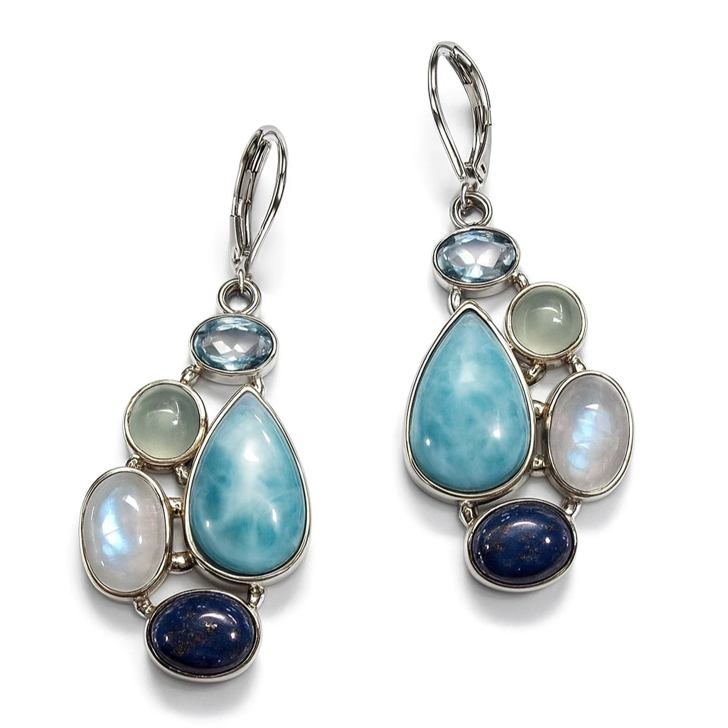 Nádherné stříbrné dámské náušnice s pravým larimarem, měsíčním kamenem, ametystem a lapisem lazuli. Úchvatná kombinace několika léčivých minerálů.