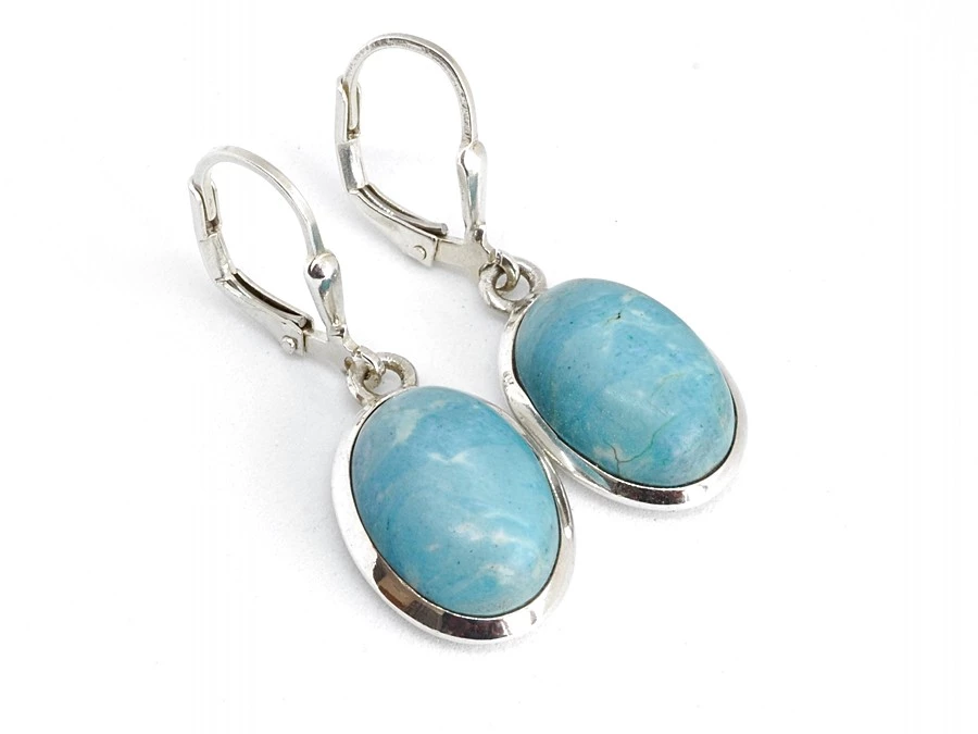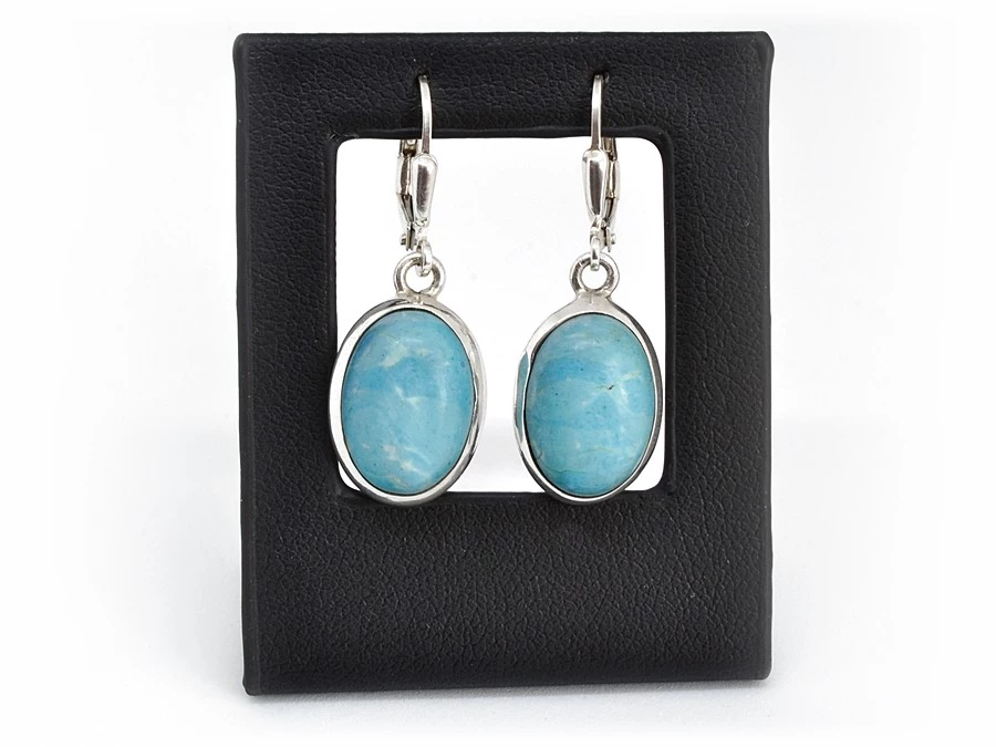 Stříbrné dámské náušnice s léčivým kamenem larimar, který má krásnou modrou barvu. Kámen je precizně vsazený do stříbrného oválného lůžka.