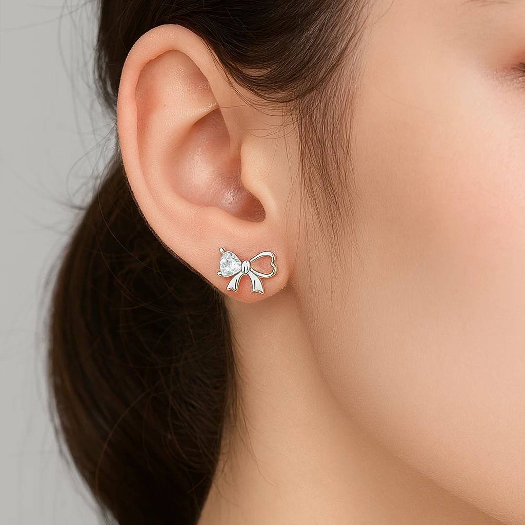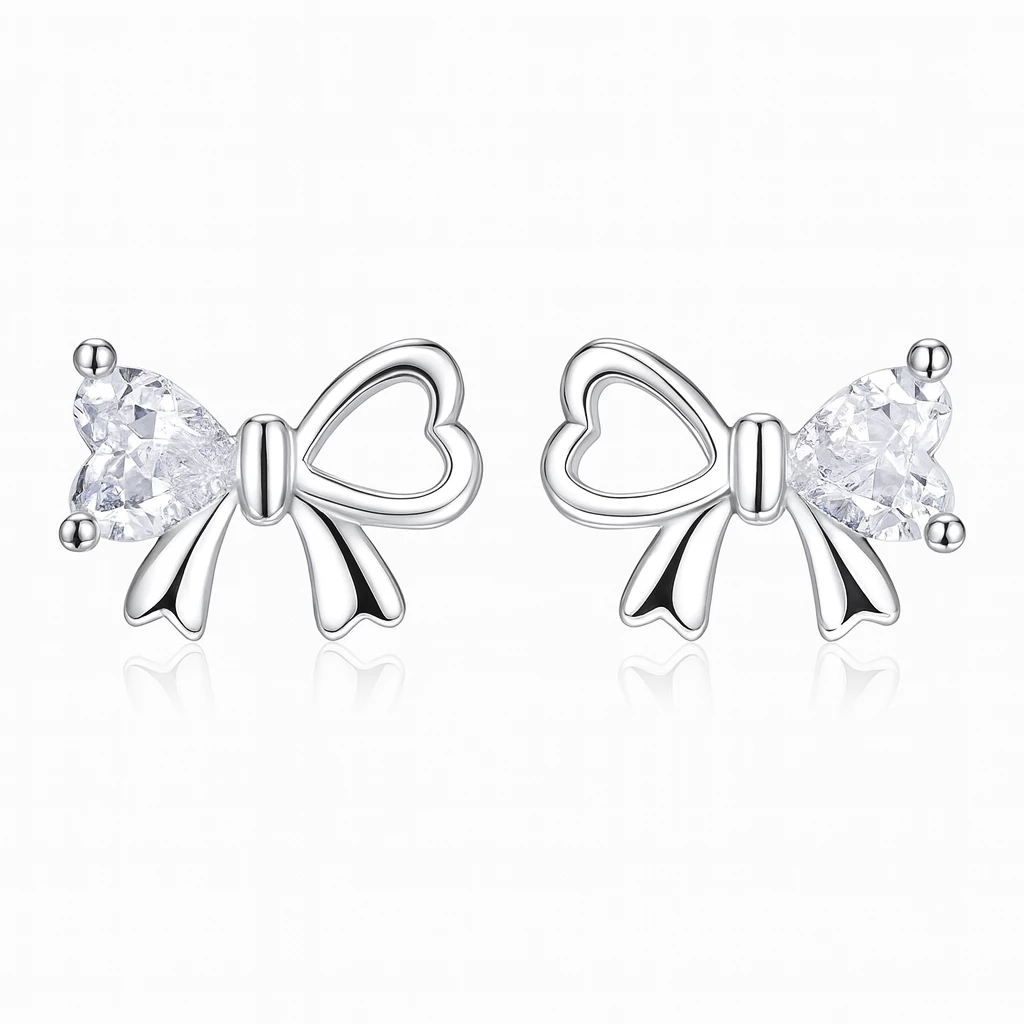 Půvabné minimalistické náušnice s motivem mašličky, která je ve tvaru dvou srdíčkek. Do srdíčka je vložen malý třpytivý zirkon, díky kterému je náušnice jedinečná. Vzhledem k provedení je šperk vhodný i pro malé slečny. Náušnice mají zapínání na puzetu a rhodiovaný povrch, díky kterému je náušnice odolná vůči okolním vlivům a nečerná.