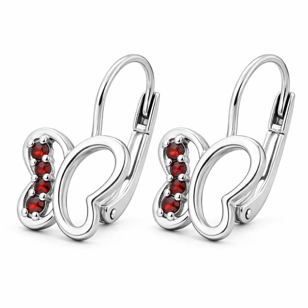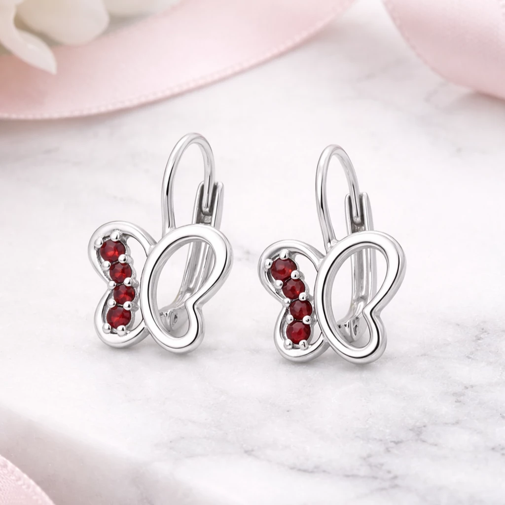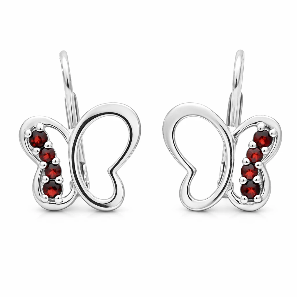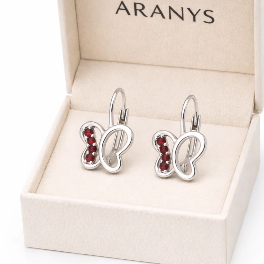 Roztomilé stříbrné dámské náušnice ve tvaru motýla s ozdobeným křídlem kamínky pravého českého granátu osloví především malé slečny.