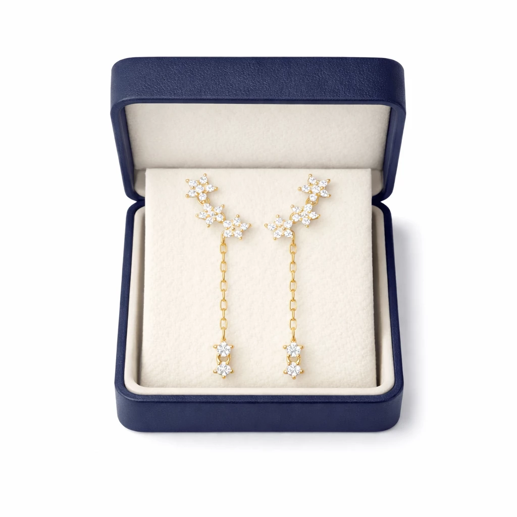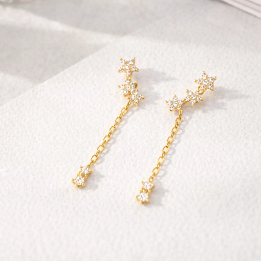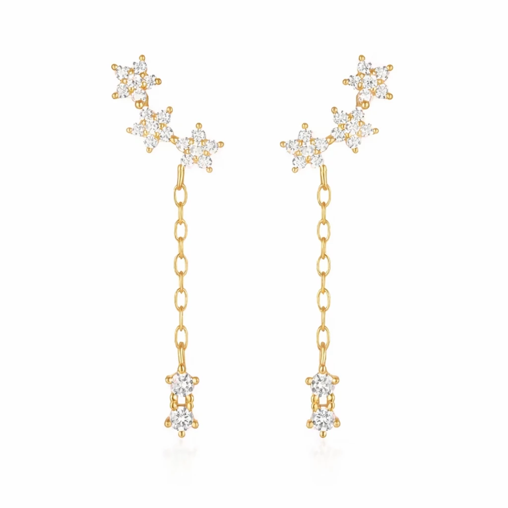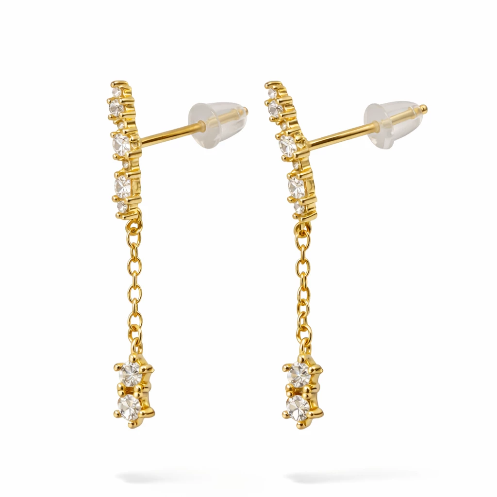 Jemné zlacené stříbrné náušnice se zirkony, které se nádherně třpytí při každém pohybu. Elegantní řetízkové visení a drobný třpytivý detail na konci vytváří luxusní, ale stále minimalistický dojem.