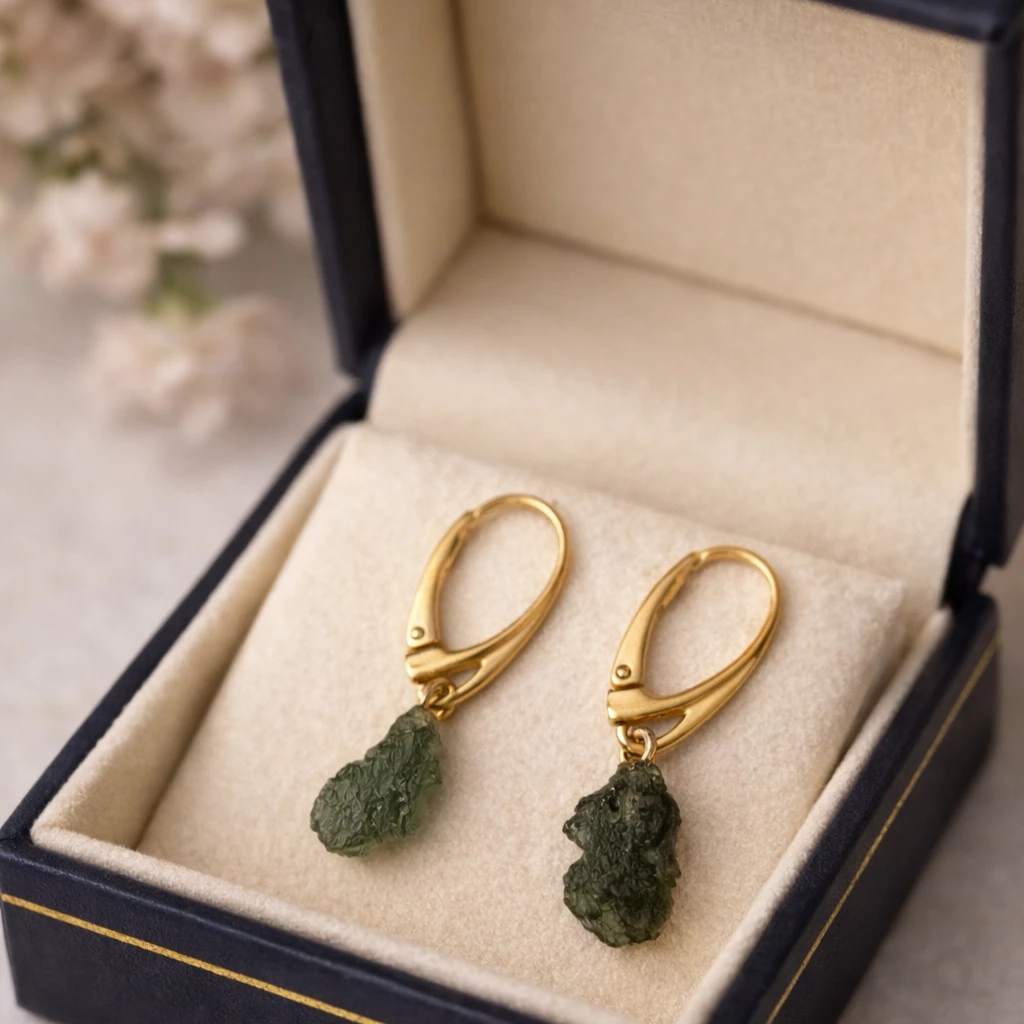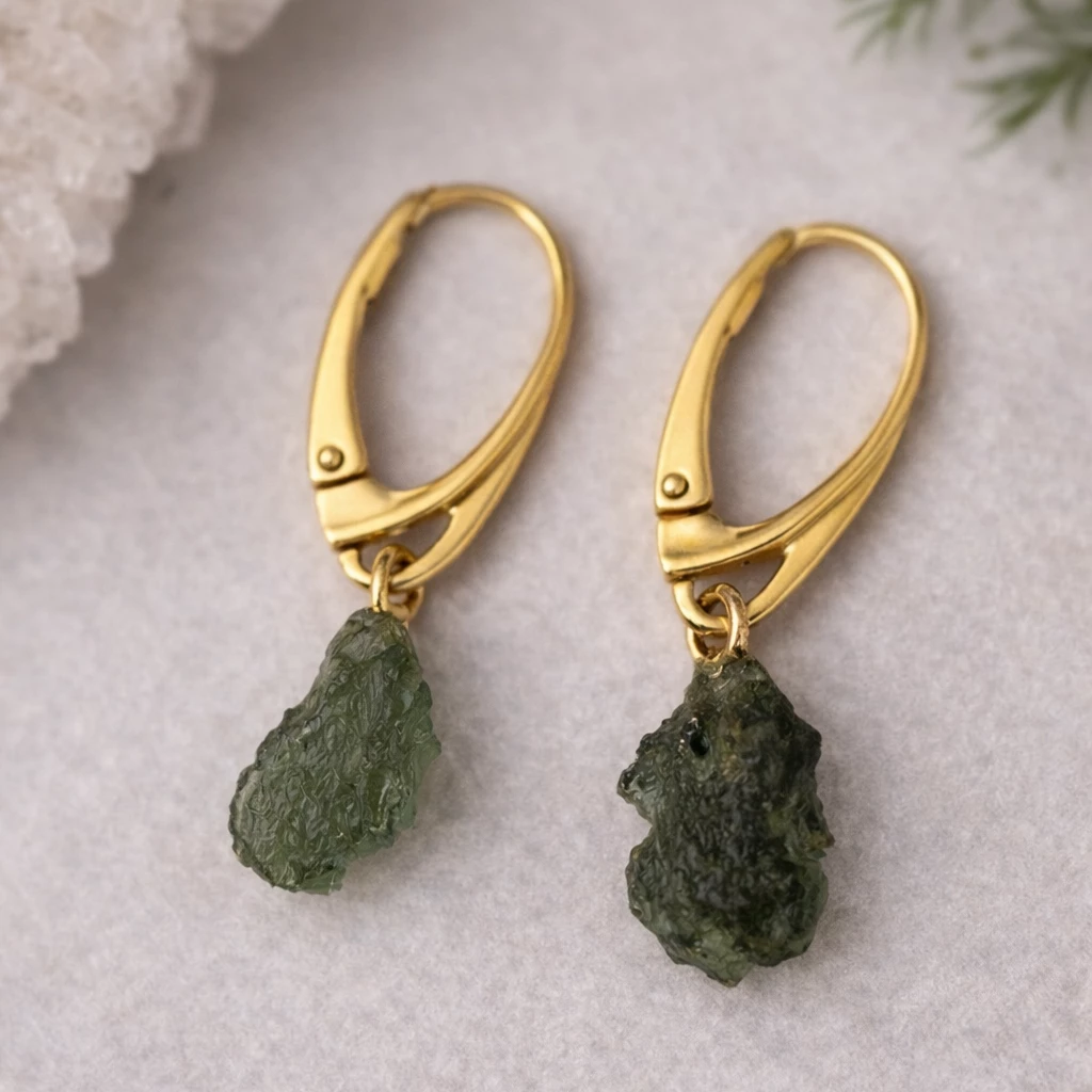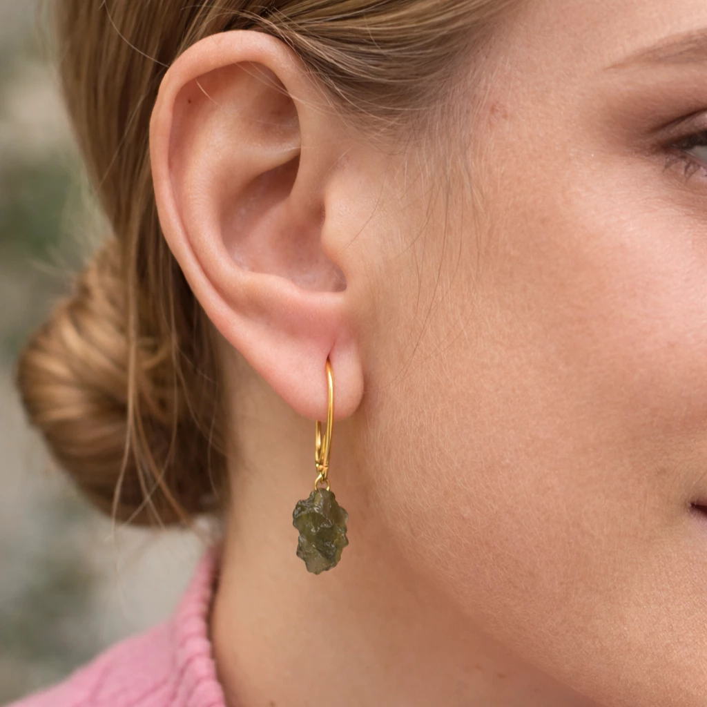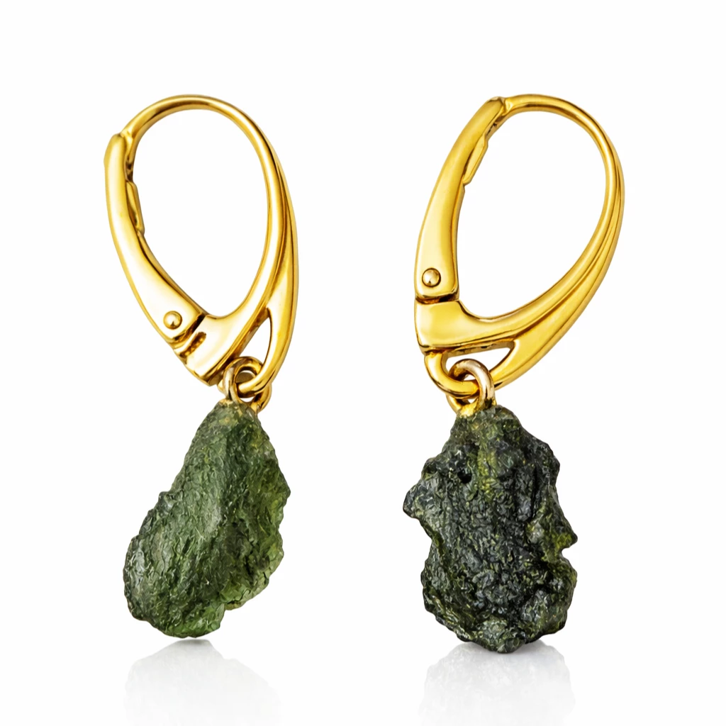 Stříbrné zlacené náušnice se surovým vltavínem z kolekce Velra propojují přirozenou krásu přírody s jemnou elegancí zlatého povrchu.