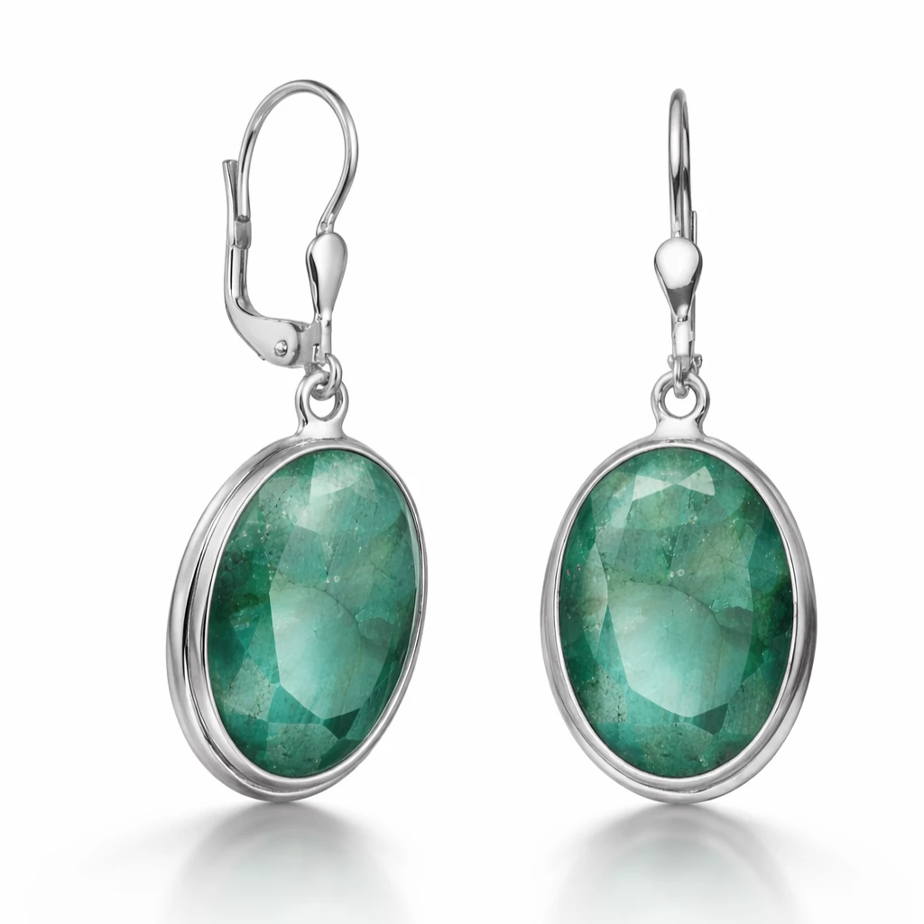 Elegantní oválné náušnice, kterým dominuje zelený drahokam jménem smaragd. Smaragdy jsou bezpečně usazené ve stříbrném lůžku.
