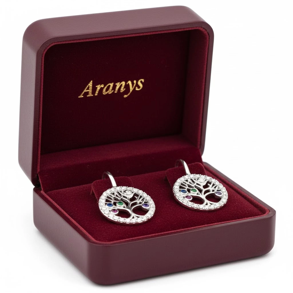 Decentní a vkusné náušnice působí velmi elegantně také díky drobným čirým zirkonům, které je lemují po celém obvodu. Samotný strom je zdobený jemnými barevnými zirkony, které mu dodávají na půvabu.