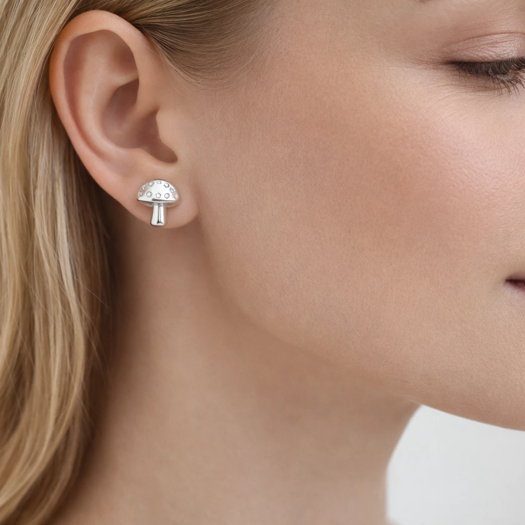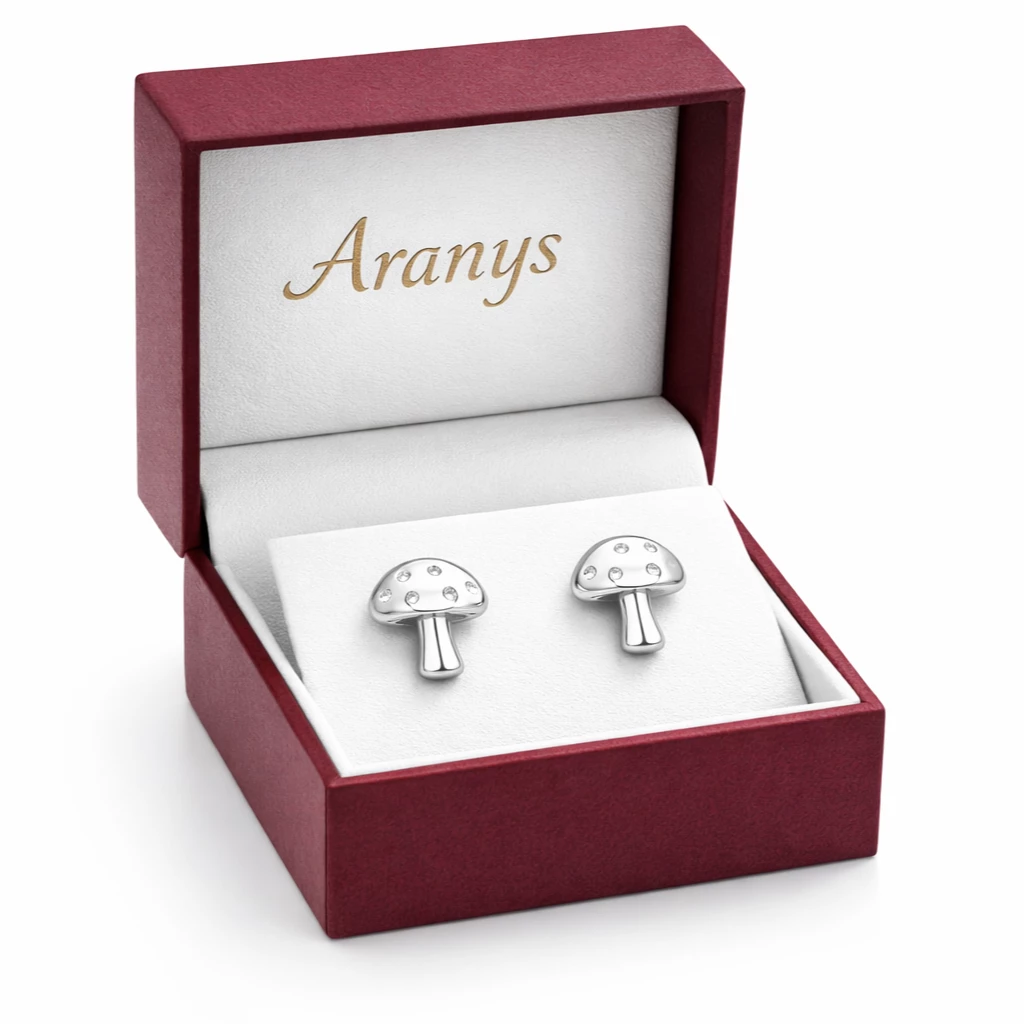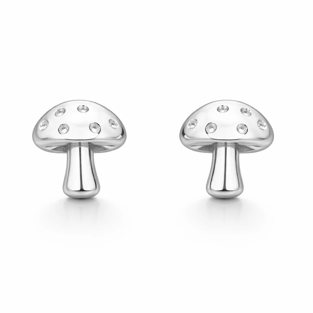 Jemné stříbrné náušnice ve tvaru muchomůrky zdobené třpytivými zirkony. Originální autorský design s pohodlným puzetovým zapínáním, ideální na každodenní nošení.