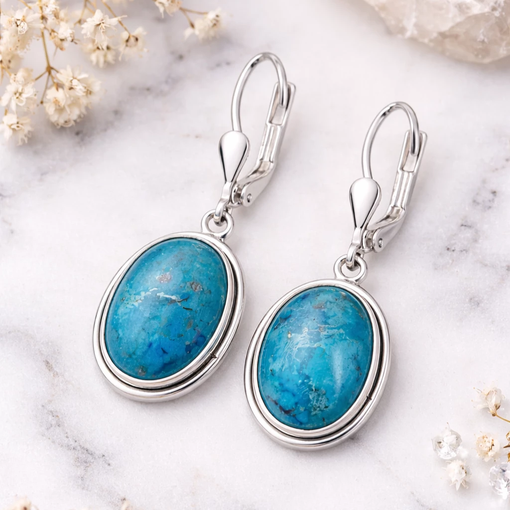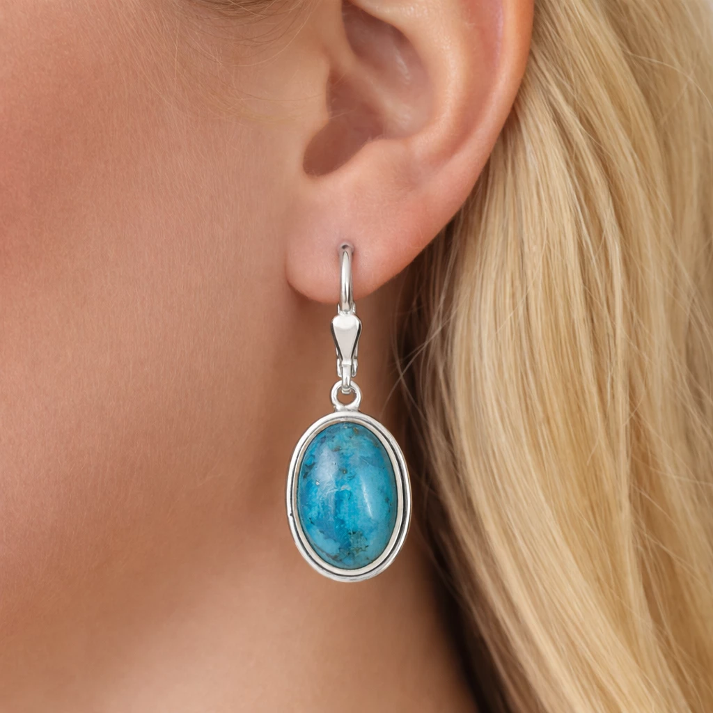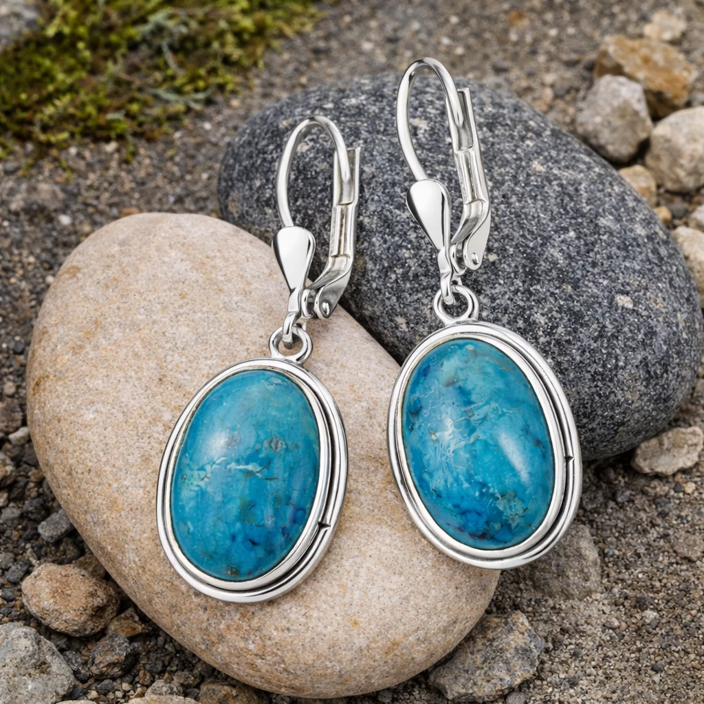 Stříbrné náušnice Maris jsou vyrobeny z kvalitního Stříbra Ag 925/1000 a zdobí je oválné tyrkysy, které vynikají svou přirozenou kresbou i harmonickými modrozelenými odstíny. Díky svému elegantnímu provedení působí jemně, nadčasově a snadno se kombinují s dalšími šperky.