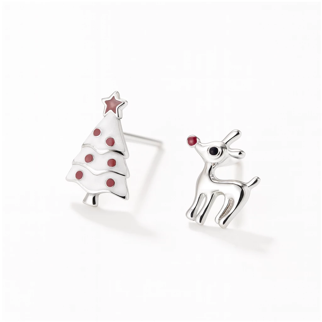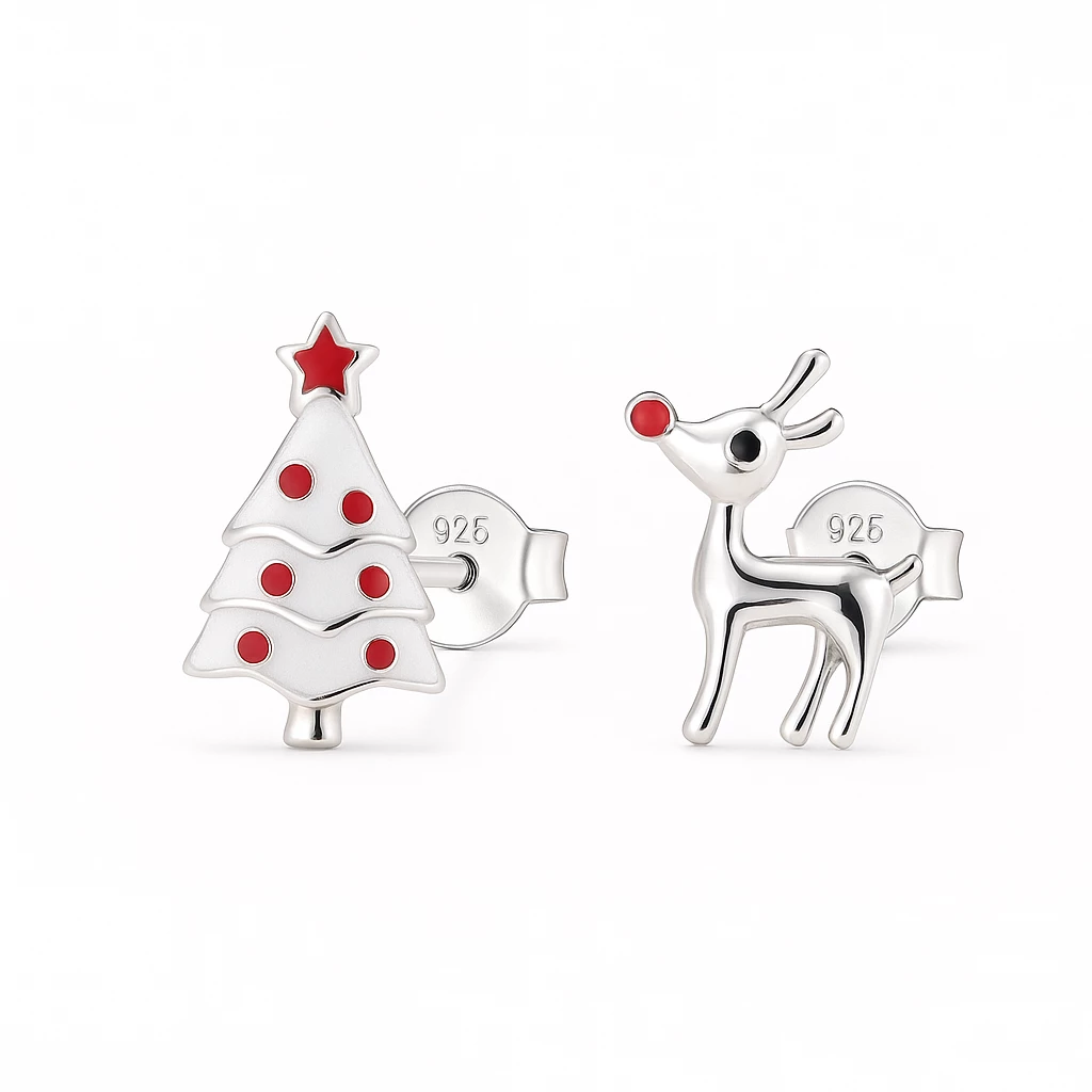 Originální stříbrné náušnice s motivem stromečku a soba. Tento šperk se hodí pro všechny nadšence Vánoc a zimního období. Ilustrační foto.