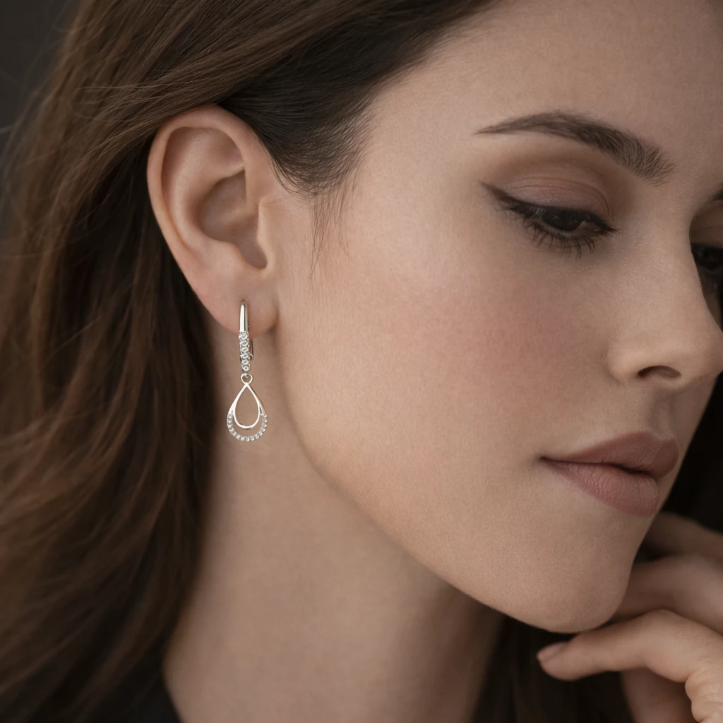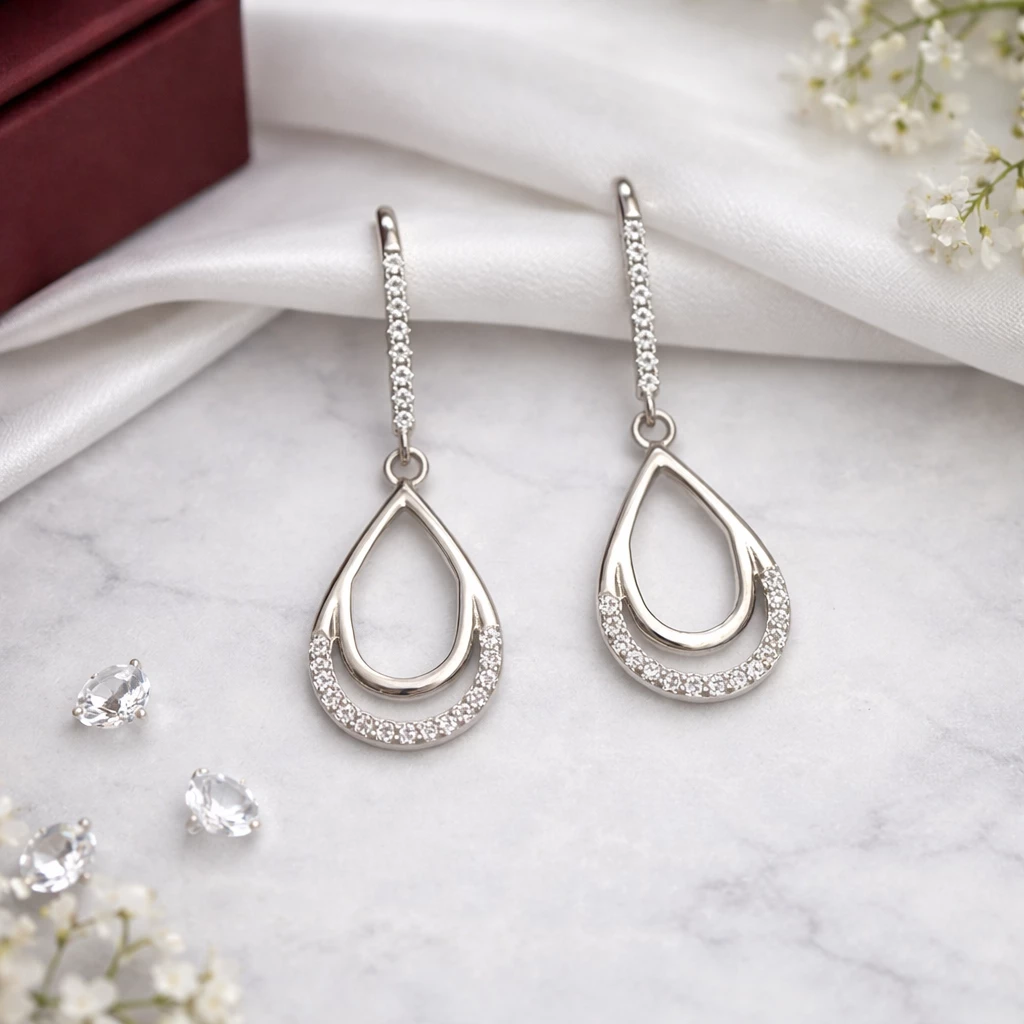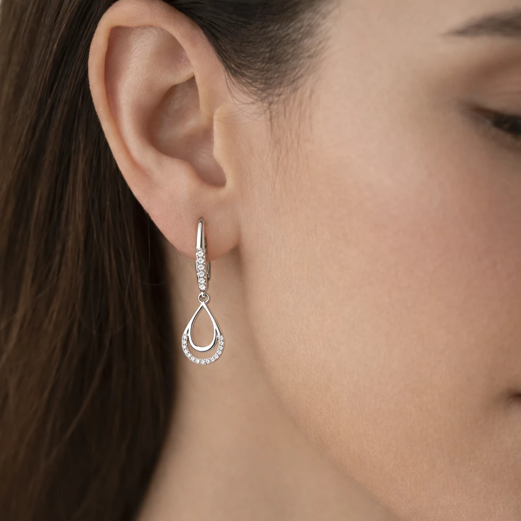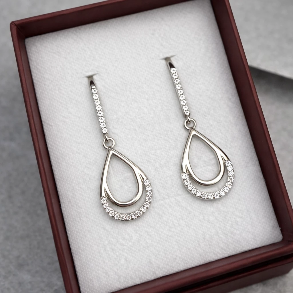 Elegantní kapkový motiv je zdoben řadou třpytivých zirkonů (kubická zirkonie), které dodávají náušnicím jemný lesk a luxusní vzhled. Visací provedení působí lehce a krásně zvýrazní ženské rysy.