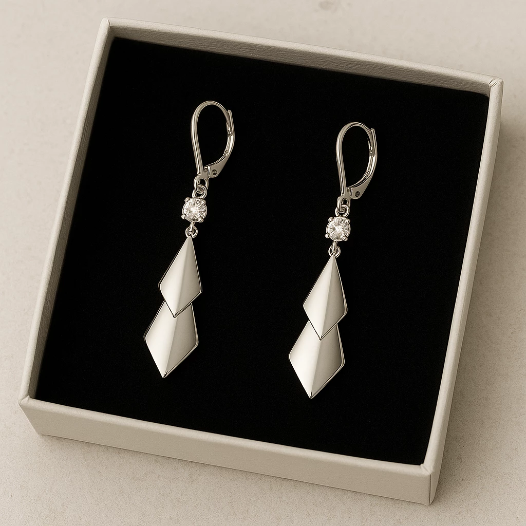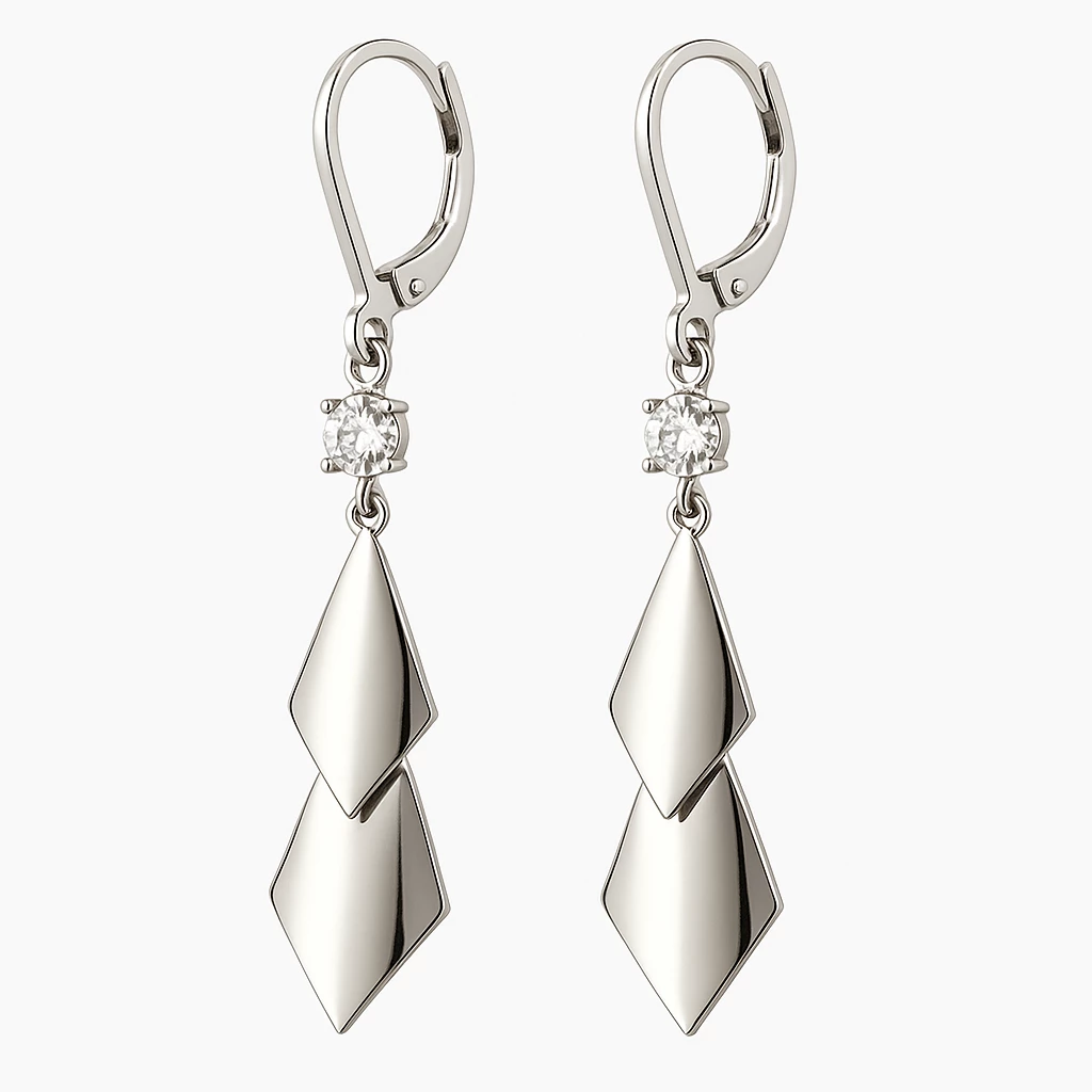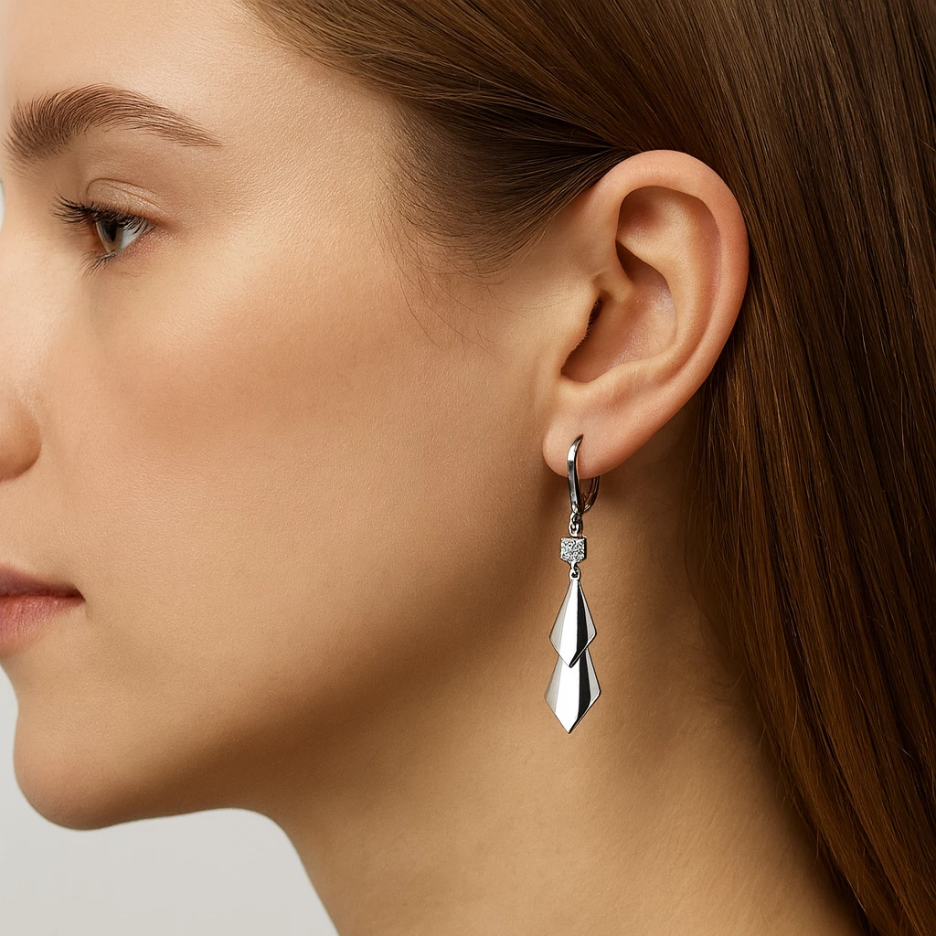 Elegantní stříbrné visací náušnice s čirým krystalem a moderním geometrickým designem. Jemný lesk a čisté linie dodávají šperku nadčasovou eleganci, vhodnou pro každodenní nošení i slavnostní příležitosti.