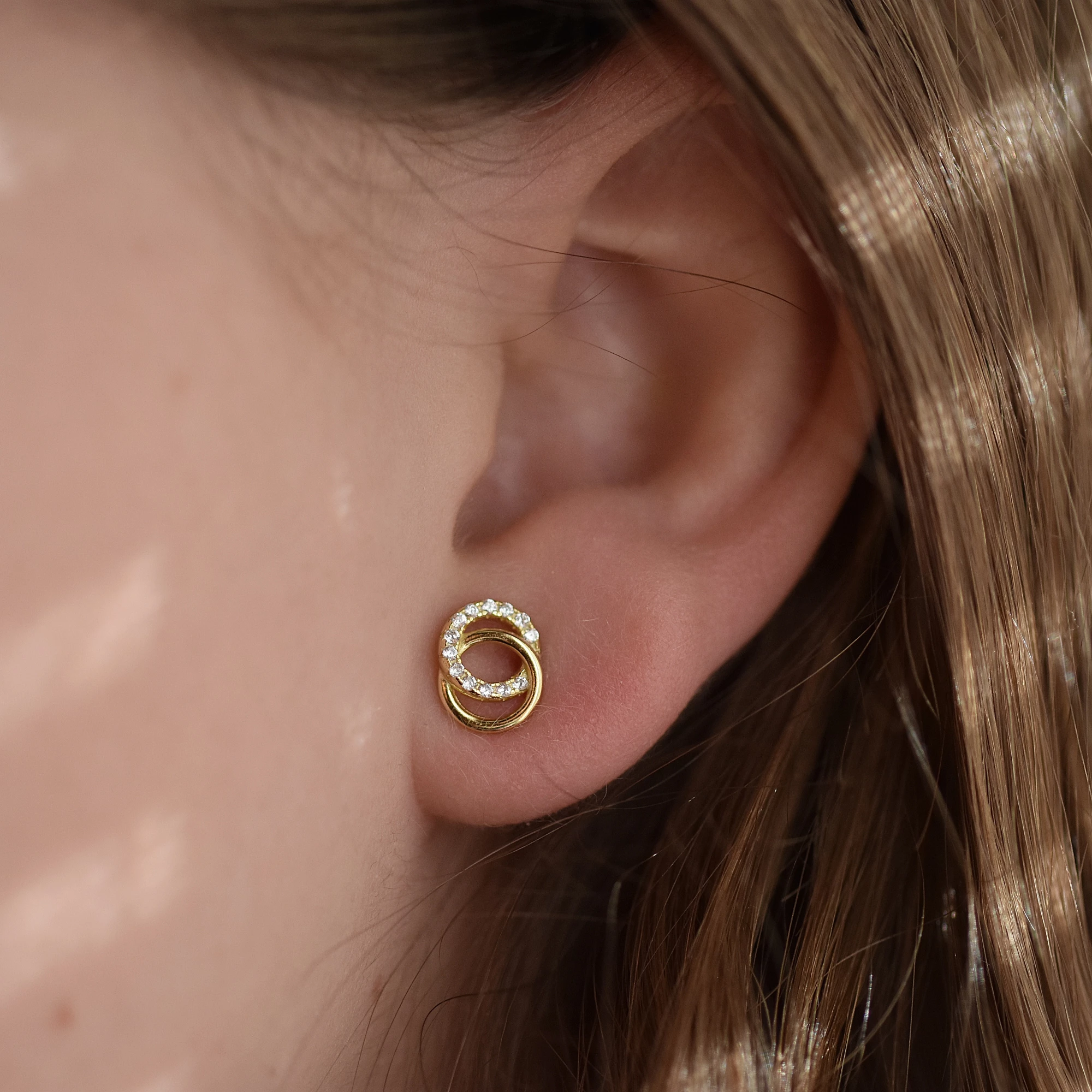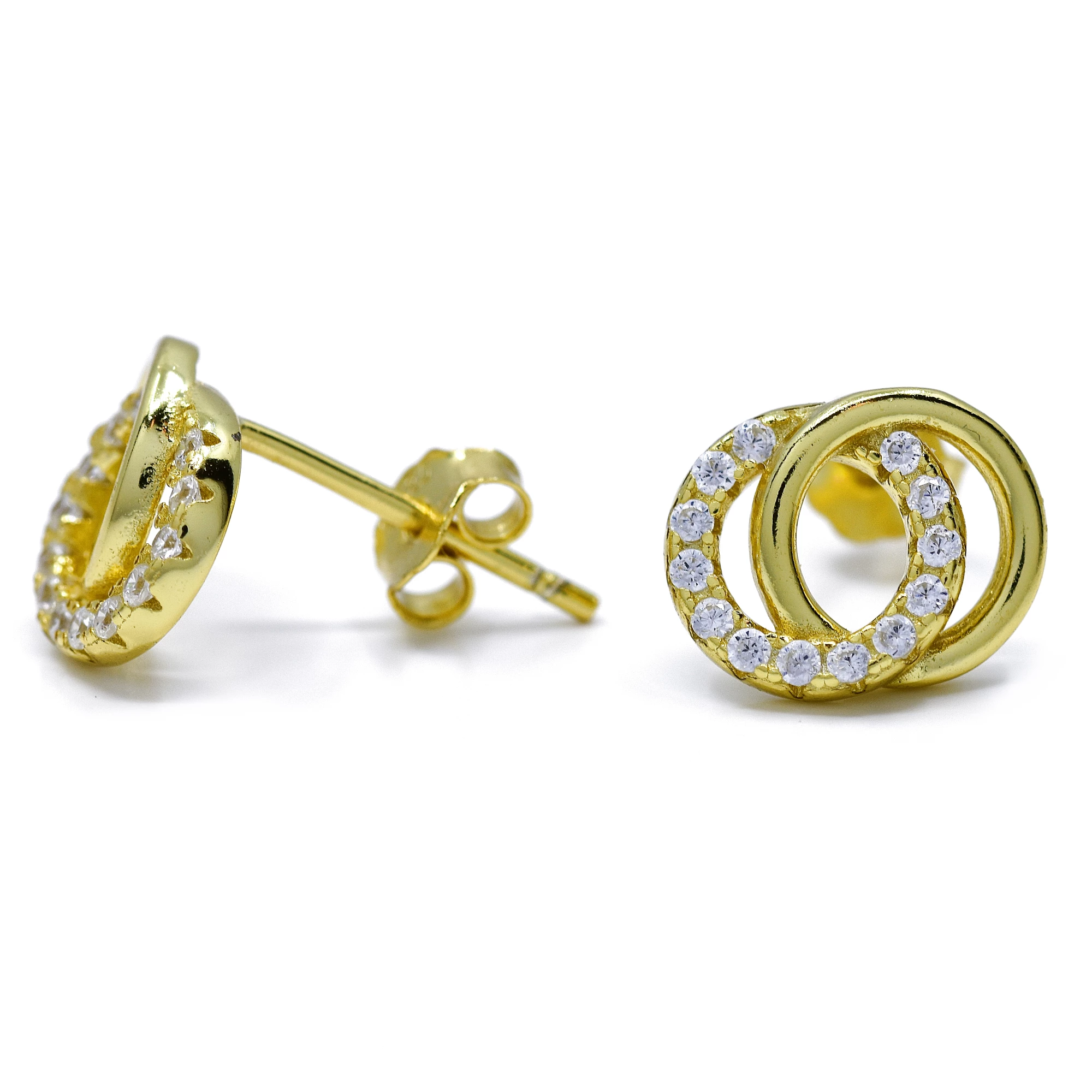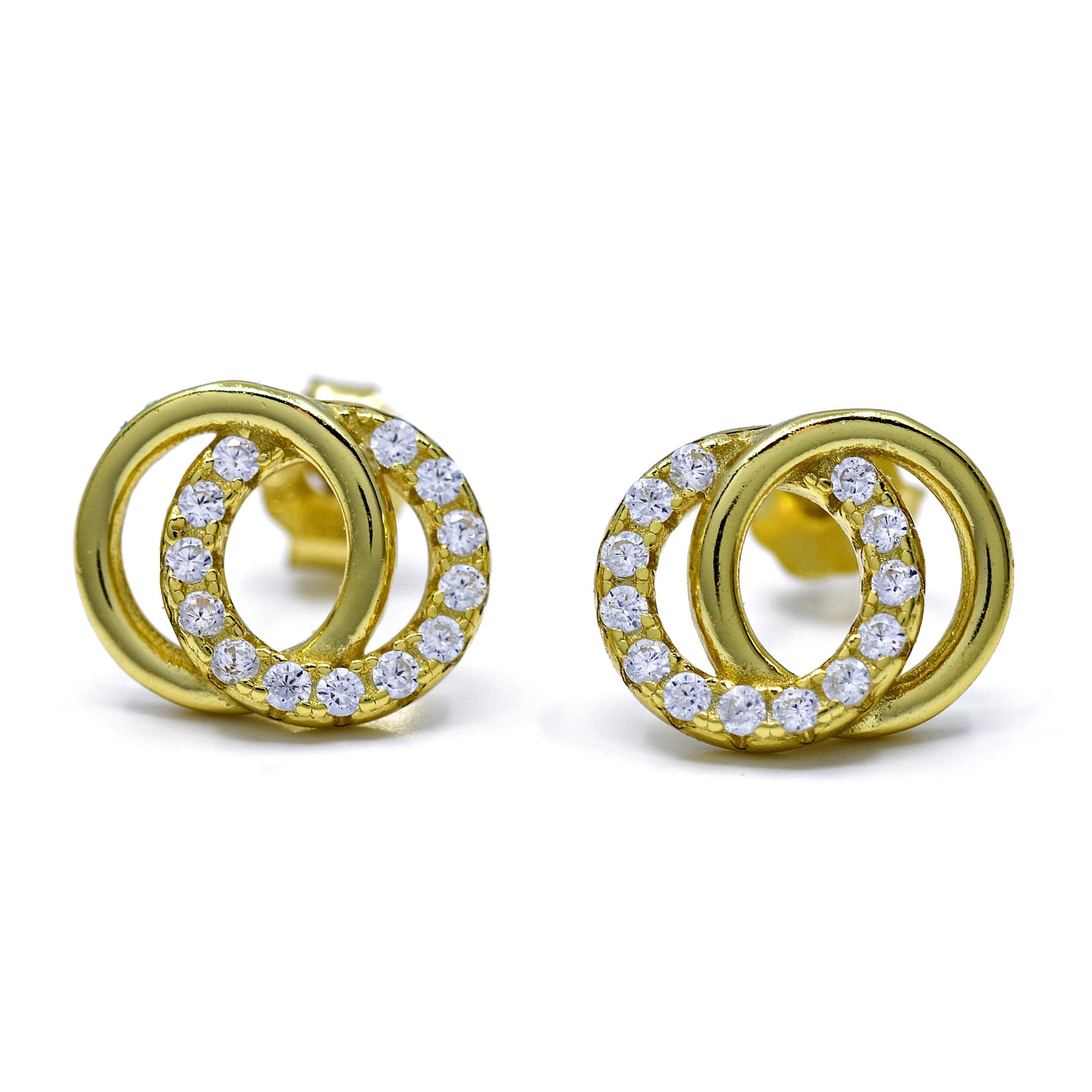Stříbrné zlacené náušnice kroužky se zirkonky budou trefou do černého. Každá náušnice se skládá ze dvou kruhů umístěných vedle sebe. První kruh je hladký, zatímco druhý kruh je zdobený zirkonovými kamínky, které dodávají náušnicím zářivý lesk. Tato kombinace zanechává dojem vkusného kontrastu mezi hladkým stříbrem a jemně třpytícími se zirkony. Zapínání je puzetové.
