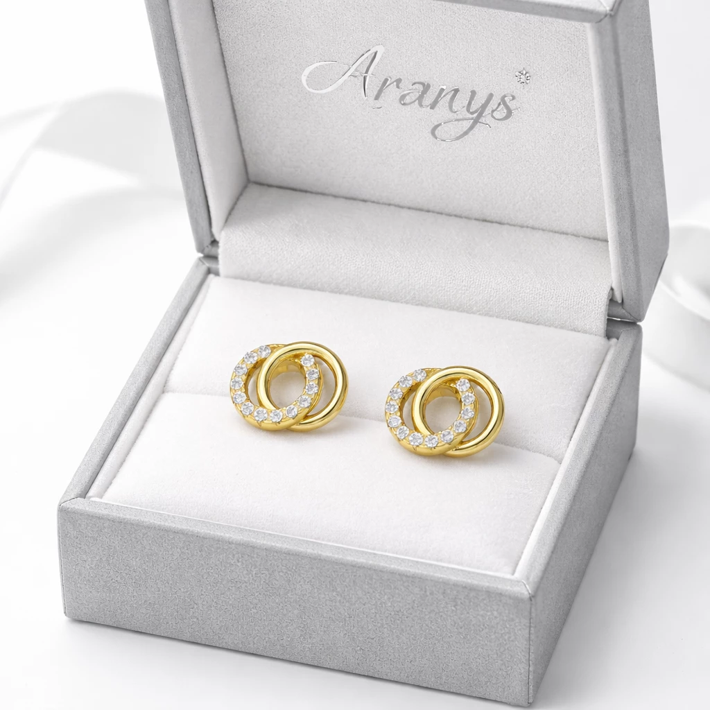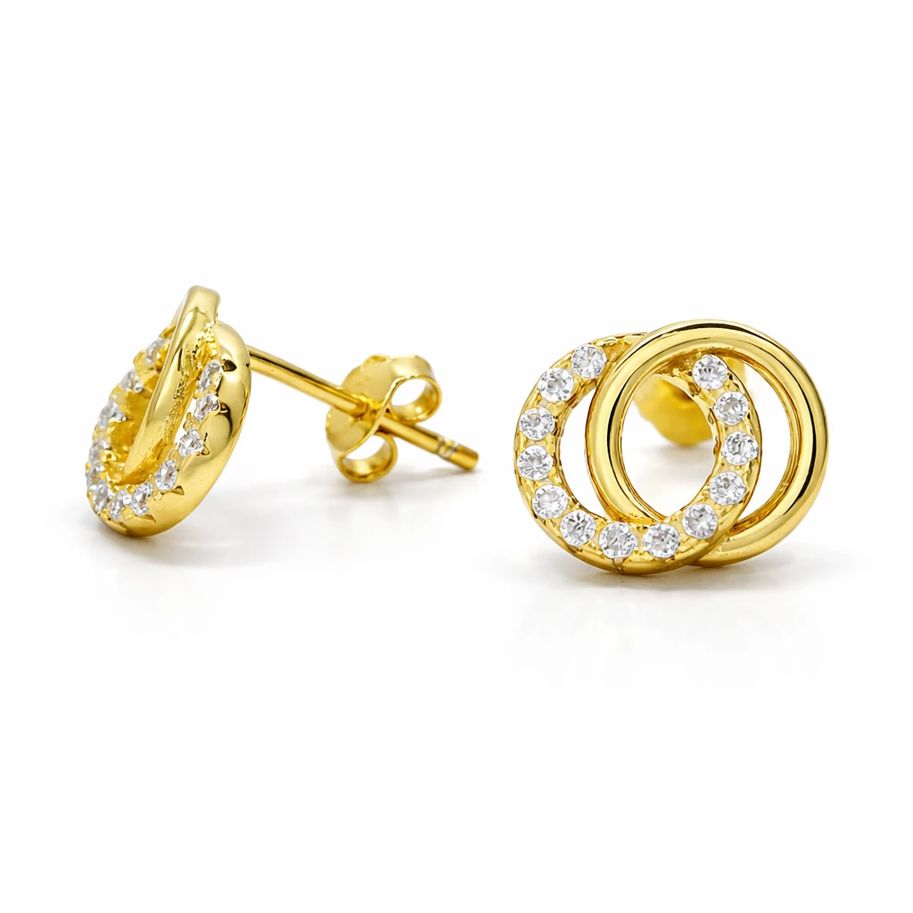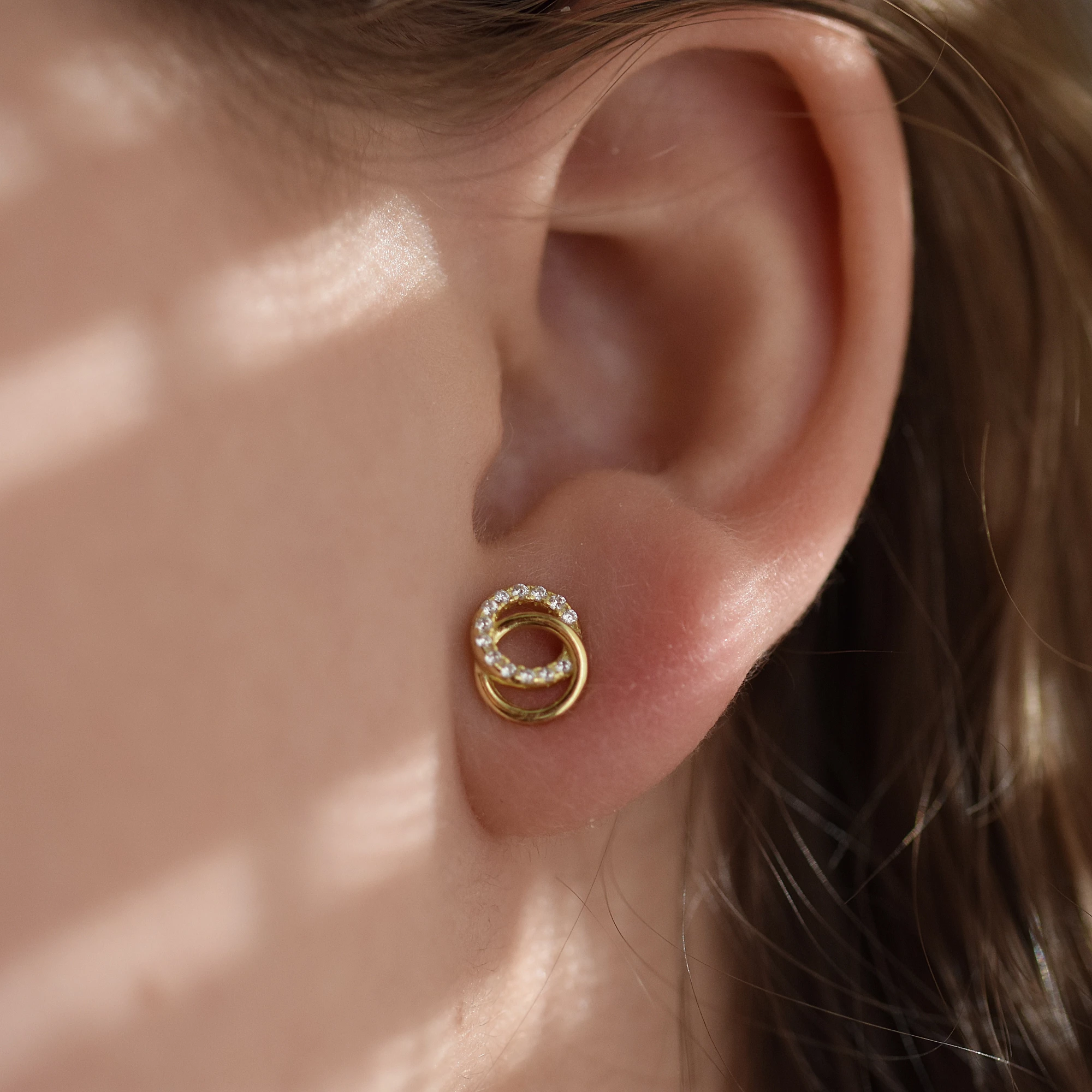 Stříbrné zlacené náušnice kroužky se zirkonky budou trefou do černého. Každá náušnice se skládá ze dvou kruhů umístěných vedle sebe. První kruh je hladký, zatímco druhý kruh je zdobený zirkonovými kamínky, které dodávají náušnicím zářivý lesk. Tato kombinace zanechává dojem vkusného kontrastu mezi hladkým stříbrem a jemně třpytícími se zirkony. Zapínání je puzetové.
