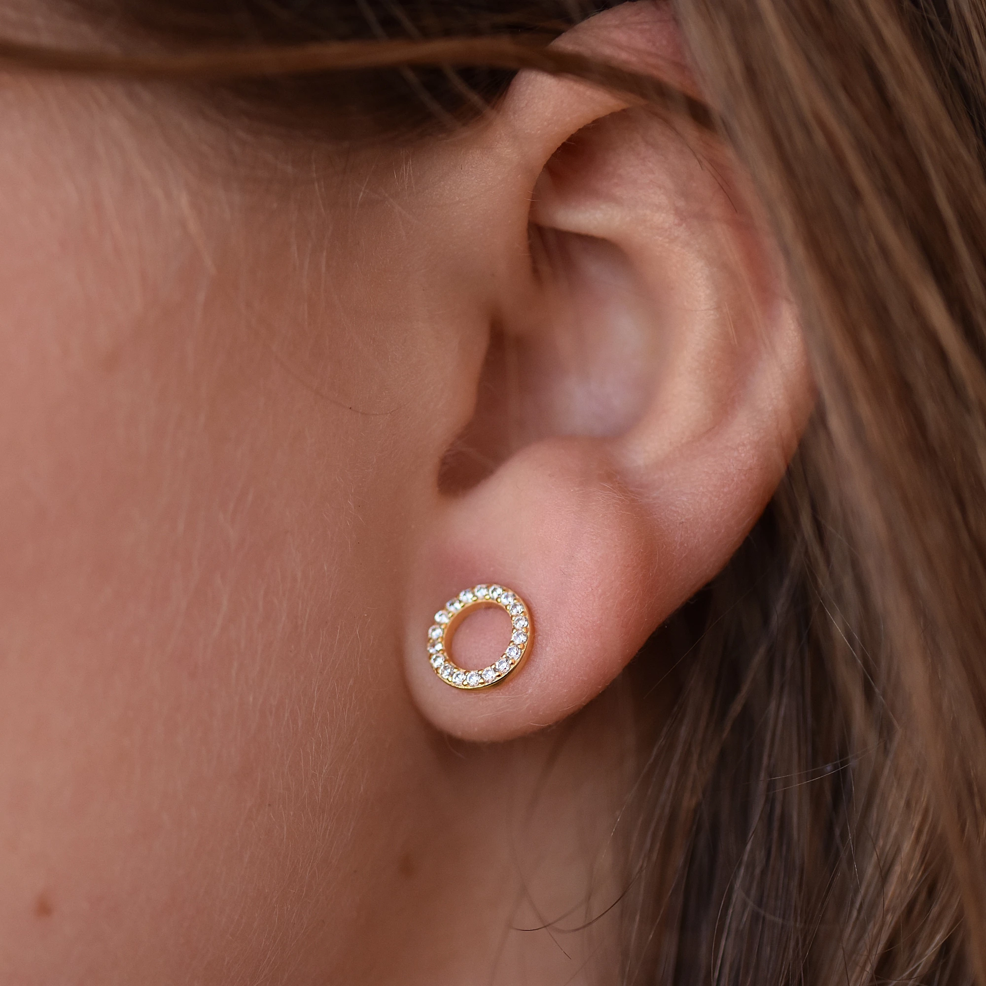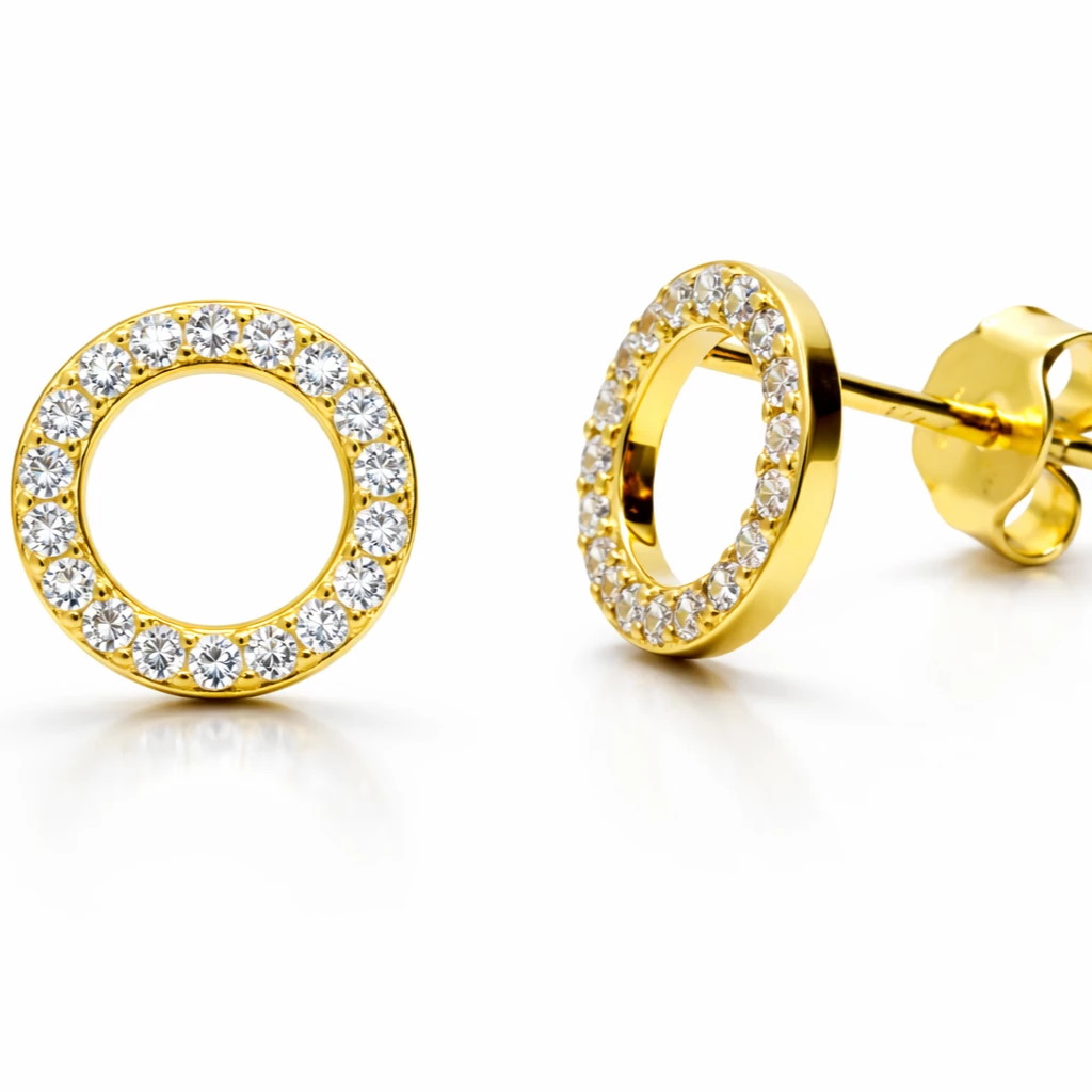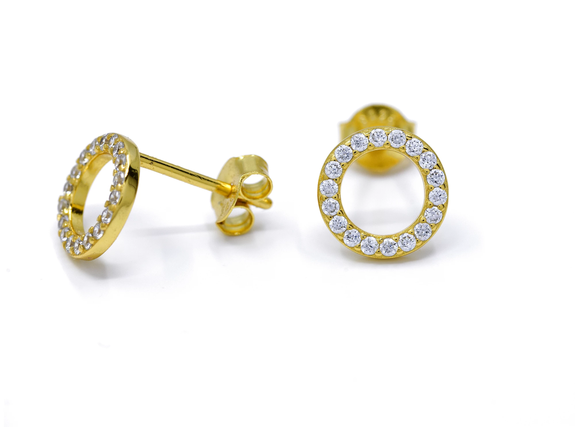 Stříbrné zlacené náušnice s motivem kruhu a zirkonky budou trefou do černého. Kruh je po celém svém obvodu tvořen třpytivými zirkonky, díky kterým působí nepřehlédnutelně. Náušnice skvěle sladíte s ostatními zlacenými produkty a také outfity. Zapínání je puzetové.