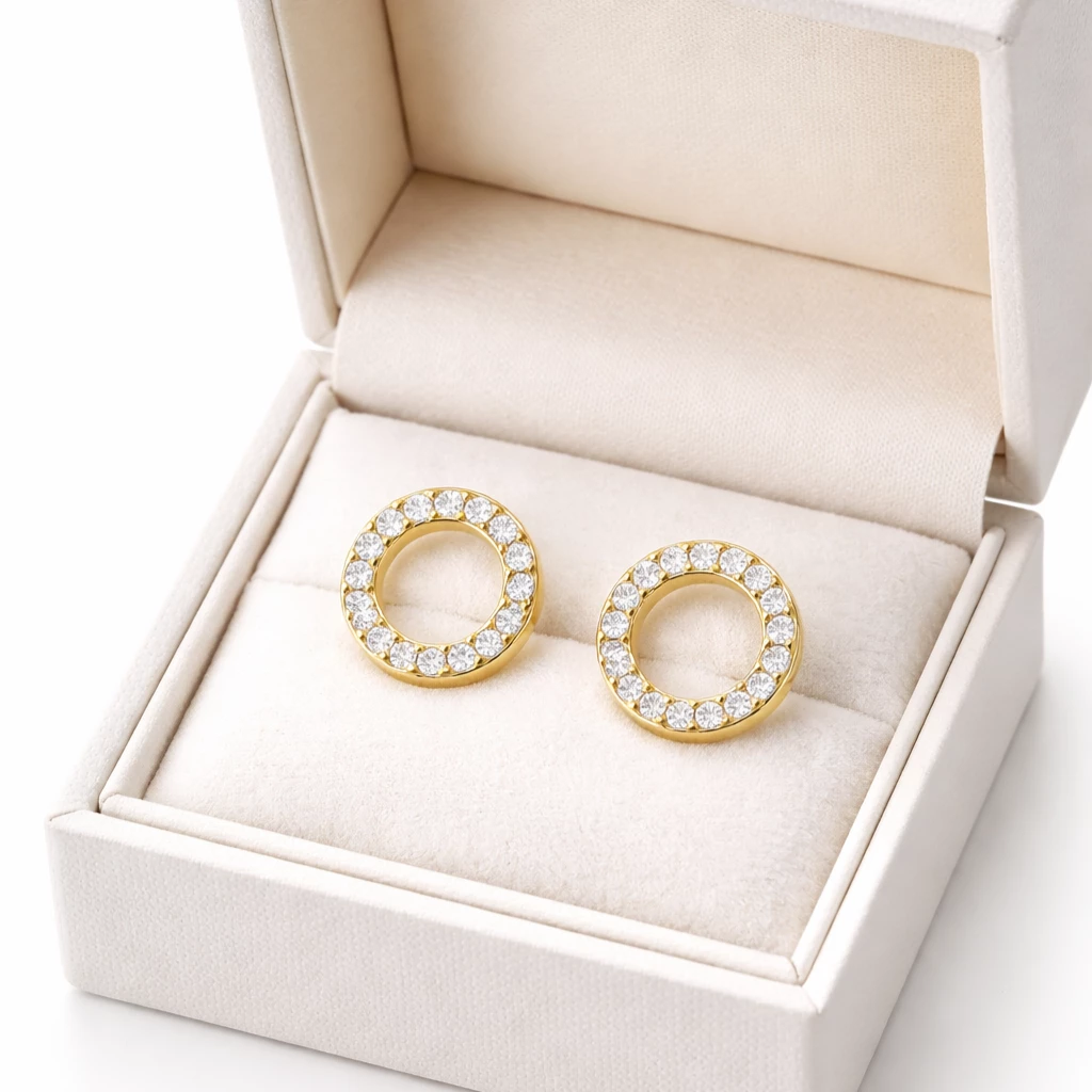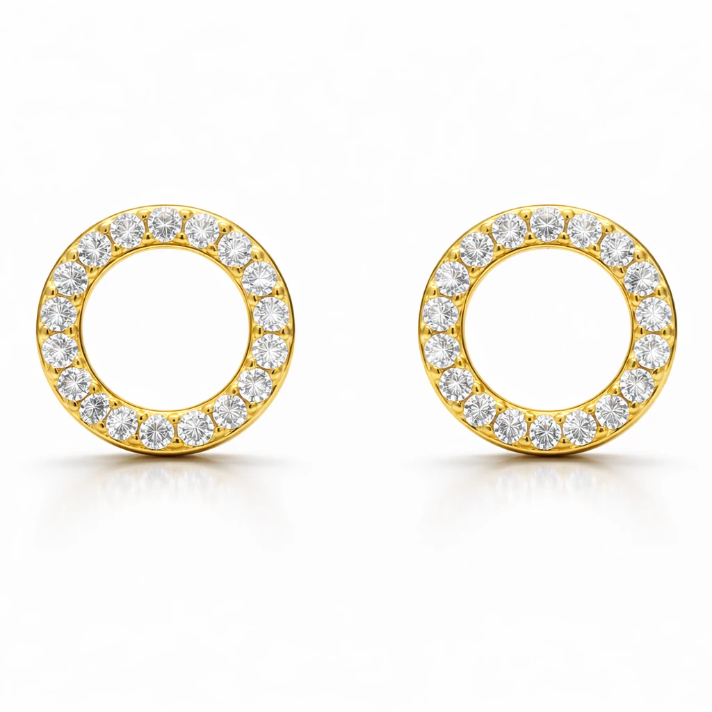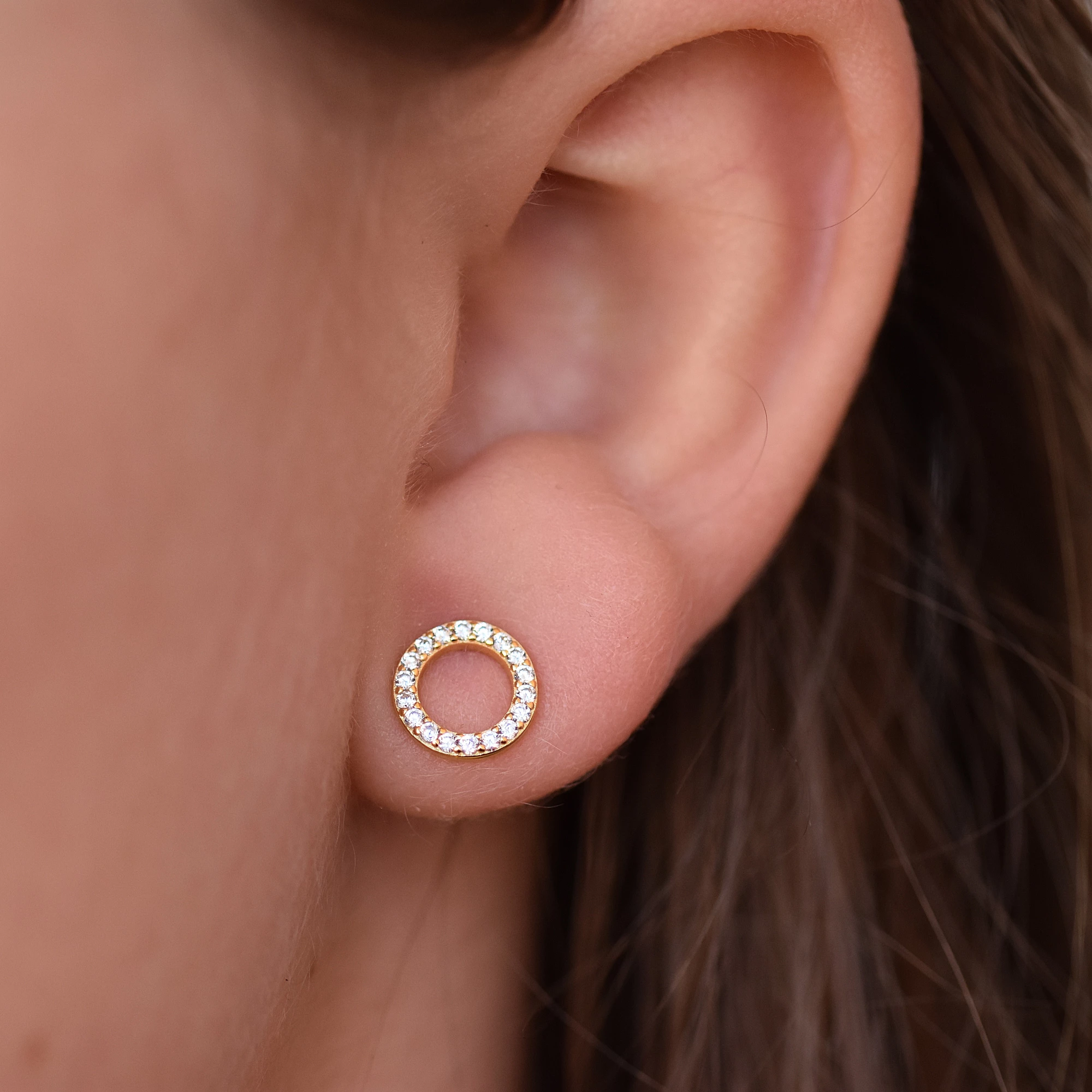 Stříbrné zlacené náušnice s motivem kruhu a zirkonky budou trefou do černého. Kruh je po celém svém obvodu tvořen třpytivými zirkonky, díky kterým působí nepřehlédnutelně. Náušnice skvěle sladíte s ostatními zlacenými produkty a také outfity. Zapínání je puzetové.