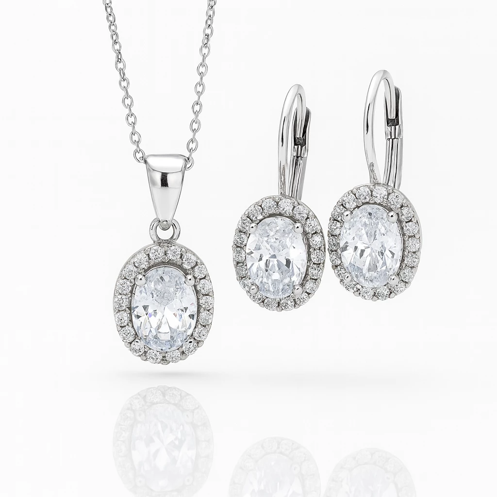 Zářivá stříbrná souprava náušnic a přívěsku vhodná pro každý den. Všechny komponenty jsou pečlivě osázeny různě velkými čirými zirkony. Dámské visací náušnice jsou opatřené klapkou, která se postar o jejich pohodlné nošení. Stříbrný přívěsek zdobí třpytivé zirkony i na oušku pro zavěšení na řetízek. Společně tvoří dokonalou soupravu kterou bude každý obdivovat.