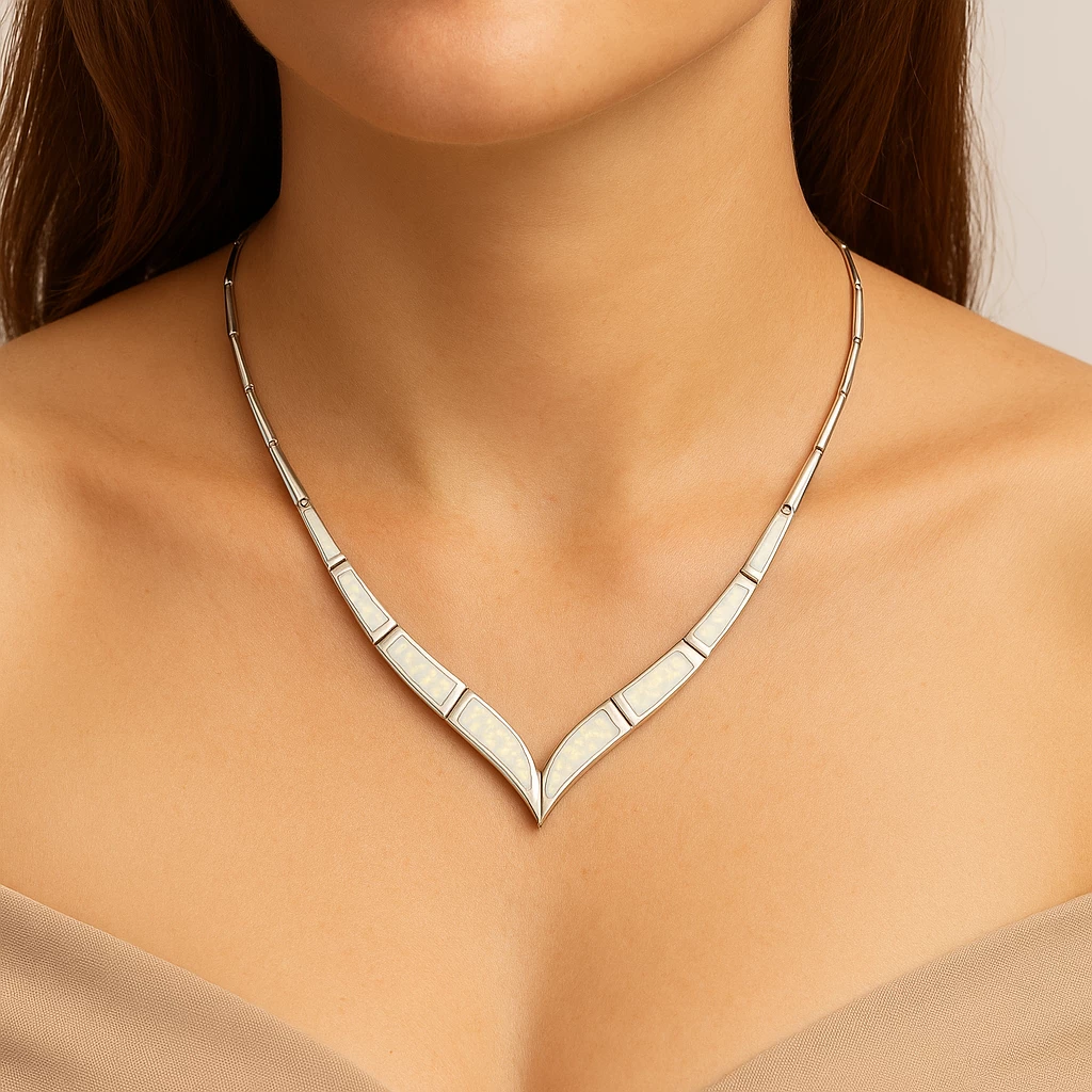 Elegantní stříbrný náhrdelník zdobený kameny modrého či bílého opálu v řeckém stylu bude zaručeně nepřehlednutelným šperkem u každé ženy či dívky. Opálové odlesky mají mimořádně krásný třpyt.