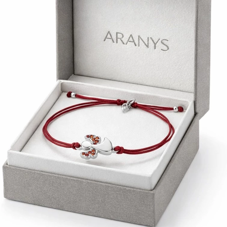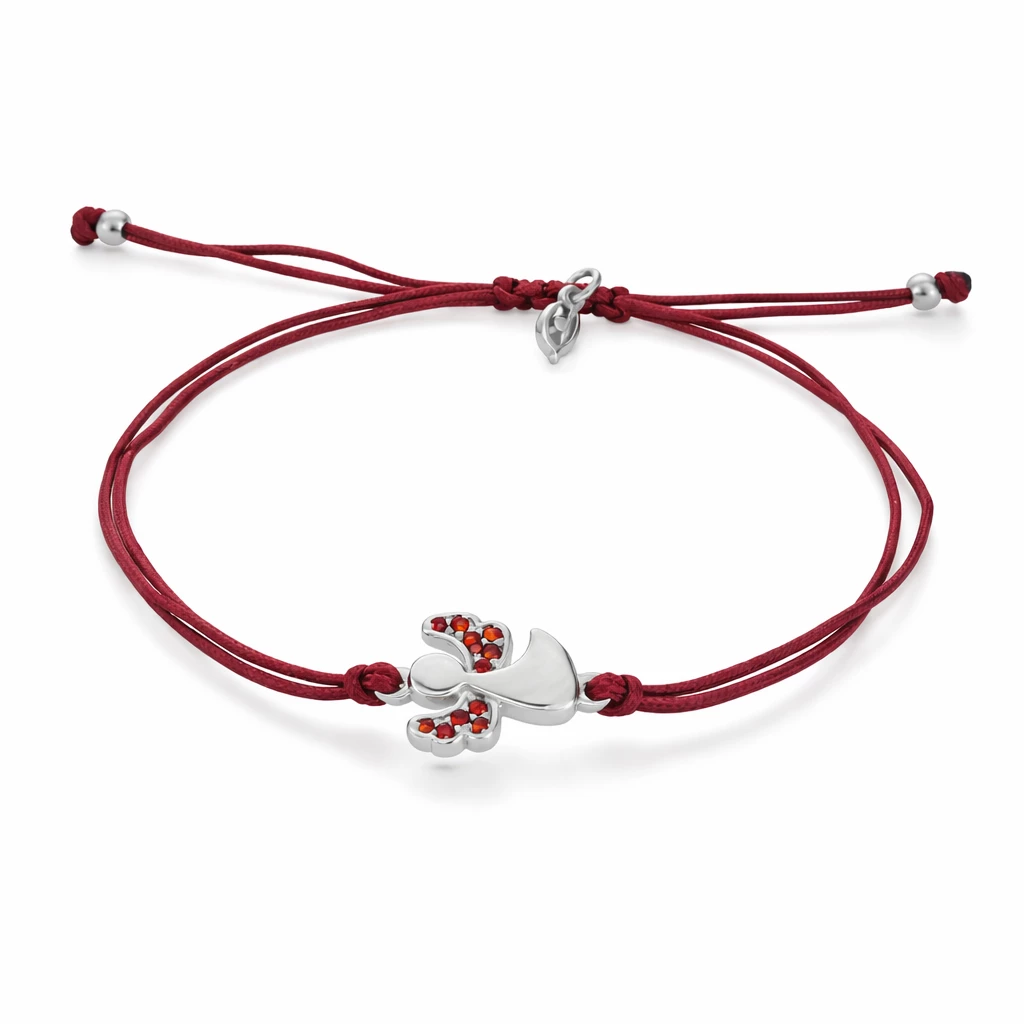 Jemný stříbrný náramek z tenké stužky červené barvy s andílkem. Posuvné zapínání, díky nemuž je možné délku regulovat. Povrch andílka je rhodiován, čímž je zaručená dlouhá životnost šperku a je antialergický.