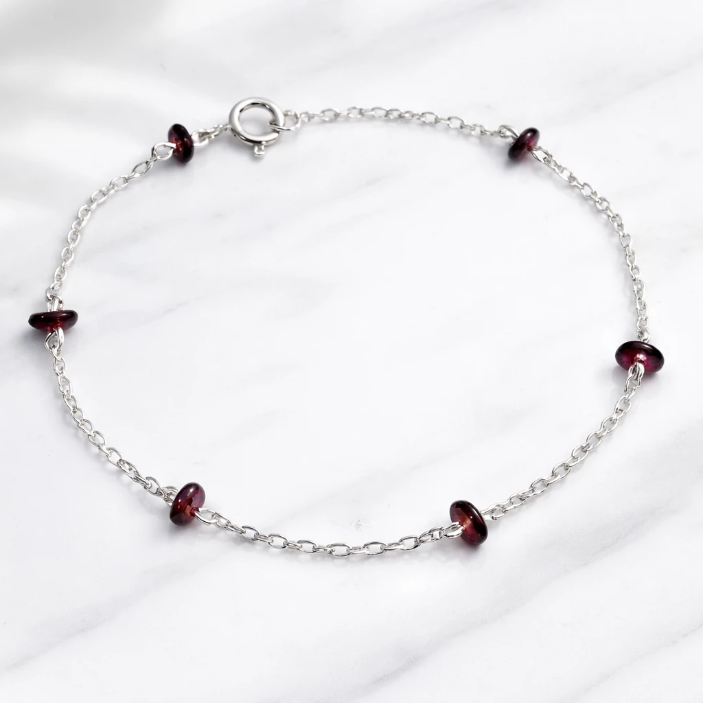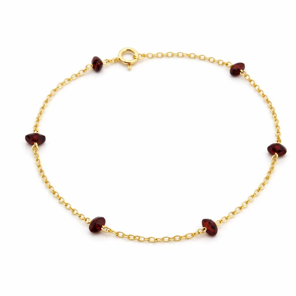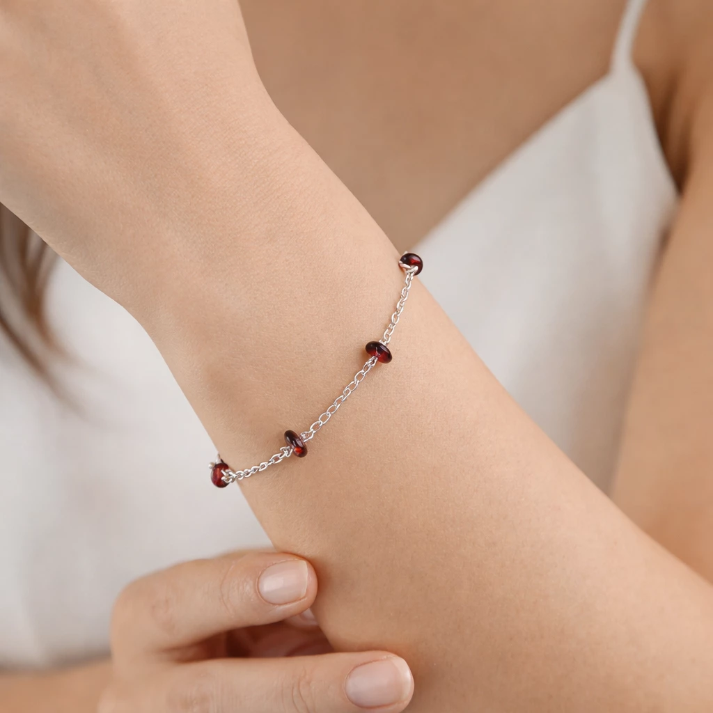 Stříbrný náramek s českým granátem Michaella ze Stříbra Ag 925/1000 je tvořen jemným řetízkem doplněným o pravé české granáty v sytě červeném odstínu. Lehký a elegantní design působí jemně a zároveň výrazně.