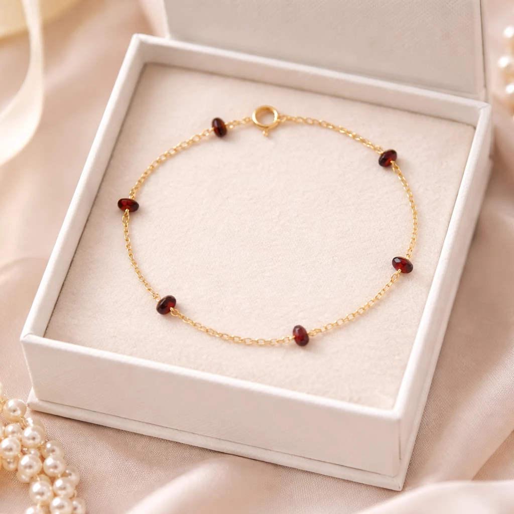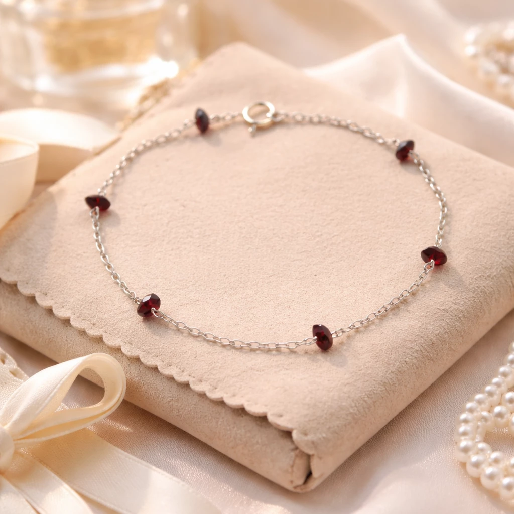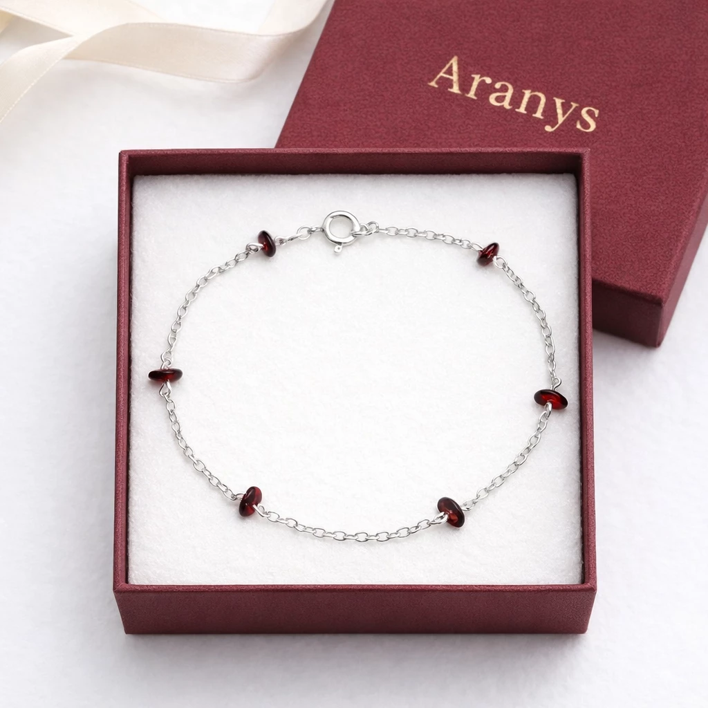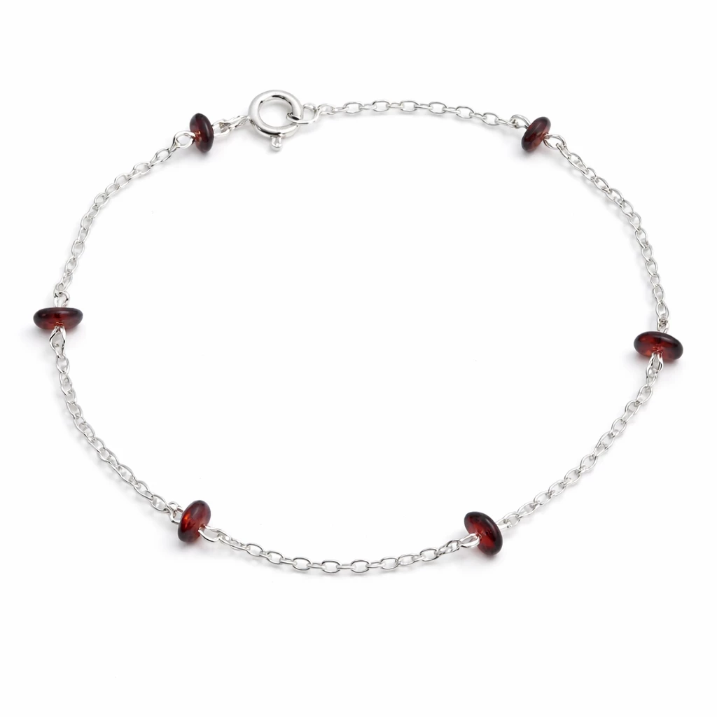 Stříbrný náramek s českým granátem Michaella ze Stříbra Ag 925/1000 je tvořen jemným řetízkem doplněným o pravé české granáty v sytě červeném odstínu. Lehký a elegantní design působí jemně a zároveň výrazně.