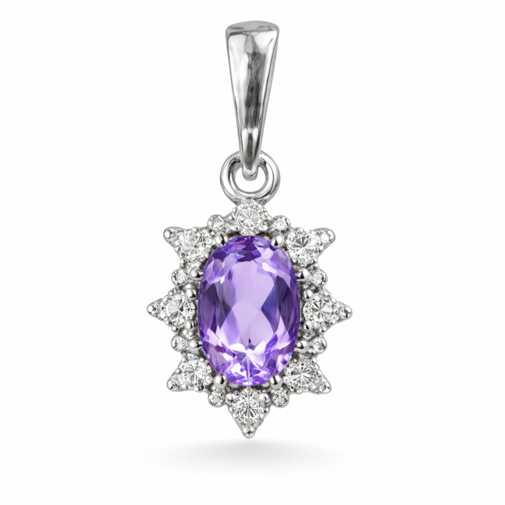 Stříbrný přívěsek kytička s ametystem Amalia je vyroben z kvalitního Stříbra Ag 925/1000 a zaujme jemným květinovým motivem s bohatým osazením kamenů. Dominantní ametyst je obklopen zirkony (kubickou zirkonií), které šperku dodávají elegantní třpyt a zvýrazňují detailní zpracování.
