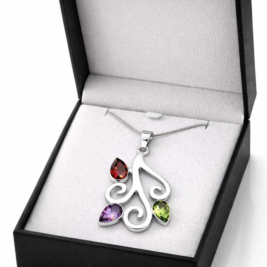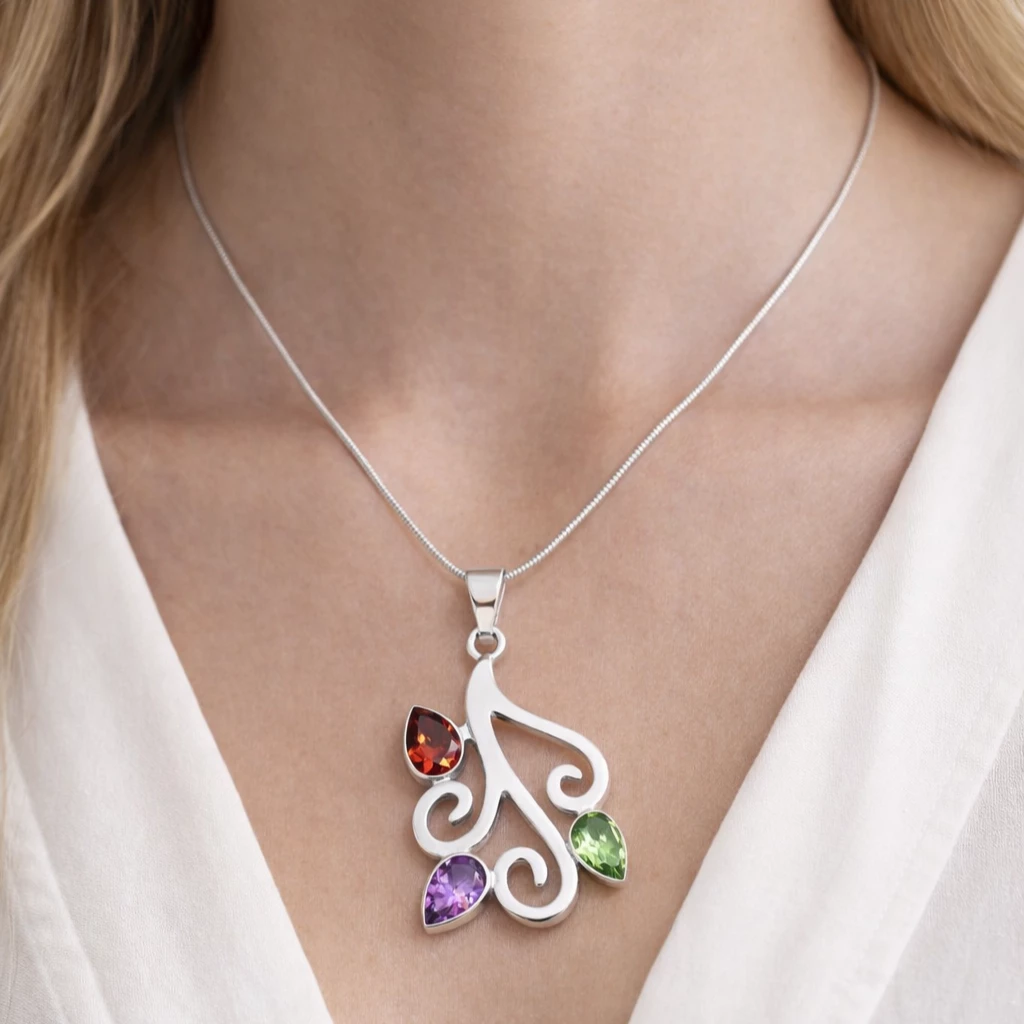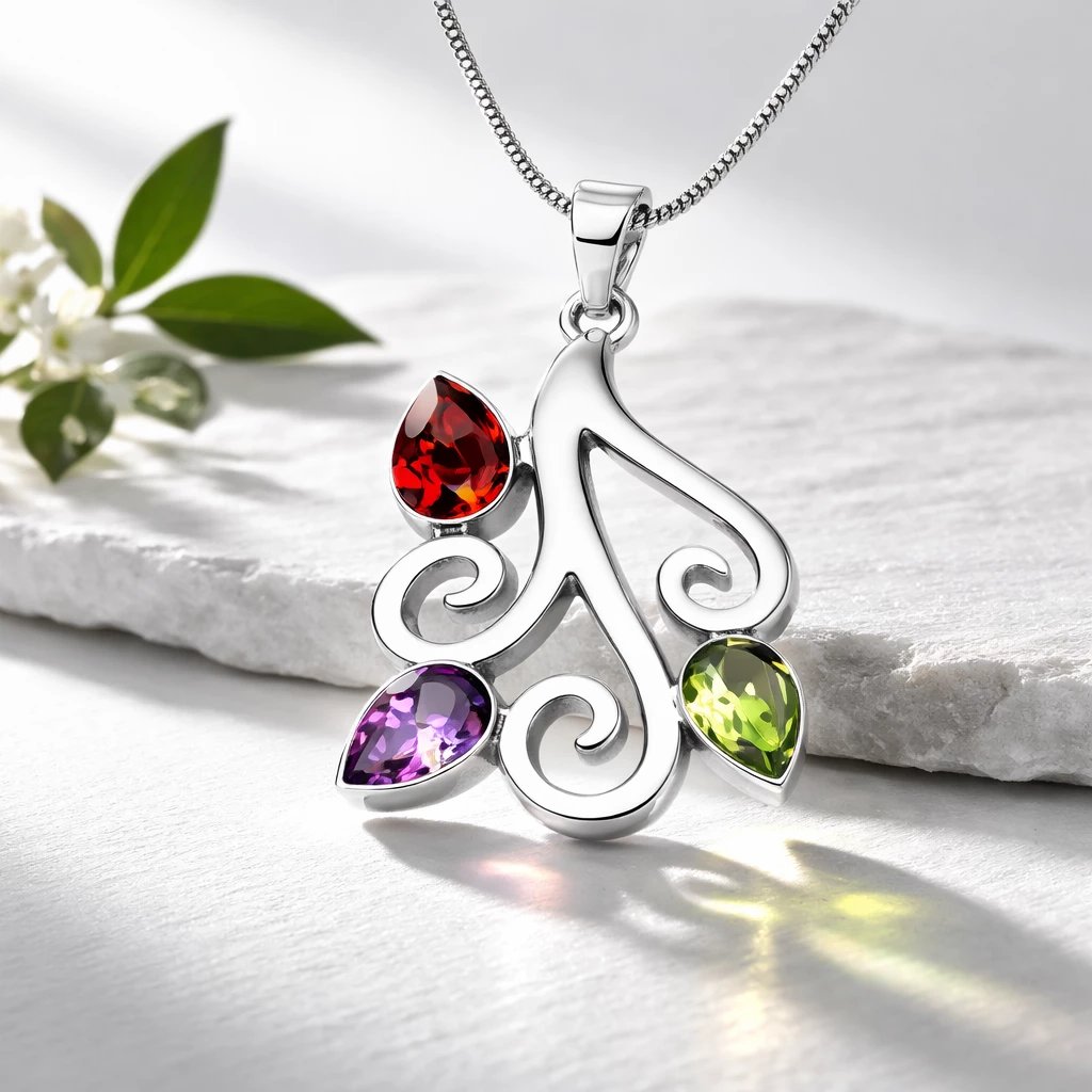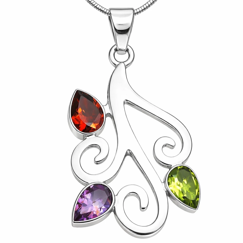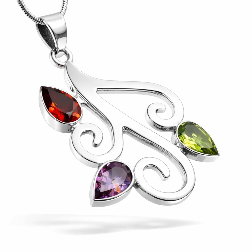 Stříbrný přívěsek s ametystem, granátem a olivínem Trio spojuje tři výrazné minerály do harmonického a elegantního celku. Barevná kombinace dodává šperku originalitu, energii a jedinečný charakter.