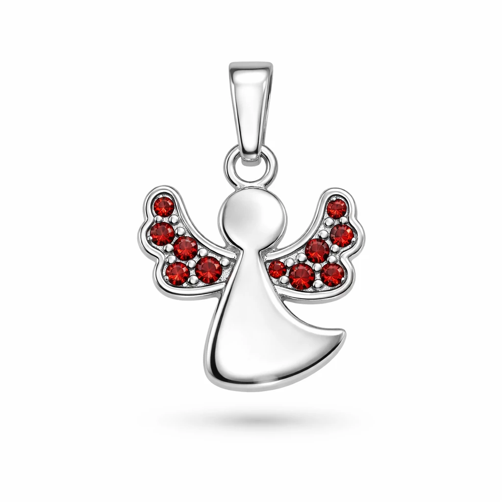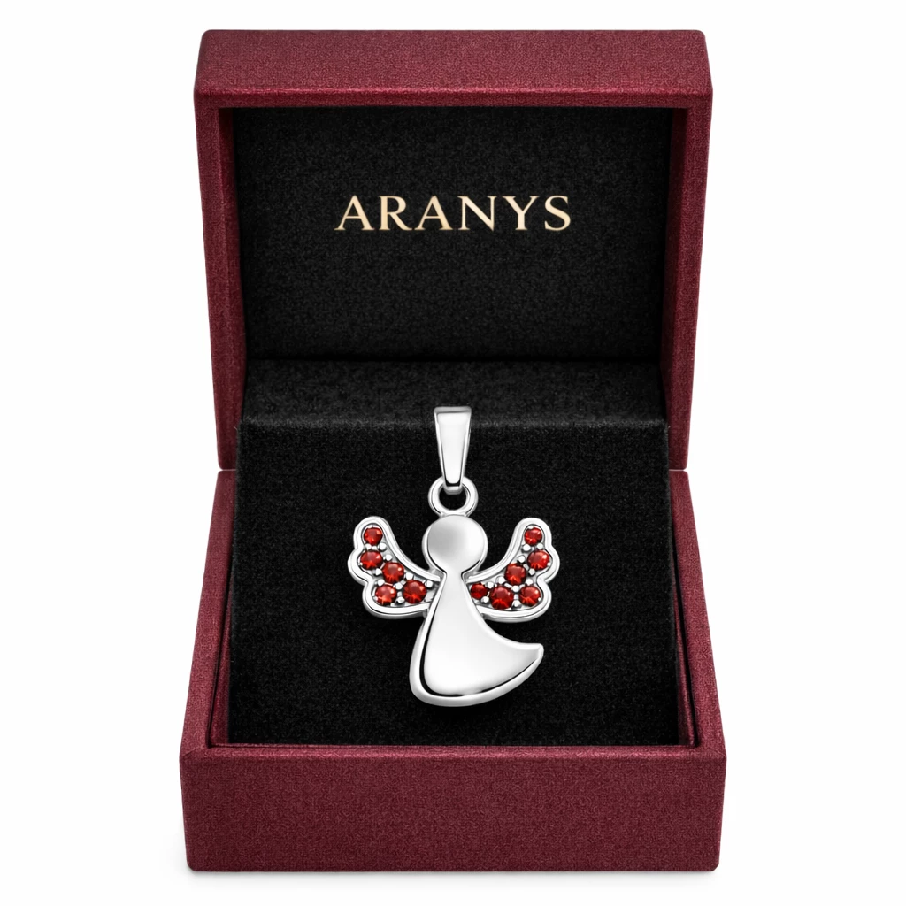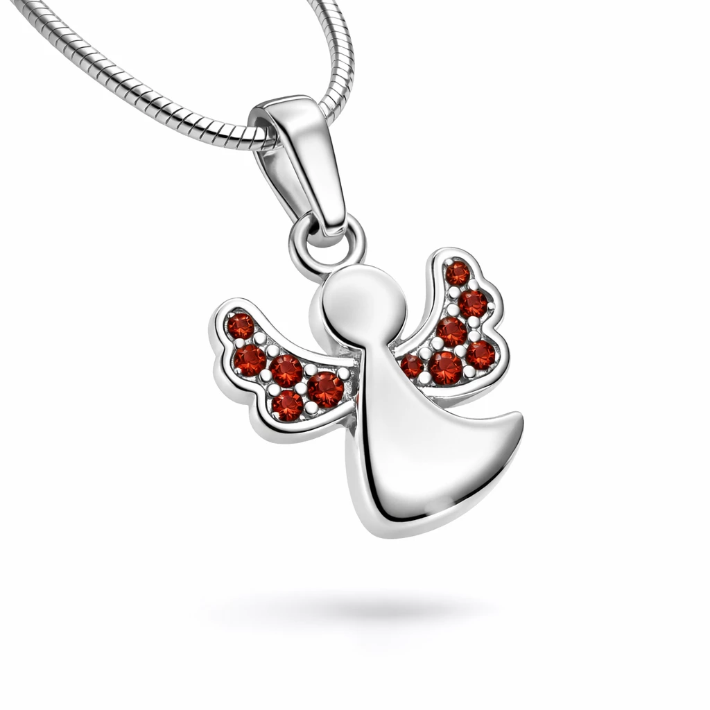 Stříbrný přívěsek Anděl ze Stříbra Ag 925/1000 s českými granáty, dostupný v rhodiované i zlacené variantě.