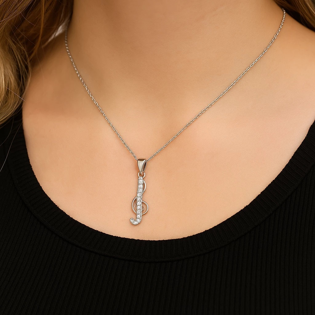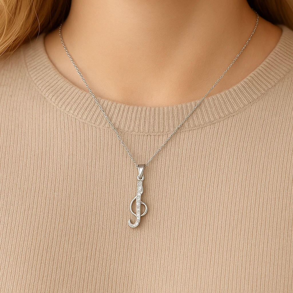 Elegantní stříbrný přívěsek ve tvaru houslového klíče, bohatě zdobený třpytivými zirkony. Perfektní šperk pro milovníky hudby i originální dárek pro výjimečnou ženu.