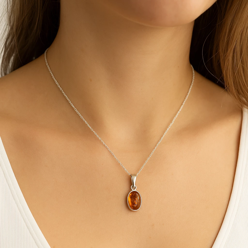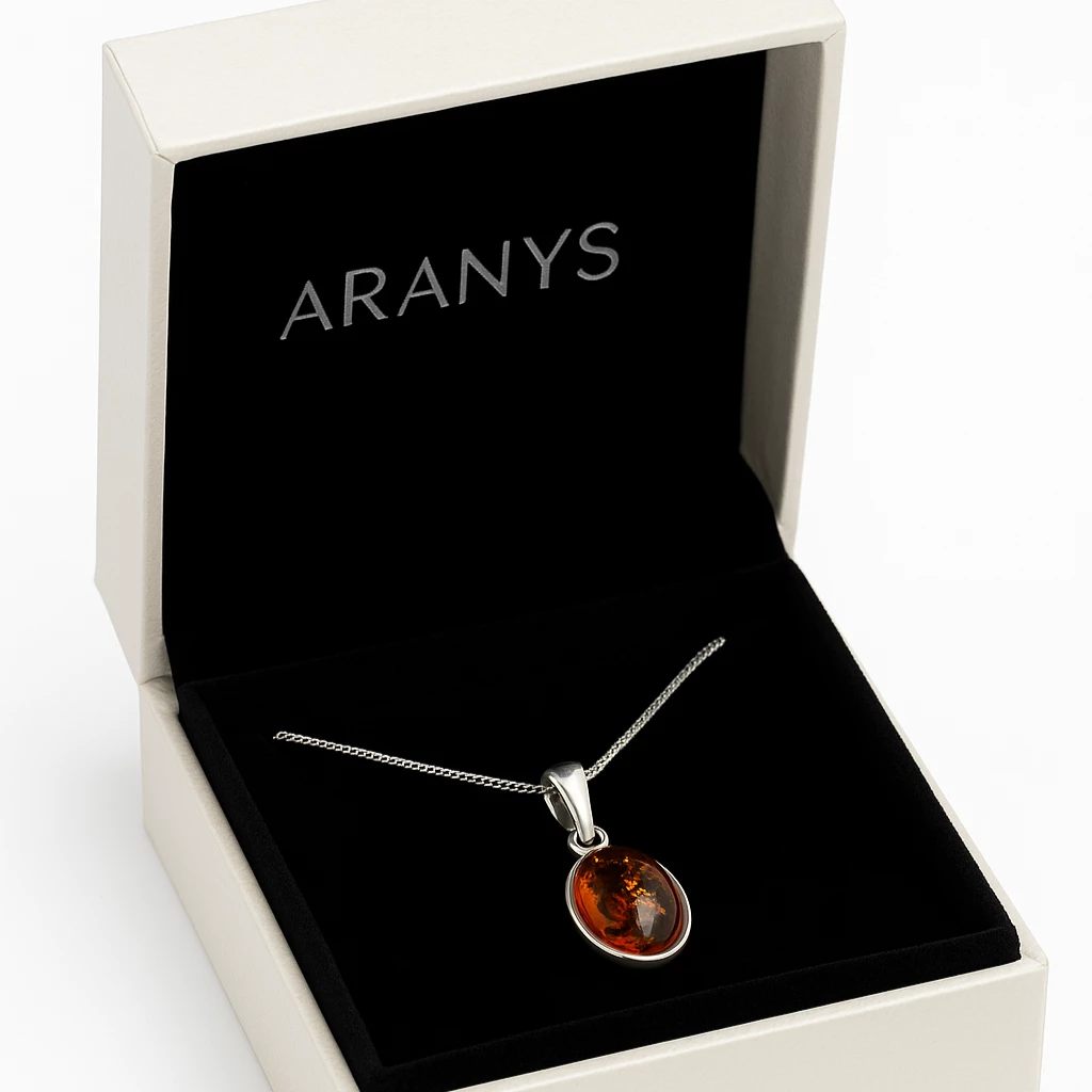 Jemný stříbrný přívěsek s oválným přírodním jantarem v teplém medovém odstínu. Elegantní šperk, který rozjasní dekolt i všední den.
