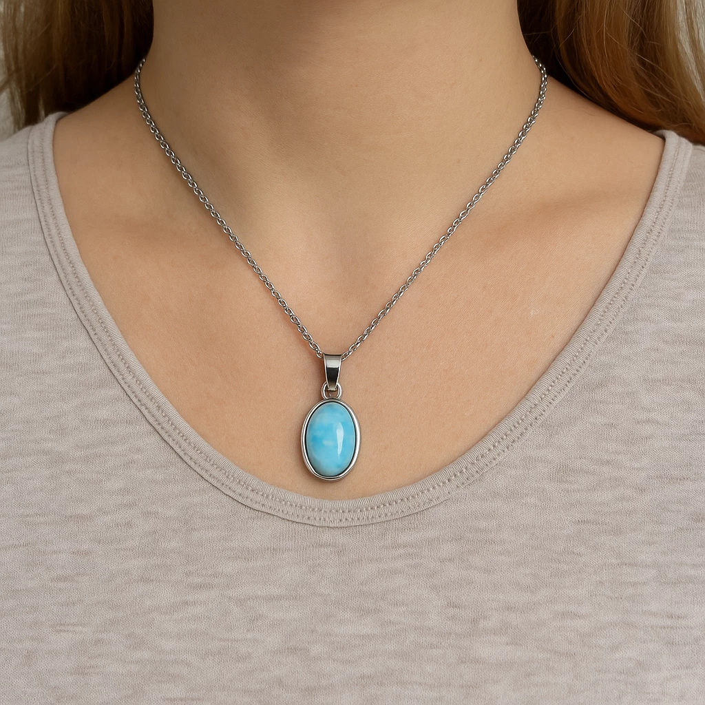 Larimar je považován za kámen klidu a harmonii, podporuje uvolnění, dobrou náladu a pomáhá oprostit se od každodenního stresu. Díky univerzálnímu designu se přívěsek skvěle hodí k tričku i elegantním šatům a krásně vynikne na jednoduchém stříbrném řetízku.