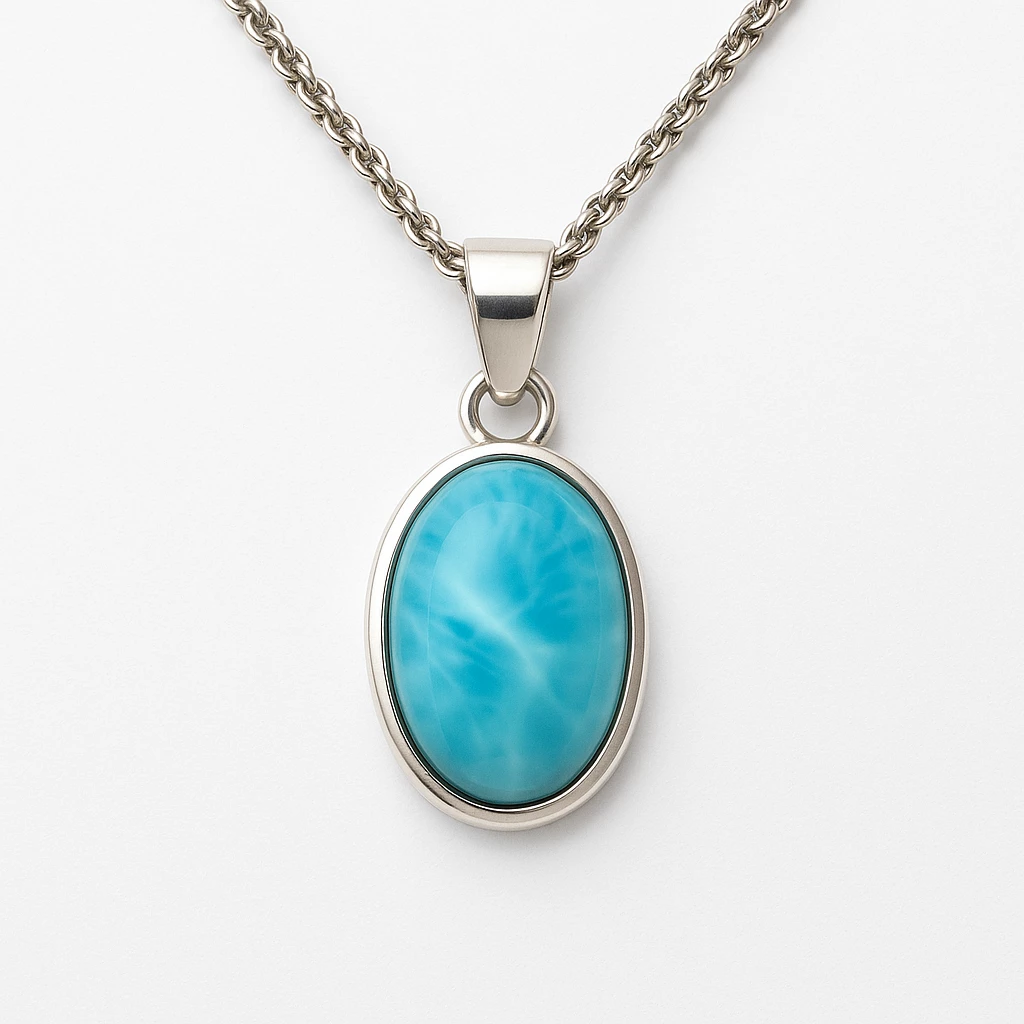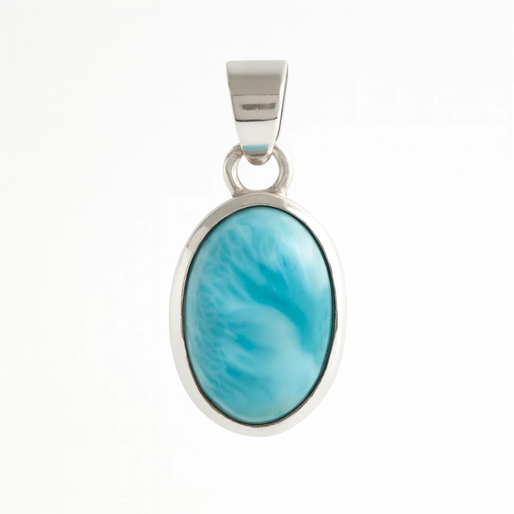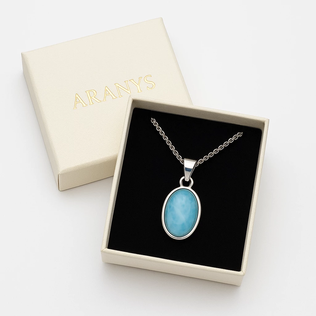 Objevte kouzlo larimaru – vzácného minerálu pocházejícího z Dominikánské republiky, jehož modrobílé kresby připomínají sluneční odlesky na moři. Tento stříbrný přívěsek s leštěným oválným larimarem je ideální volbou pro všechny, kdo milují originální a jemně nepřehlédnutelné šperky.