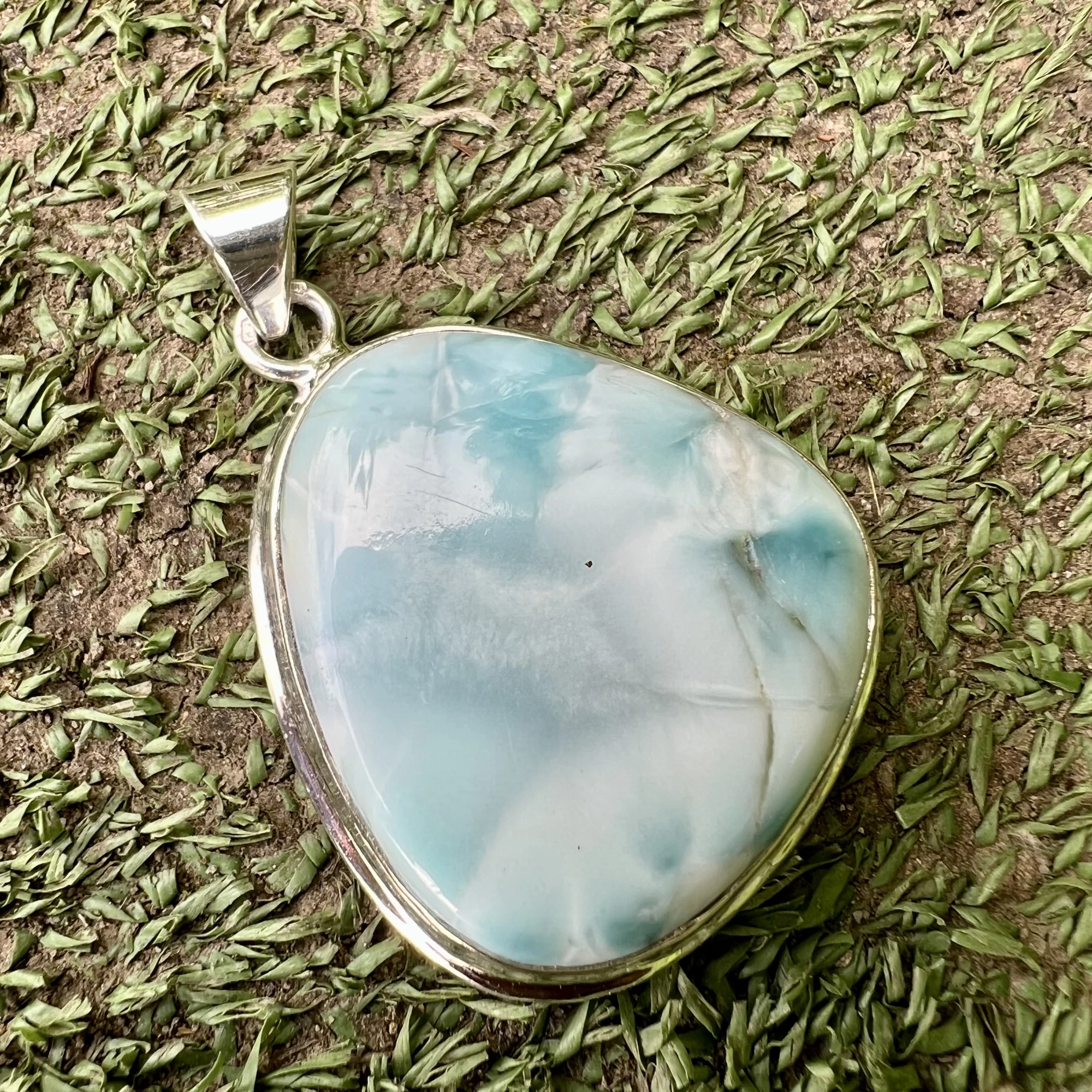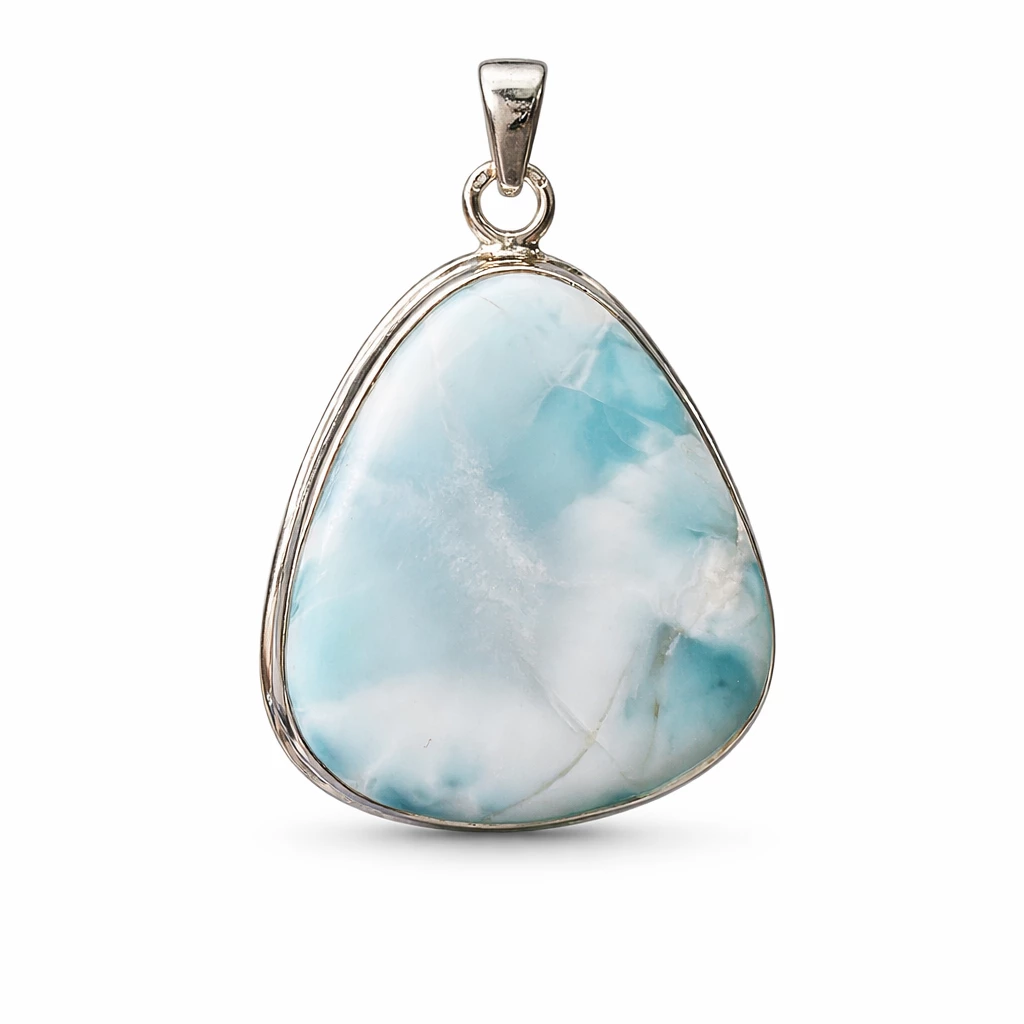 Stříbrný přívěsek s larimarem Veleina kapka okouzlí měkkými liniemi a přirozenou krásou minerálu. Jemný kapkovitý tvar podtrhuje ženský charakter šperku a dává vyniknout jedinečné kresbě larimaru.