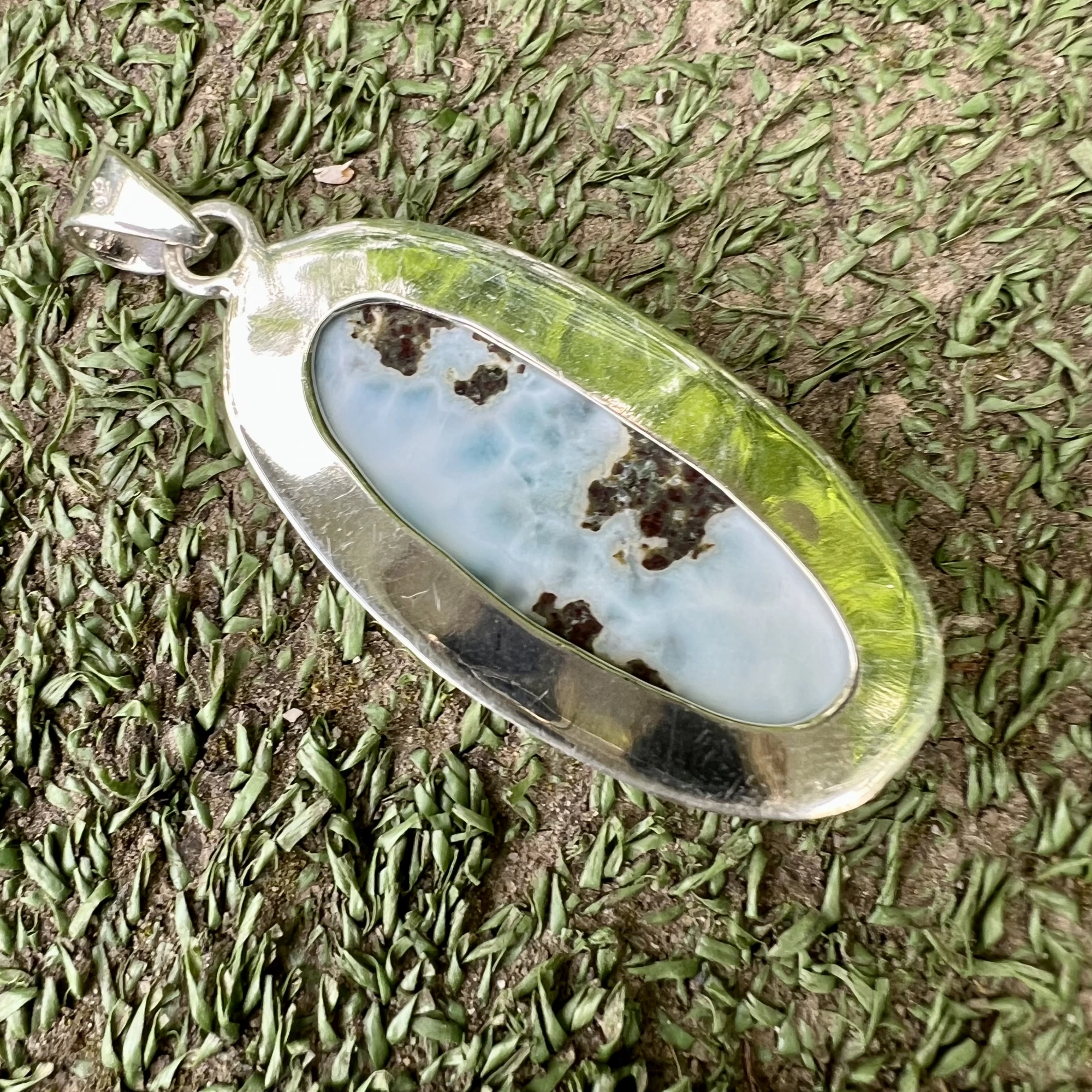 Stříbrný přívěsek s larimarem Veleina proud vyniká štíhlým, protáhlým tvarem, který působí lehce, elegantně a dynamicky. Každý kus je originál, jehož kresba připomíná plynoucí vodní hladinu.