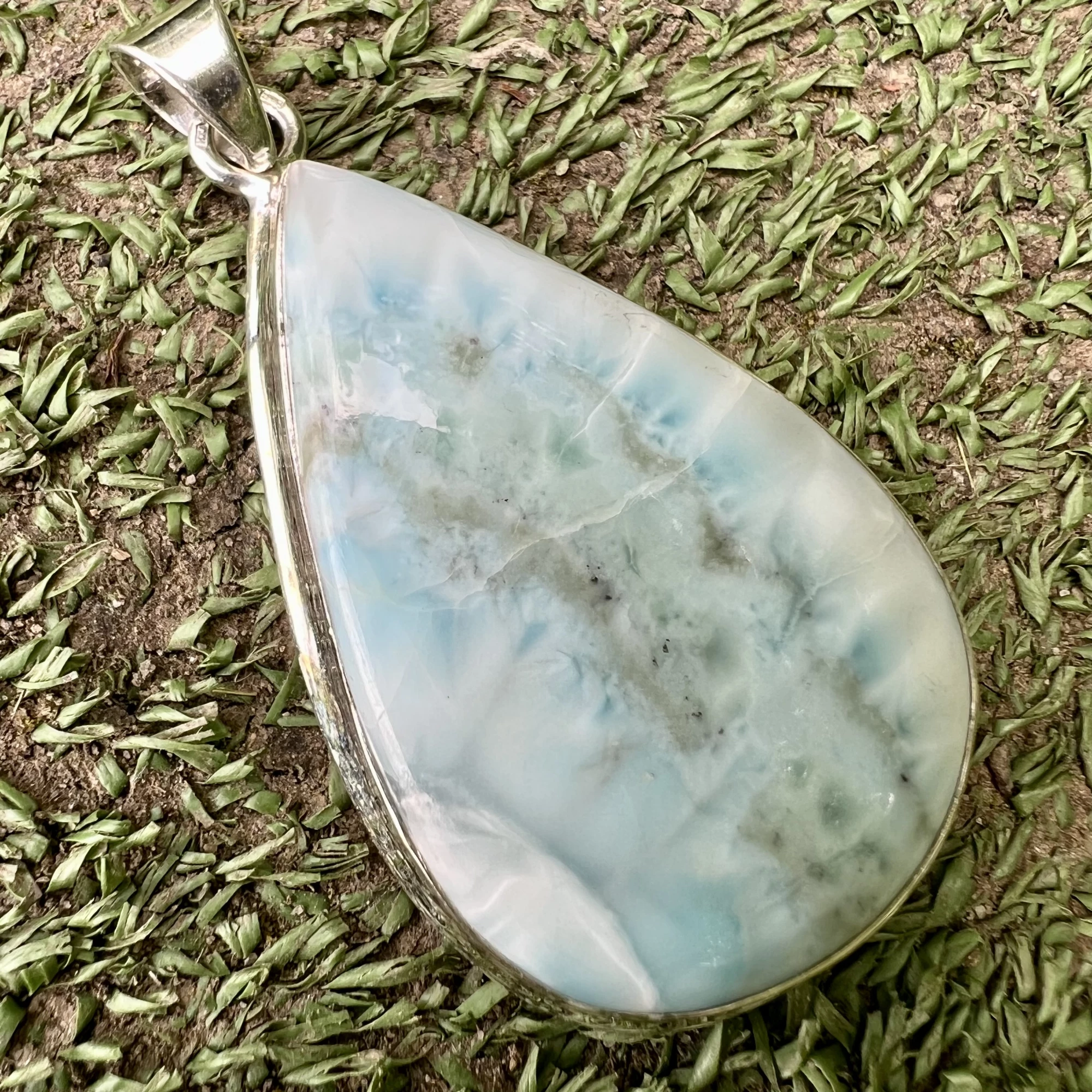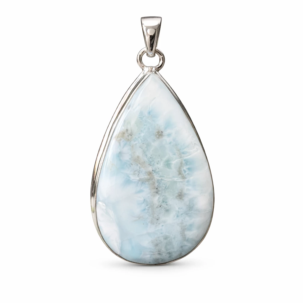 Stříbrný přívěsek s larimarem Veleina vlna zaujme přirozeně plynulým, organickým tvarem, který připomíná pohyb mořské vlny. Každý kus je originál s neopakovatelnou kresbou larimaru.