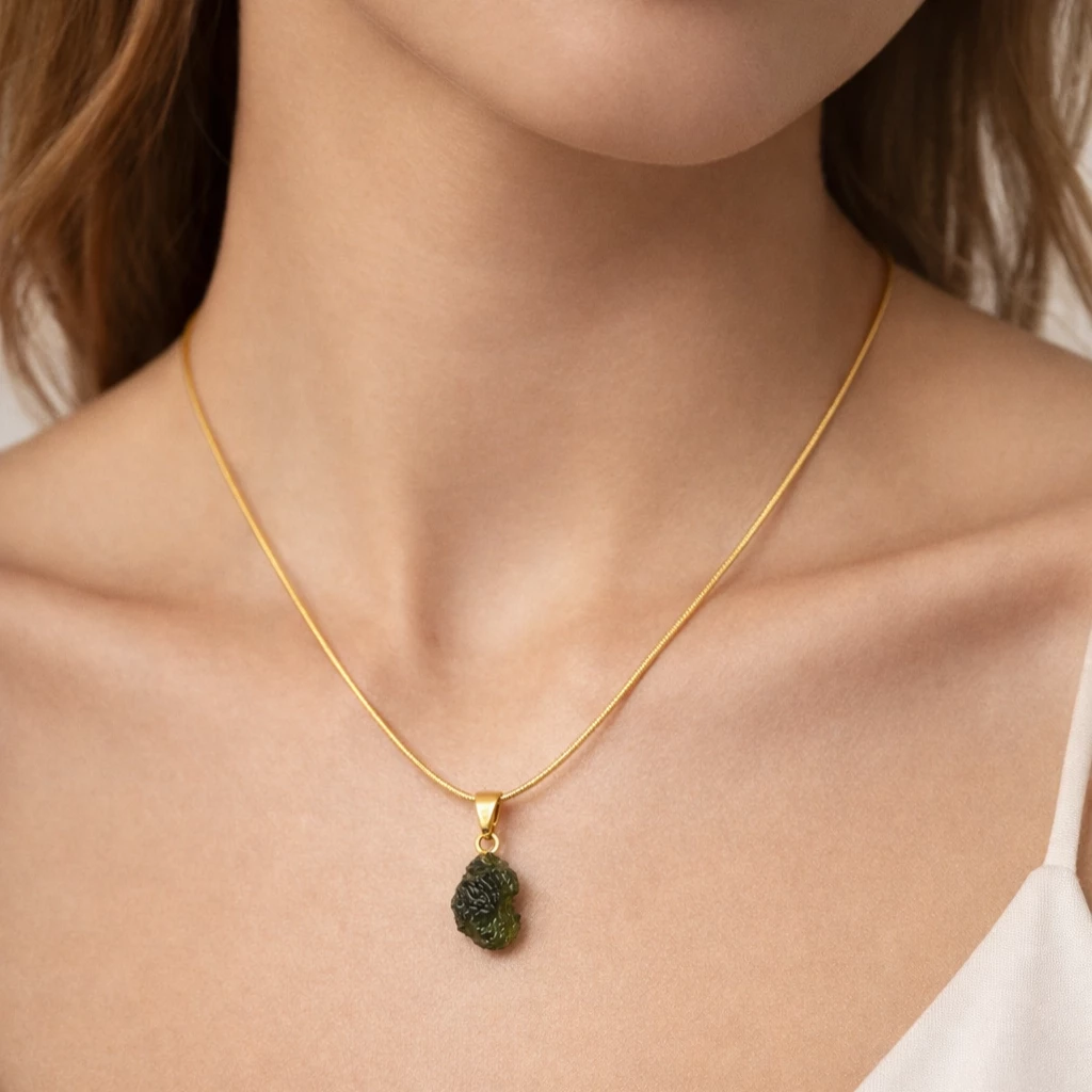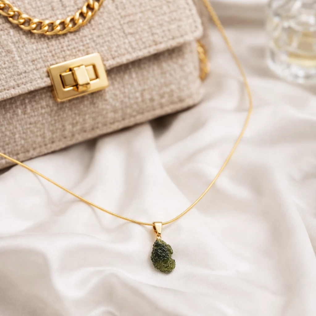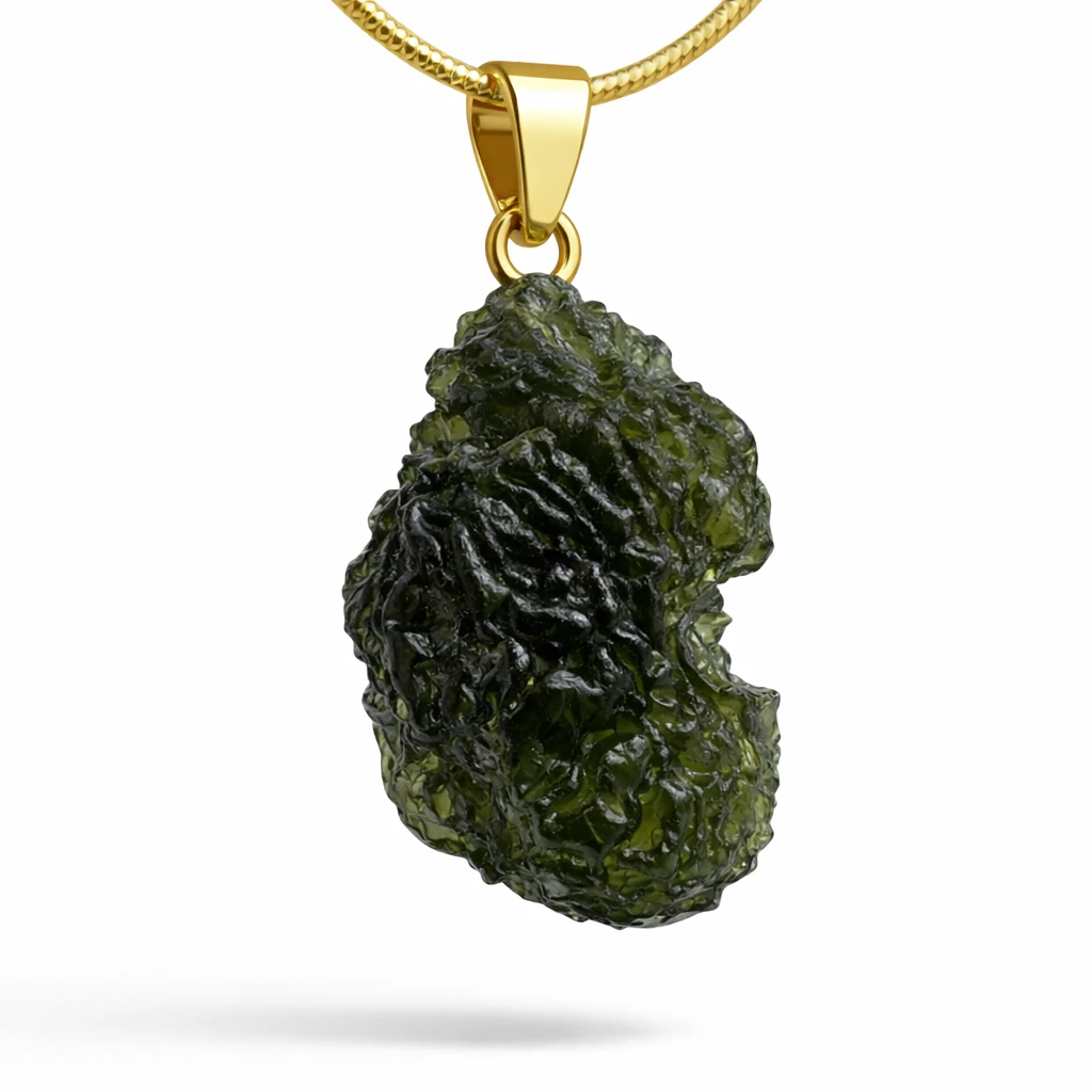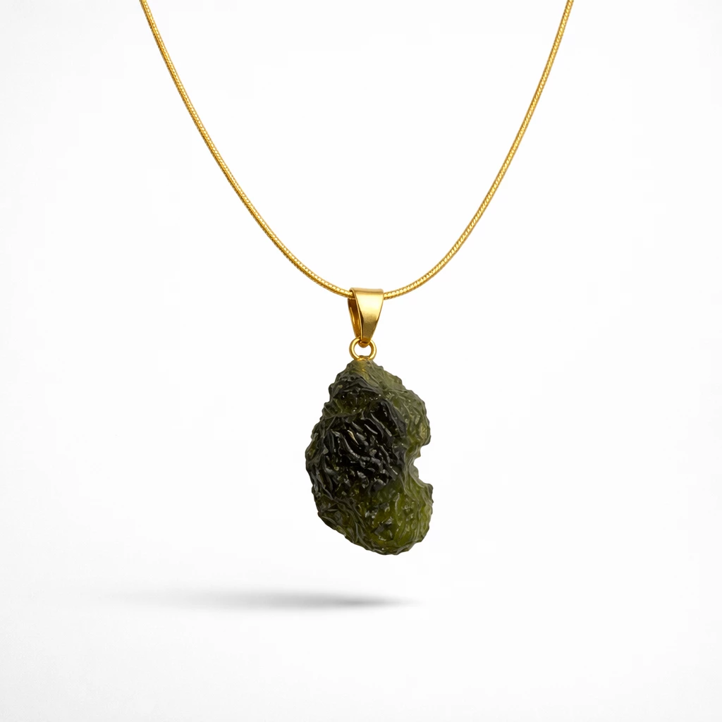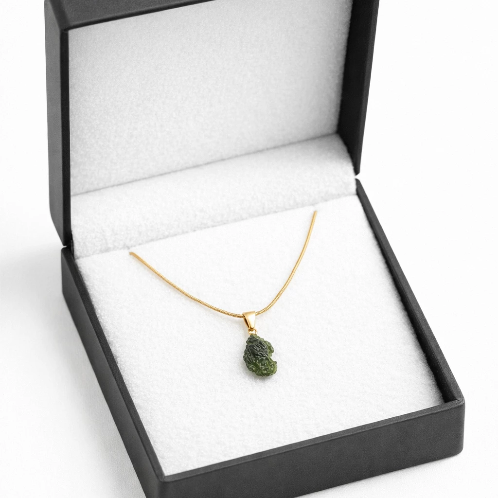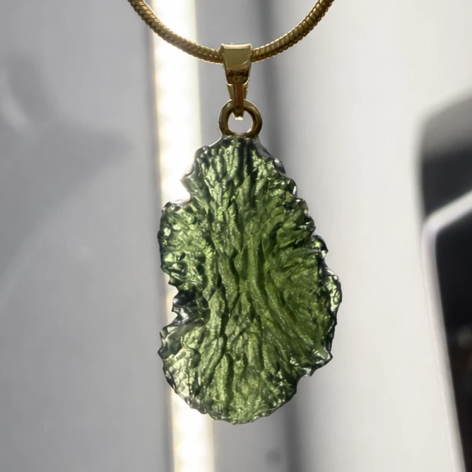 Luxusní stříbrný přívěsek s dominantním zeleným vltavínem. Tento broušený polodrahokam je umístěn ve středu přívěsku se skrytým ouškem pro zavěšení na řetízek. Samotný vltavínový přívěsek tak nic neruší a v dekoltu vypadá naprosto fantasticky. Přívěšek má skryté zadní očko pro navlečení na řetízek, ideální šíře max. 3 mm.