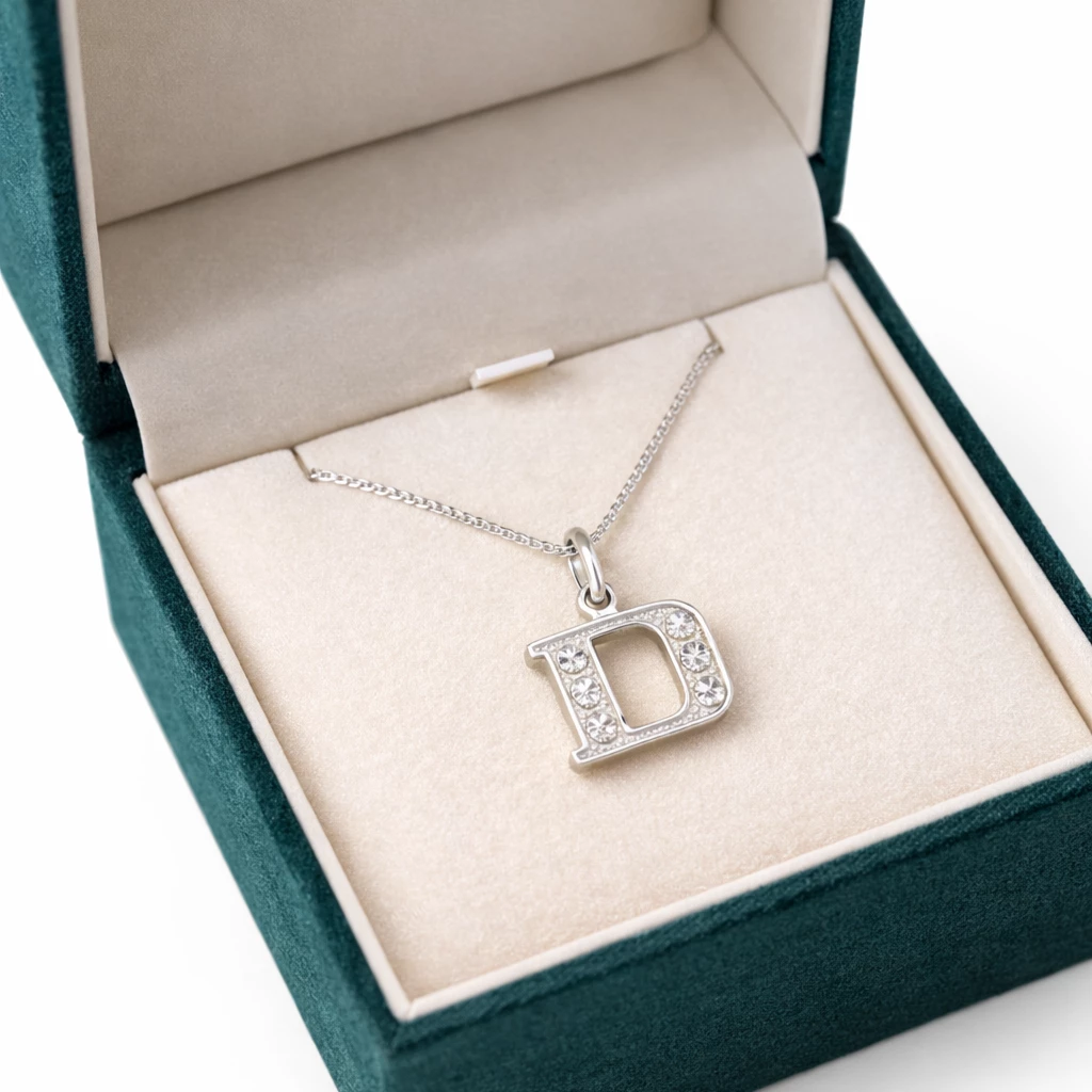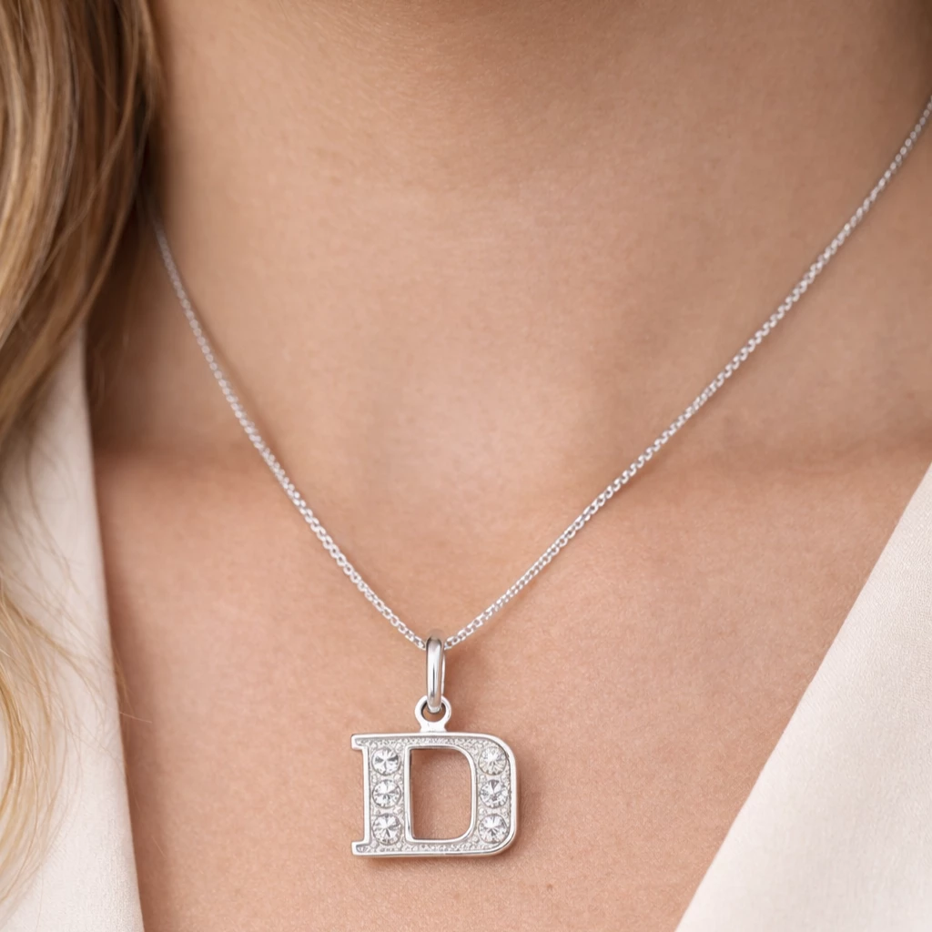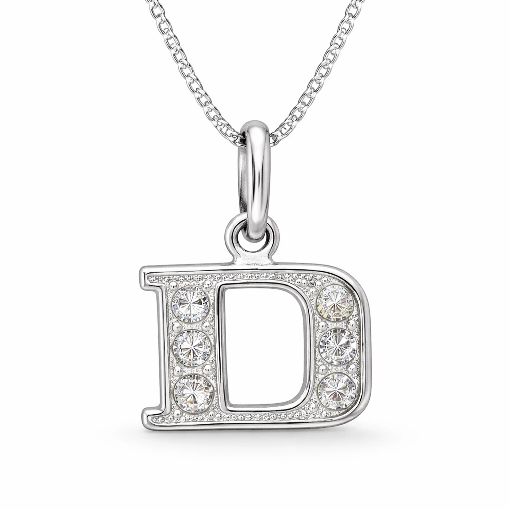 Stříbrný přívěsek písmena D, které je zdobené zirkony.