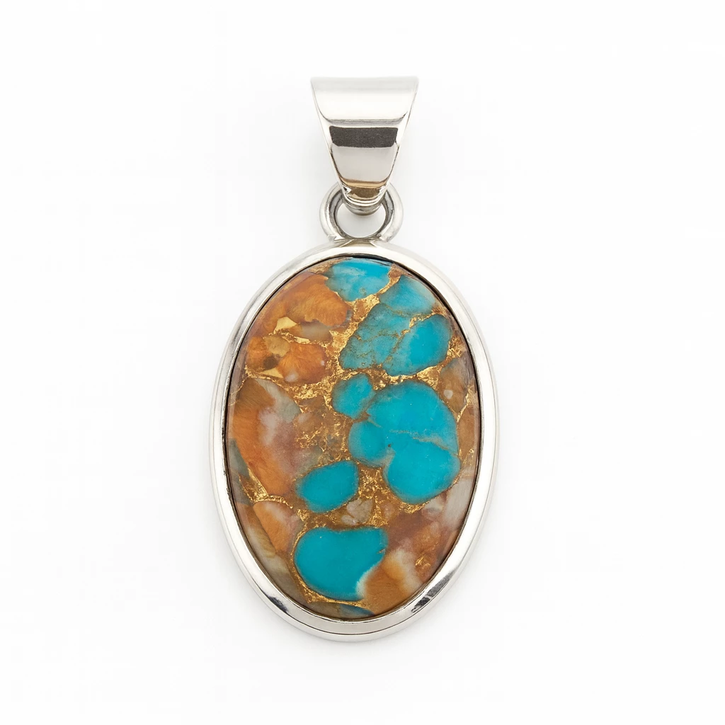Dokonalý jaspis, pyrit a tyrkys usazený v oválném stříbrném lůžku. Pořiďte si k přívěsku také řetízek.