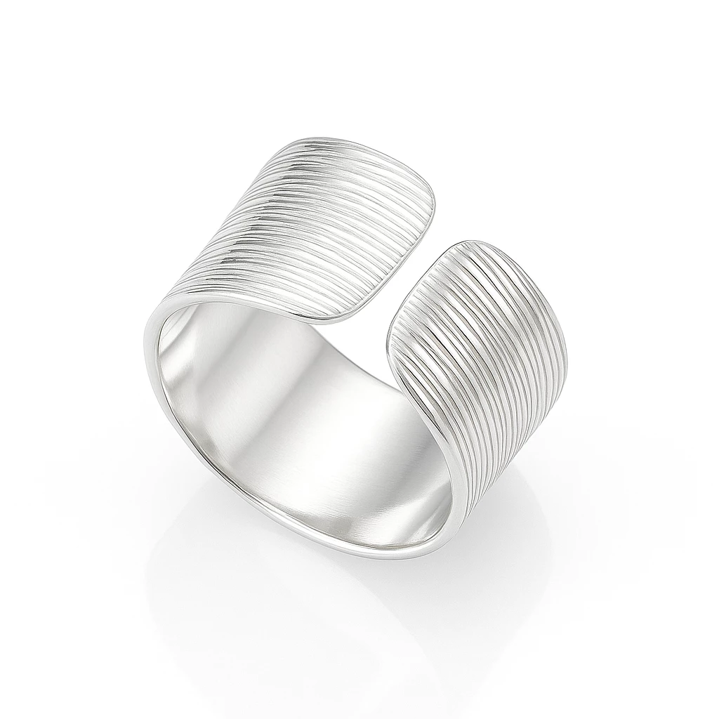 Designový stříbrný prsten LINEA z kvalitního stříbra 925/1000 zaujme svým širším nastavitelným páskem a pravidelným rýhováním, které dodává šperku luxusní lesk i hloubku. Díky otevřenému zakončení se prsten snadno přizpůsobí a pohodlně sedí na prstu.