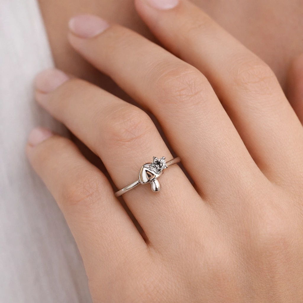Stříbrný prsten houbička se zirkonem Elaria je vyroben ze Stříbra Ag 925/1000 a opatřen rhodiovanou povrchovou úpravou, která zajišťuje vysoký lesk, ochranu proti zčernání a dlouhou životnost šperku. Hravý motiv houbičky doplněný třpytivým zirkonem dodává prstenu jedinečný a jemně magický vzhled.