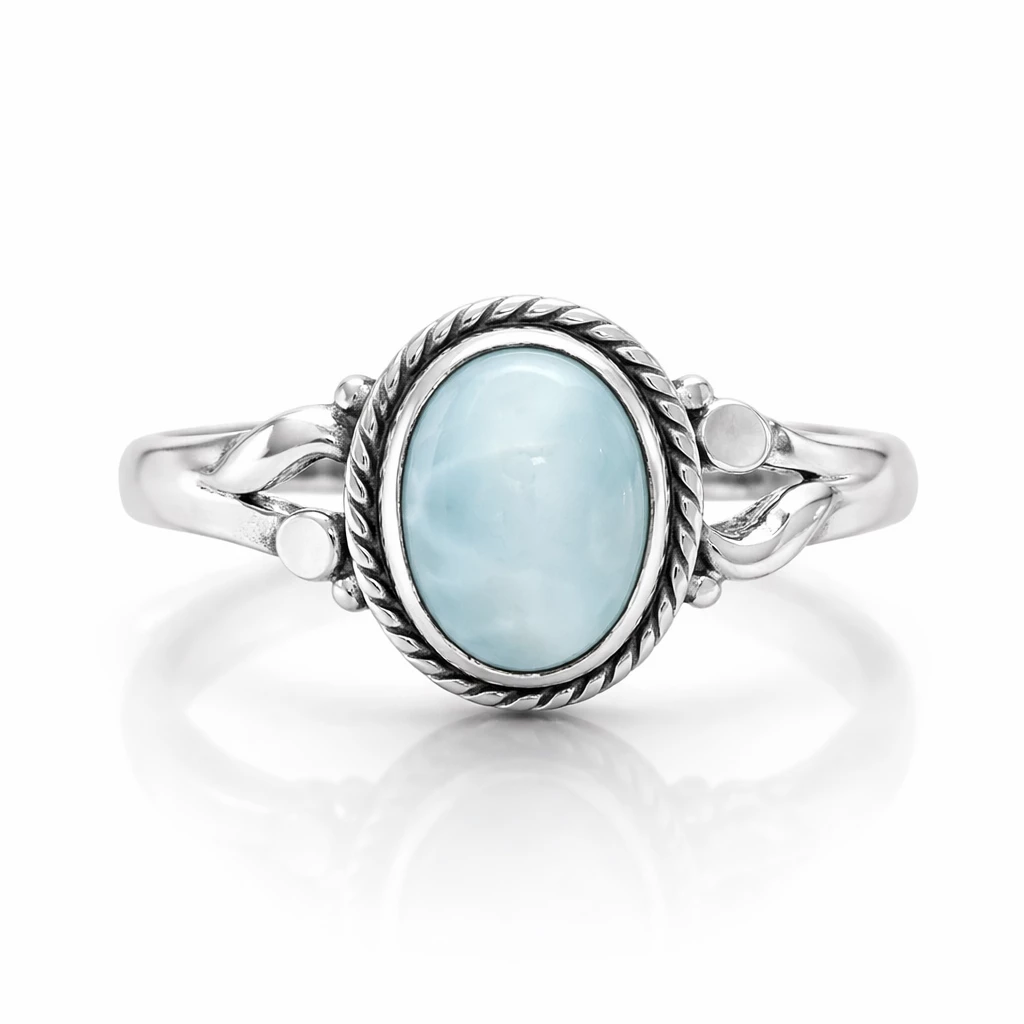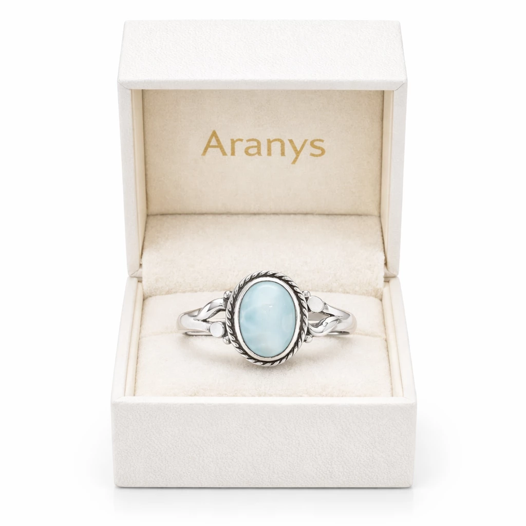 Prsten Laria je vyroben z kvalitního Stříbra Ag 925/1000 a osazen přírodním larimarem, jehož jemné modré odstíny připomínají klidnou mořskou hladinu. Oválný kámen je zasazen do dekorativní obruby, která dodává prstenu osobitý charakter a zvýrazňuje přirozenou krásu minerálu.