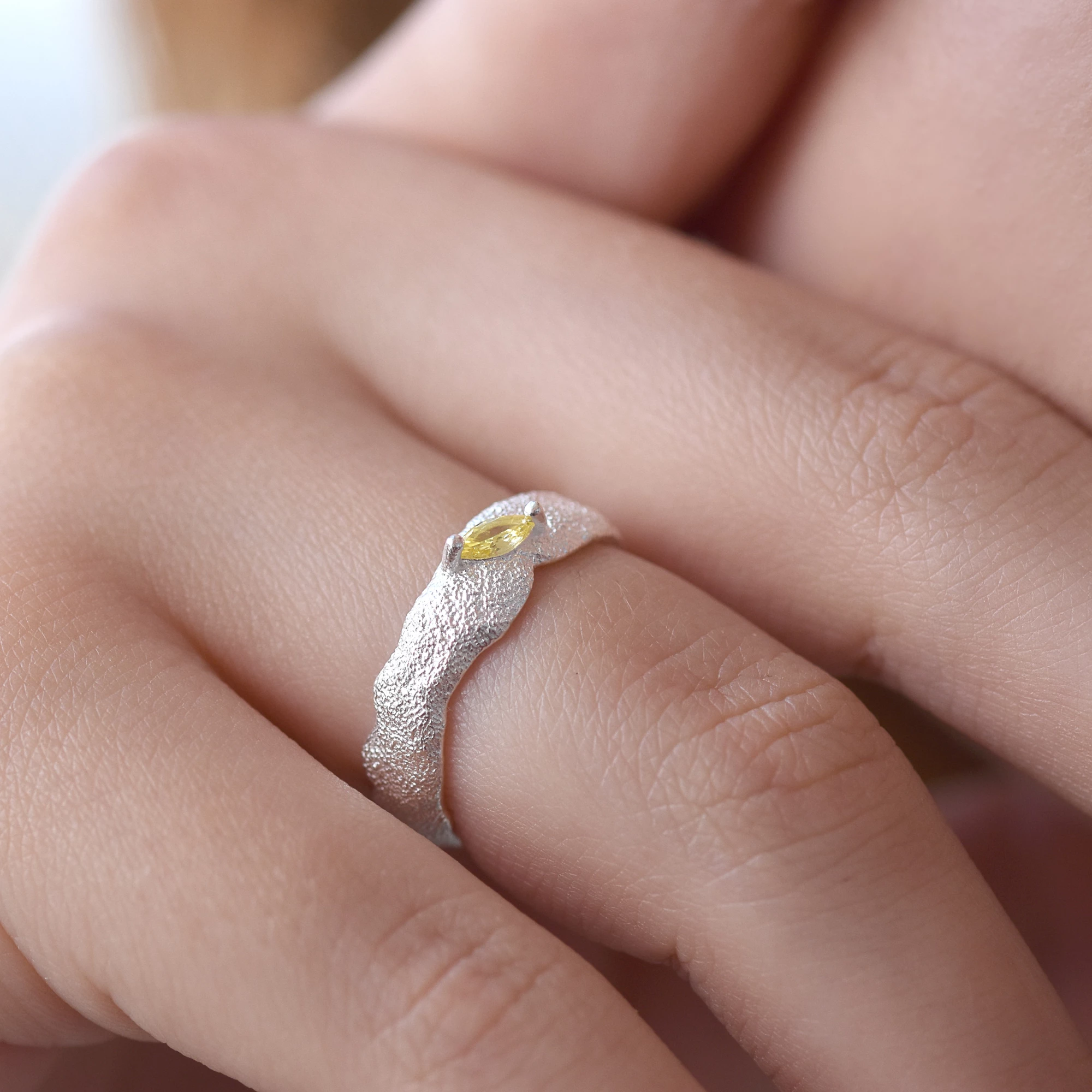 Stříbrný prsten se zubatým efektem je šperk, který okouzluje svou jedinečnou kombinací moderního designu a detailní řemeslné práce. Prstýnek je ozdoben žlutým zirkonem.