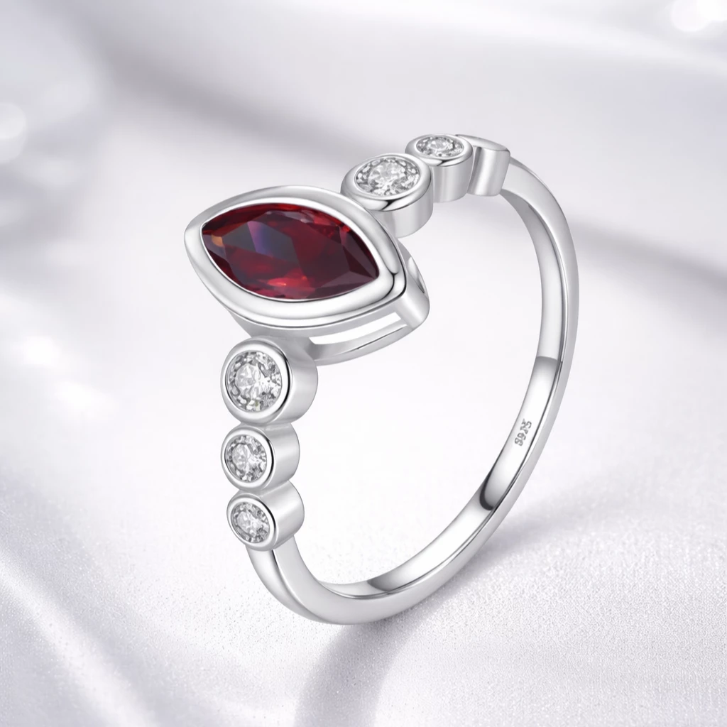 Krásný stříbrný prsten s rhodolitem a zirkony. Tento velmi slušivý prstýnek je novinkou na našem e-shopu.