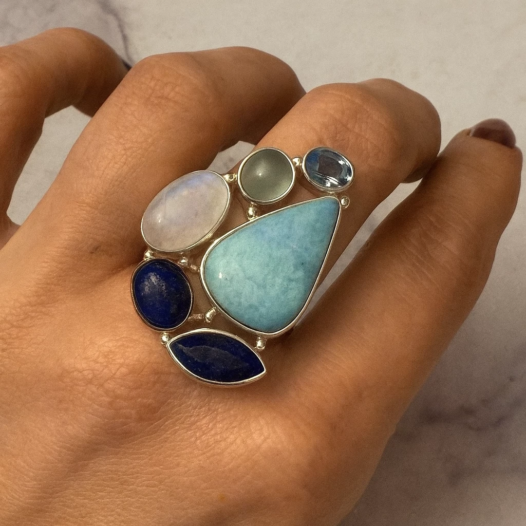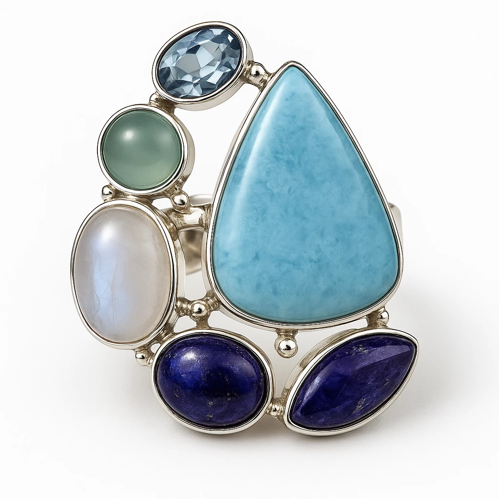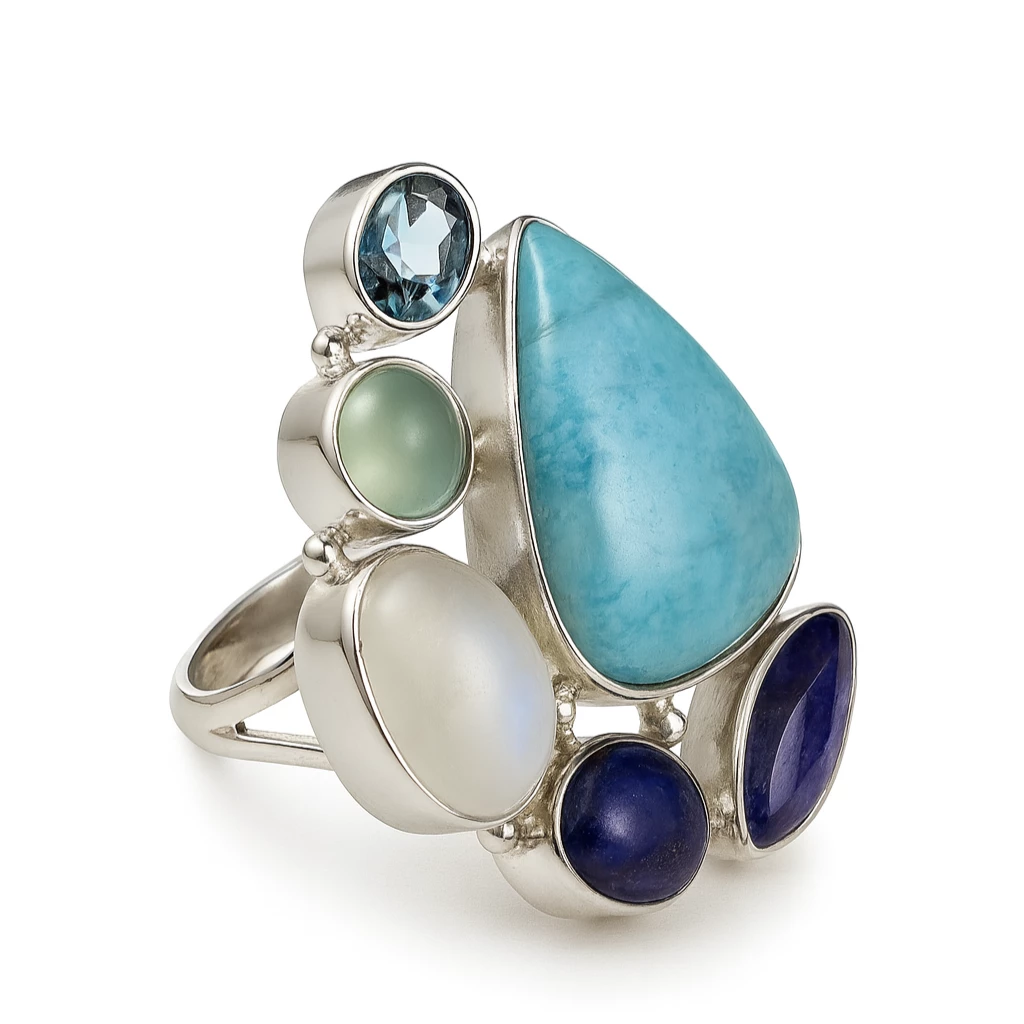 Jedinečný stříbrný dámský prsten s pravými minerály: Larimarem, měsíčním kámenem, Topazem a Lapisem Lazuli.