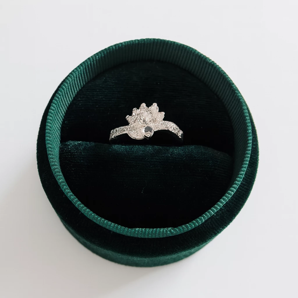 Stříbrný prsten, který zdobí korunka posázená zirkony.