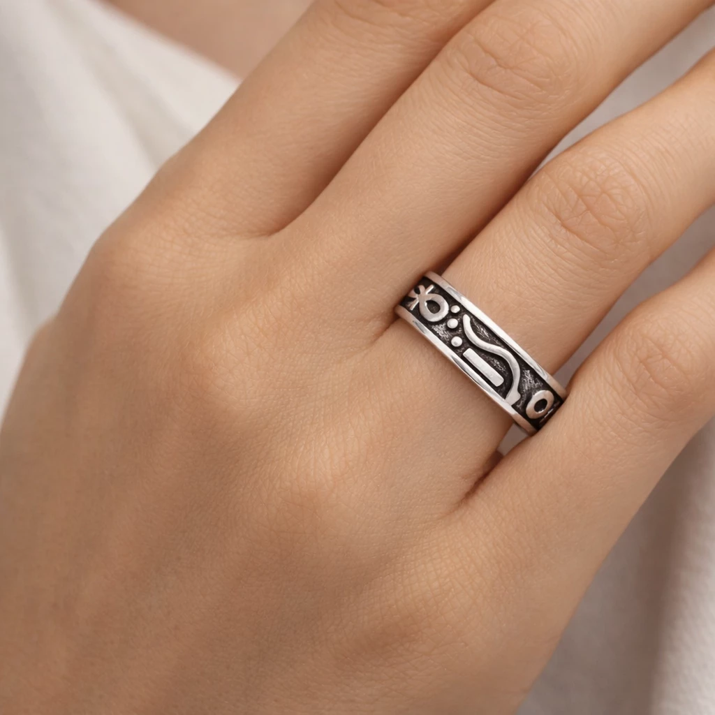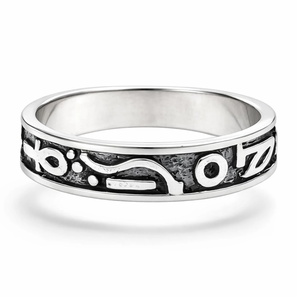 Stříbrný prsten Zerion je vyroben z kvalitního Stříbra Ag 925/1000 a zdoben výraznými rytými vzory, které jsou zvýrazněny patinou. Ta dodává prstenu hloubku a podtrhuje jeho jedinečný charakter inspirovaný symbolickými ornamenty.