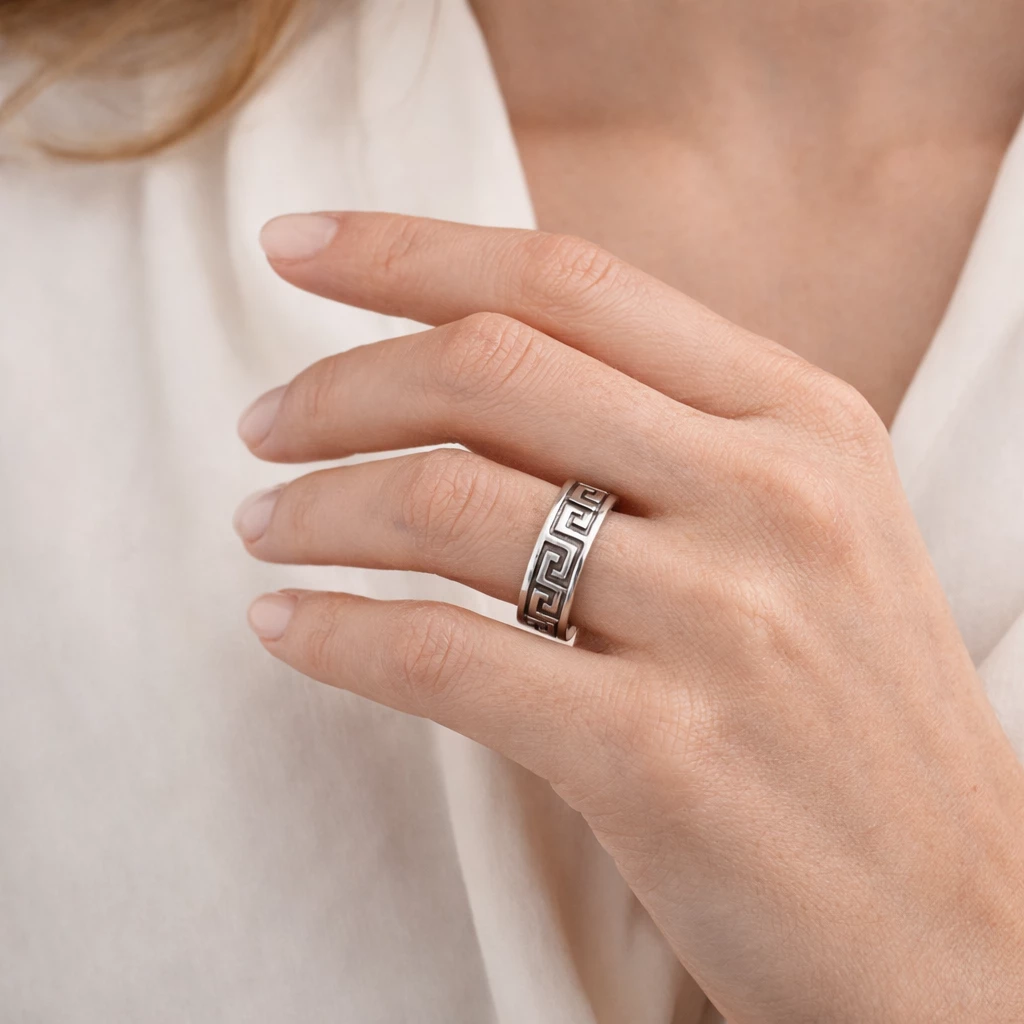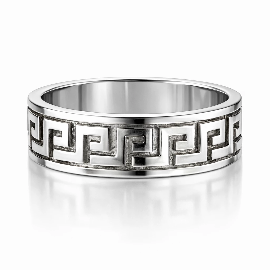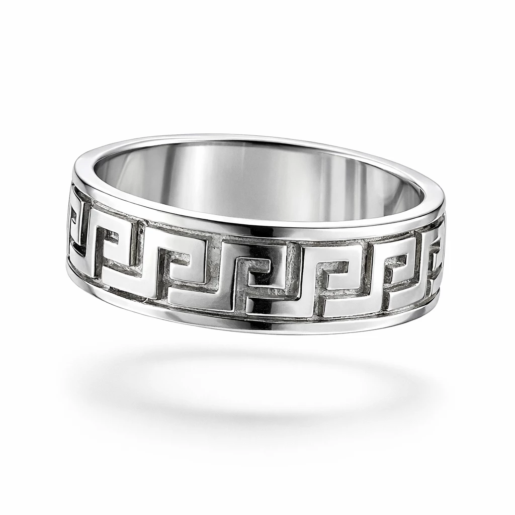 Stříbrný prsten s meandrovým vzorem Helios je výrazný šperk inspirovaný tradičním ornamentem, který symbolizuje nekonečno, kontinuitu a sílu. Geometrický meandrový vzor dodává prstenu charakter a nadčasovou eleganci.