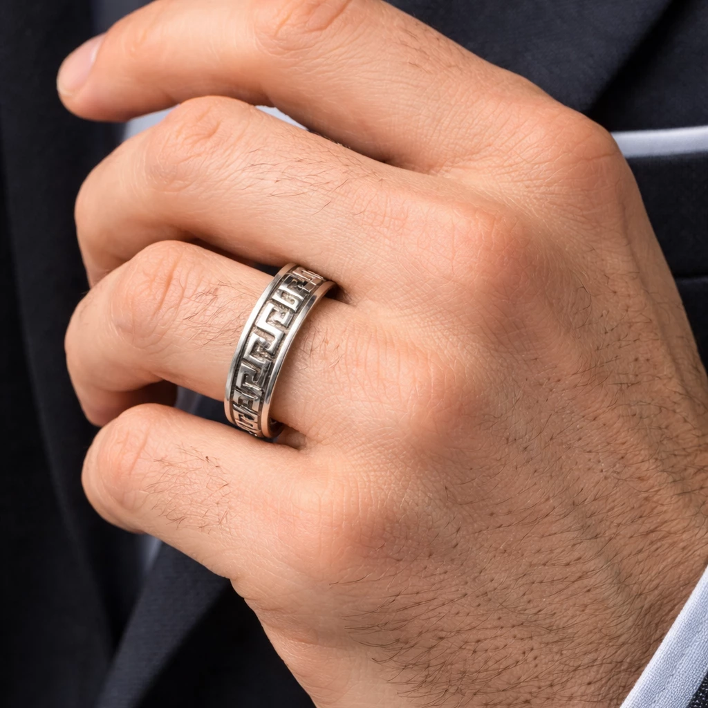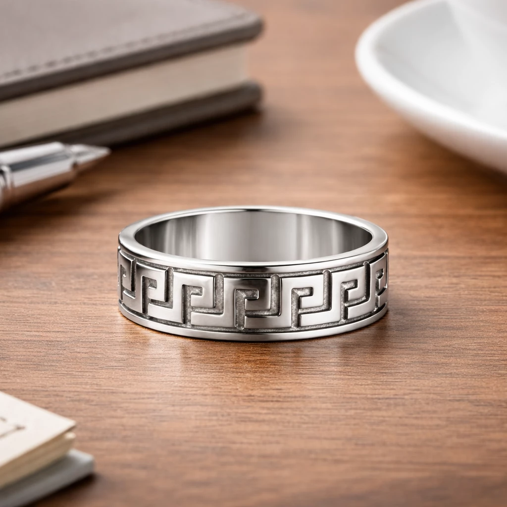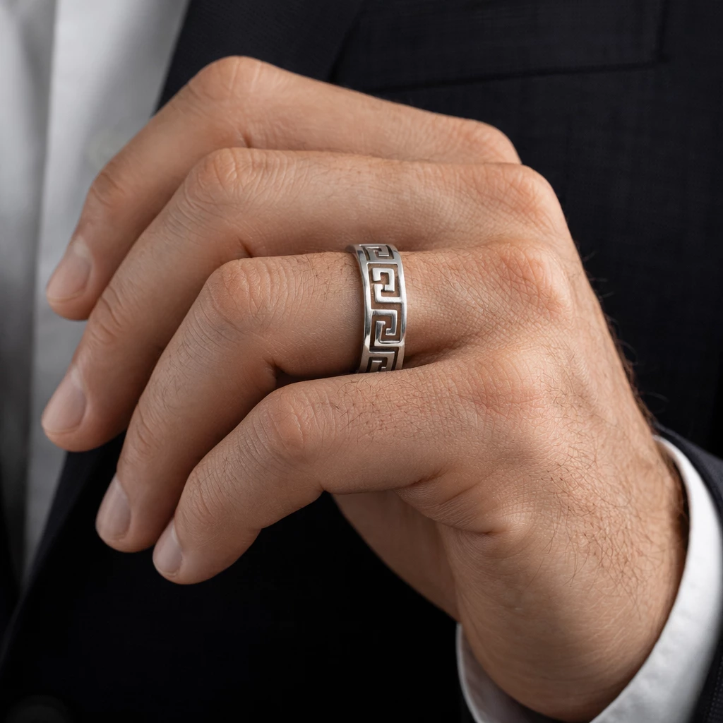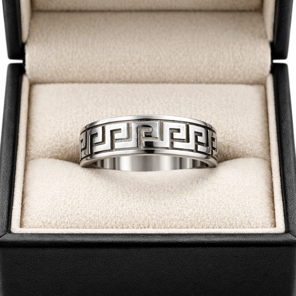 Stříbrný prsten s meandrovým vzorem Helios je výrazný šperk inspirovaný tradičním ornamentem, který symbolizuje nekonečno, kontinuitu a sílu. Geometrický meandrový vzor dodává prstenu charakter a nadčasovou eleganci.