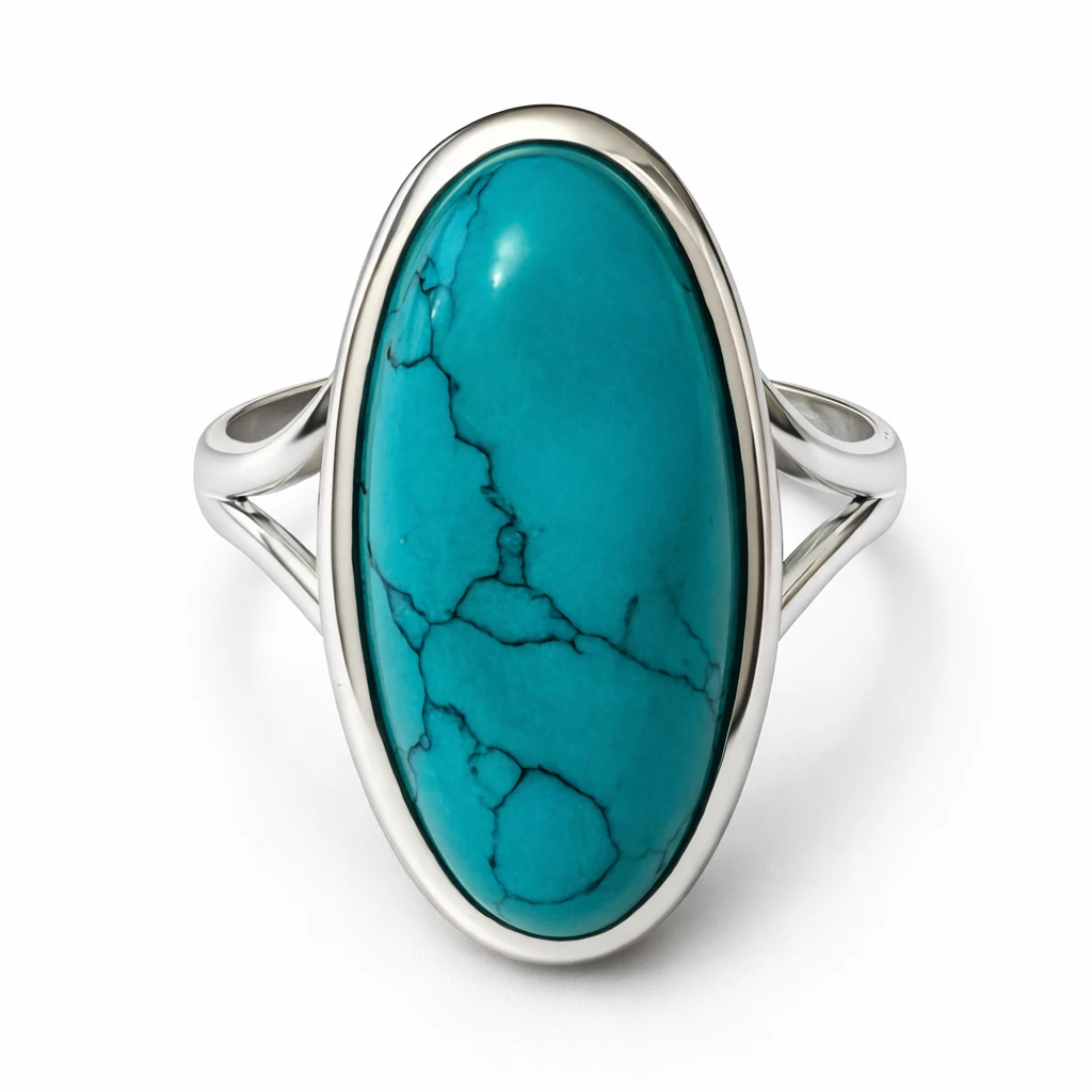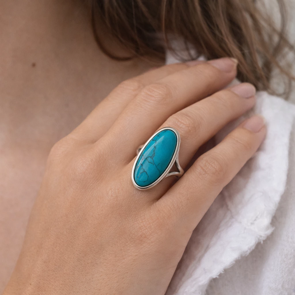 Elegantní stříbrný prsten s přírodním tyrkysem v oválném tvaru zaujme svou výraznou barvou a nadčasovým designem. Tyrkys je symbolem komunikace, pravdy a vnitřní harmonie.