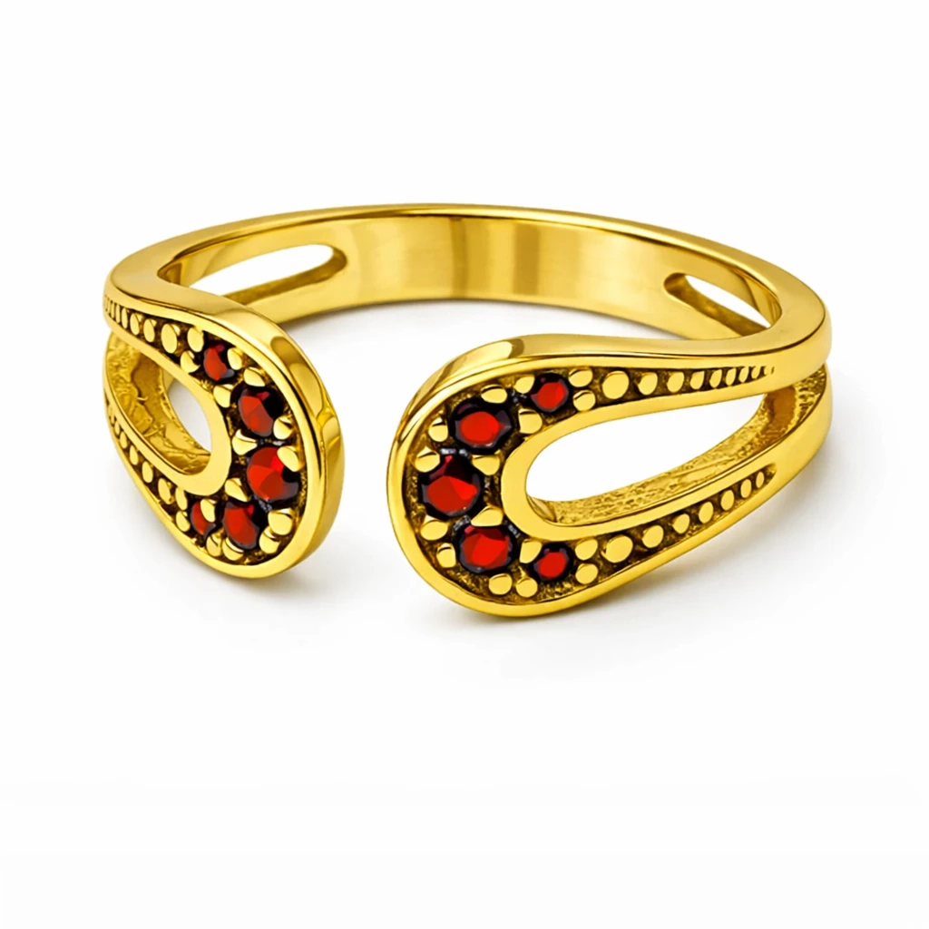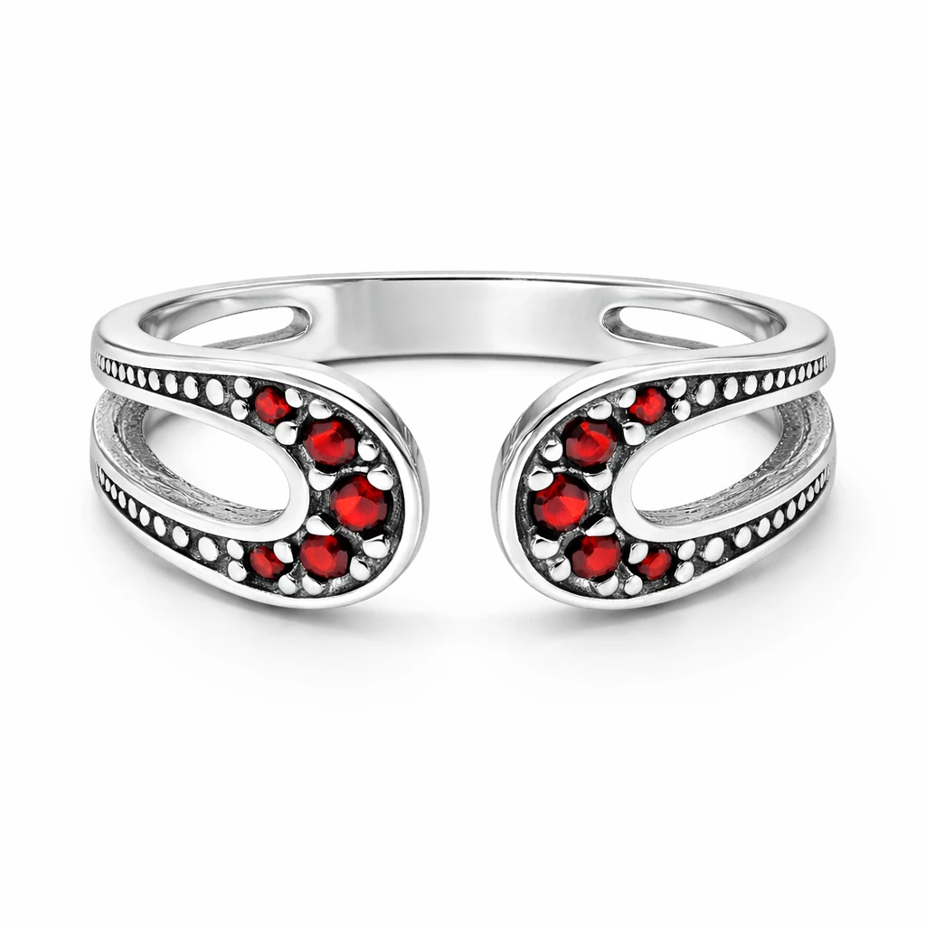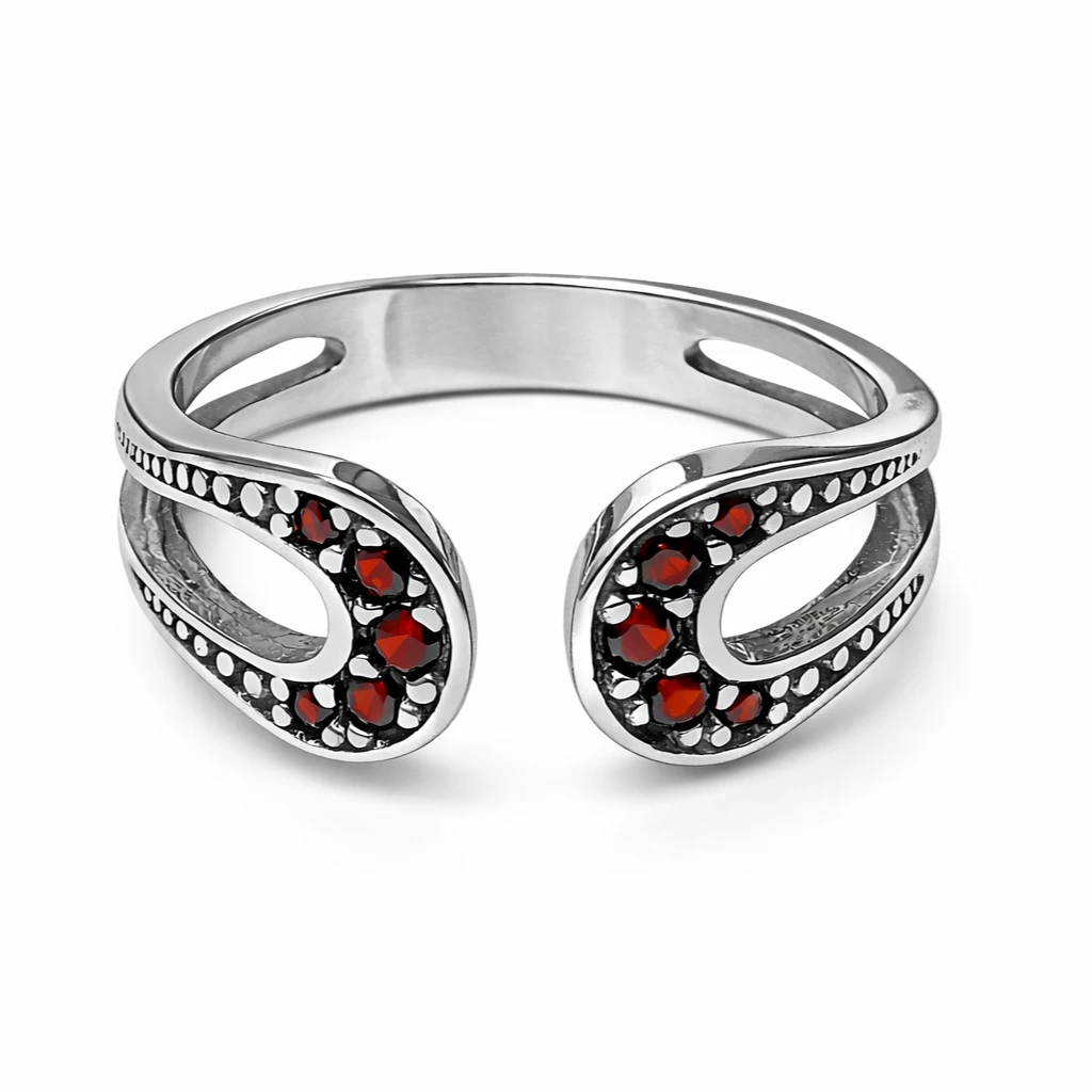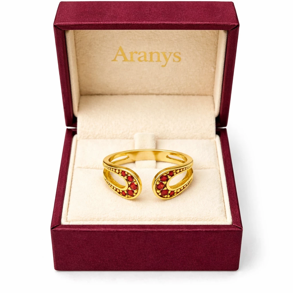 Stříbrný roztahovací prsten Granátové objetí je autorský šperk z dílny Aranys, vyrobený ze Stříbra Ag 925/1000 a zdobený českým granátem. Jemný otevřený tvar vytváří elegantní linii a zároveň umožňuje pohodlné přizpůsobení velikosti, takže se prsten krásně přizpůsobí ruce a je ideální pro každodenní nošení.